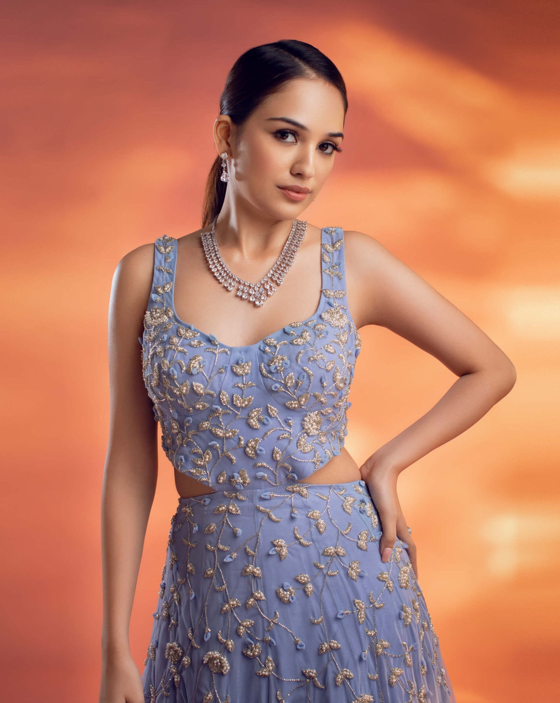 Embrace timeless elegance with our blue gown featuring a chic waist cut that adds a modern touch to its classic design. This stunning gown is embellished with an intricate array of glass beads and lustrous pearls meticulously set on a delicate net base. The result is a sophisticated interplay of textures and shimmer that enhances the gown’s graceful silhouette. Ideal for making a refined statement at any elegant event this piece seamlessly combines contemporary flair with timeless beauty.