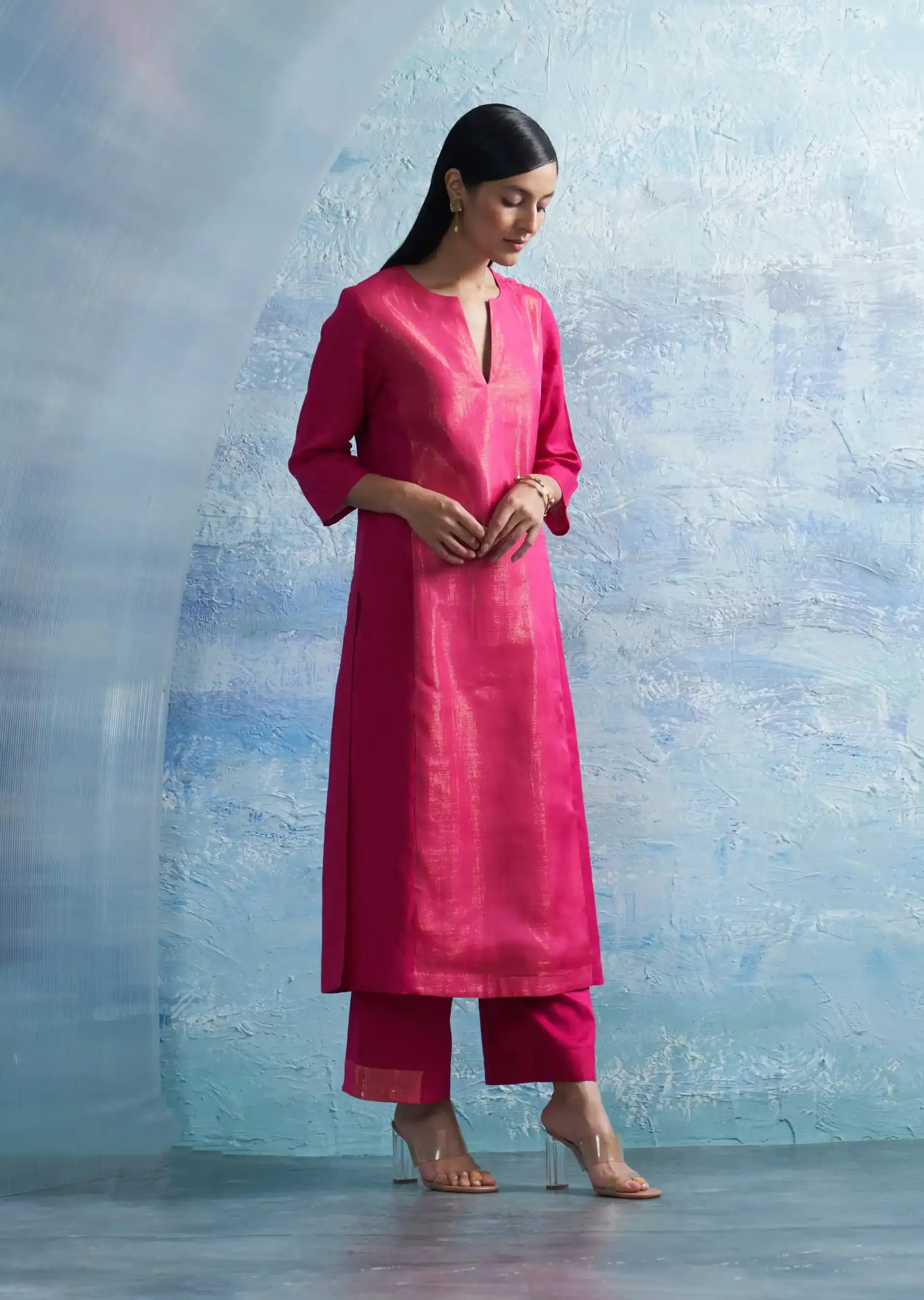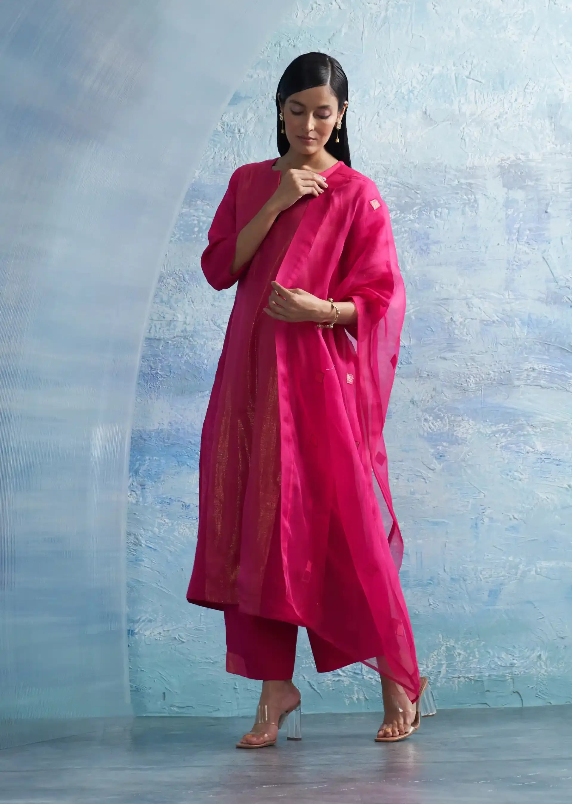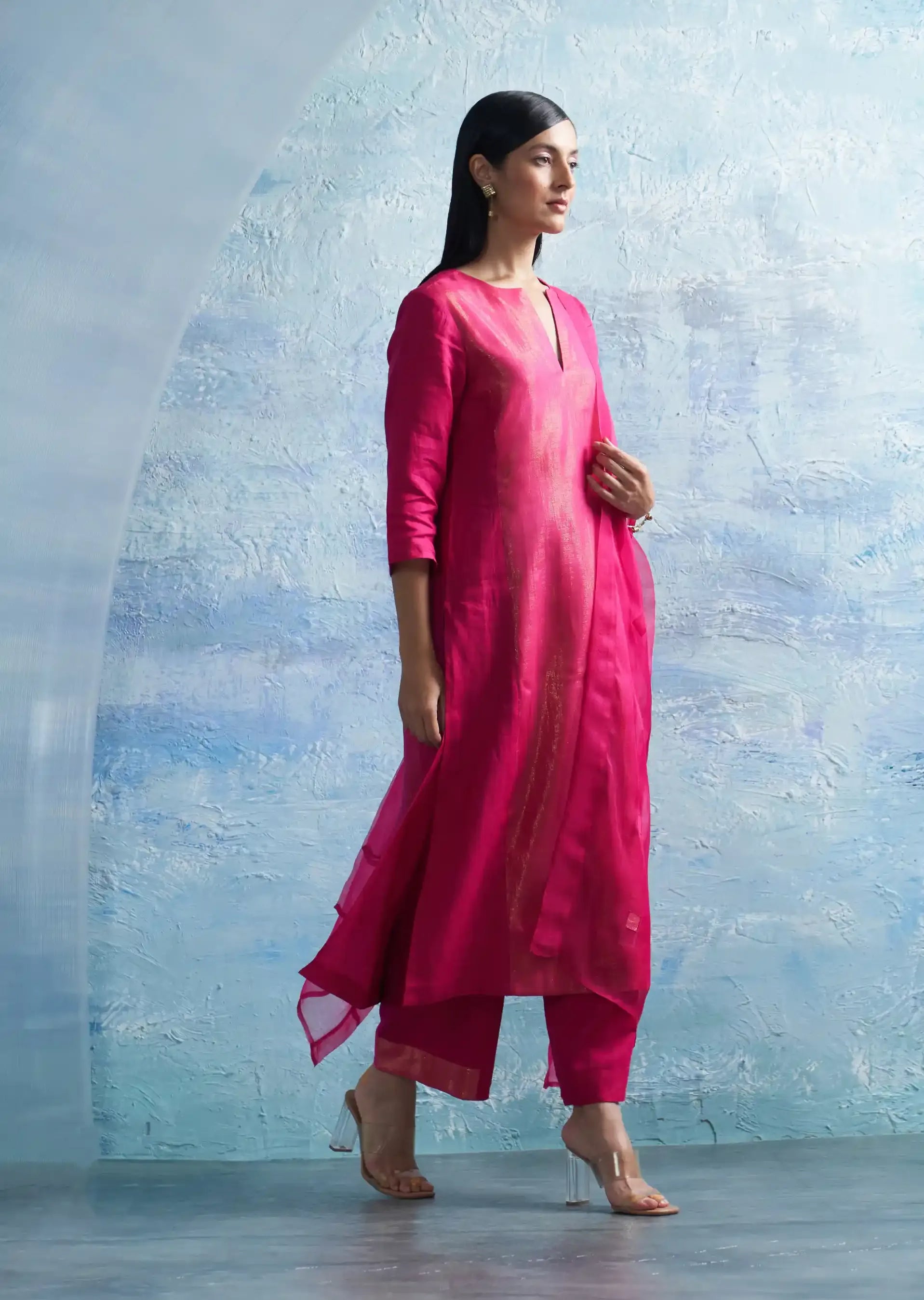 Achieve the ultimate festive allure with our Aura fuchsia notch neck kurta set. Crafted from premium linen, it exudes understated elegance, accentuated by a subtle shimmer effect. The crisp neckline and A-line silhouette ensure a flattering fit for every body type, adding a touch of refinement to your look. Paired with straight palazzo pants, this ensemble epitomizes sophistication, making it the perfect choice for any upscale occasion. The sheer organza dupatta, adorned with meticulous patchwork and delicate hand embroidery, enhances the overall elegance, making this set an ideal pick for any classy event. The pants feature an elasticated waistband and a drawstring for a comfortable, adjustable fit.