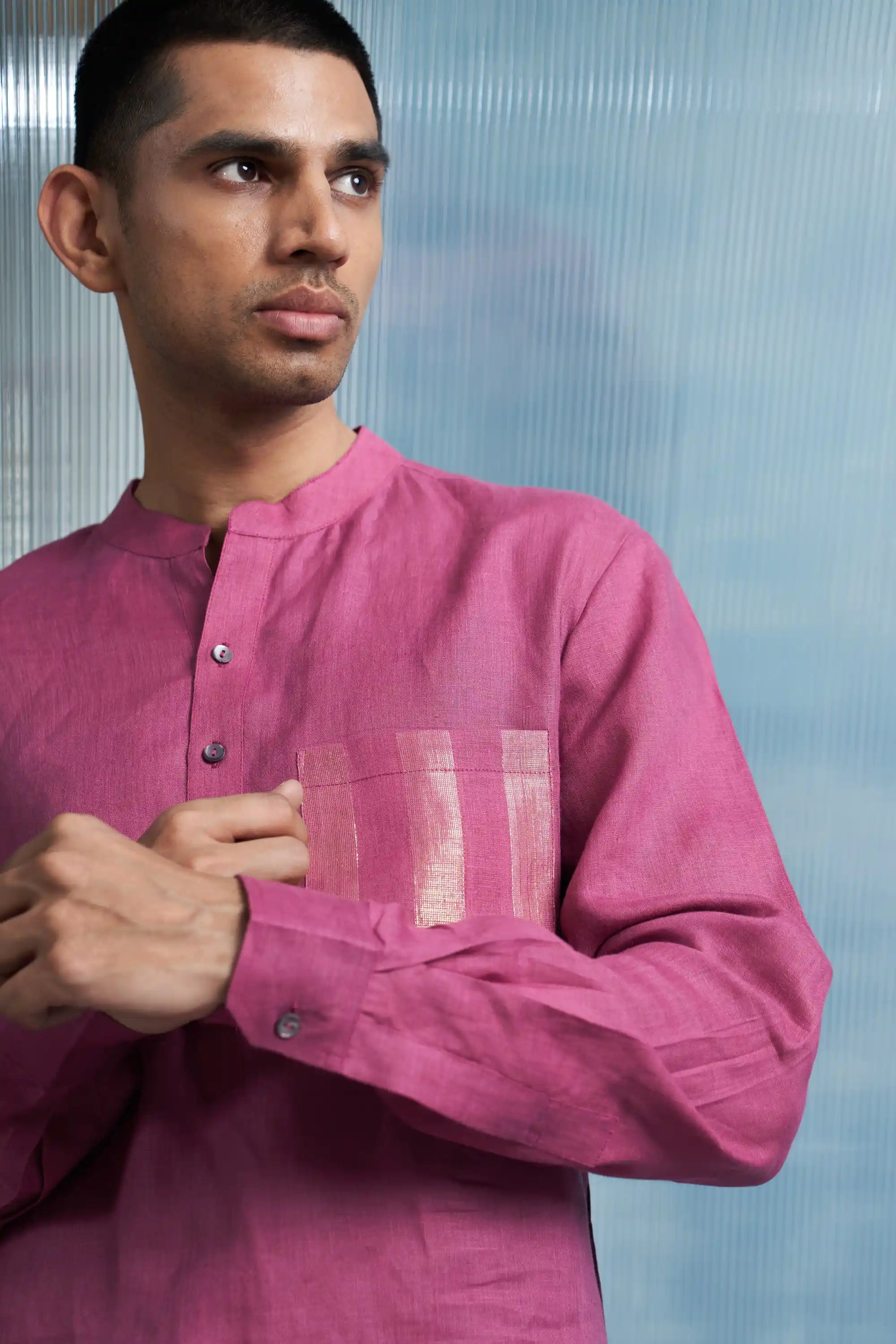 Indulge in elegance with our classic straight kurta, crafted in standout grape pink linen—a striking addition to our Aura collection. This exceptional kurta features delicate hints of shimmer on the pocket, elevating its timeless charm with a touch of refinement. Paired with a cotton satin salwar for a traditional look, or styled with classic straight pants for versatility, this ensemble is perfect for any occasion. Embrace sophistication and style with this exquisite piece that effortlessly enhances your wardrobe.