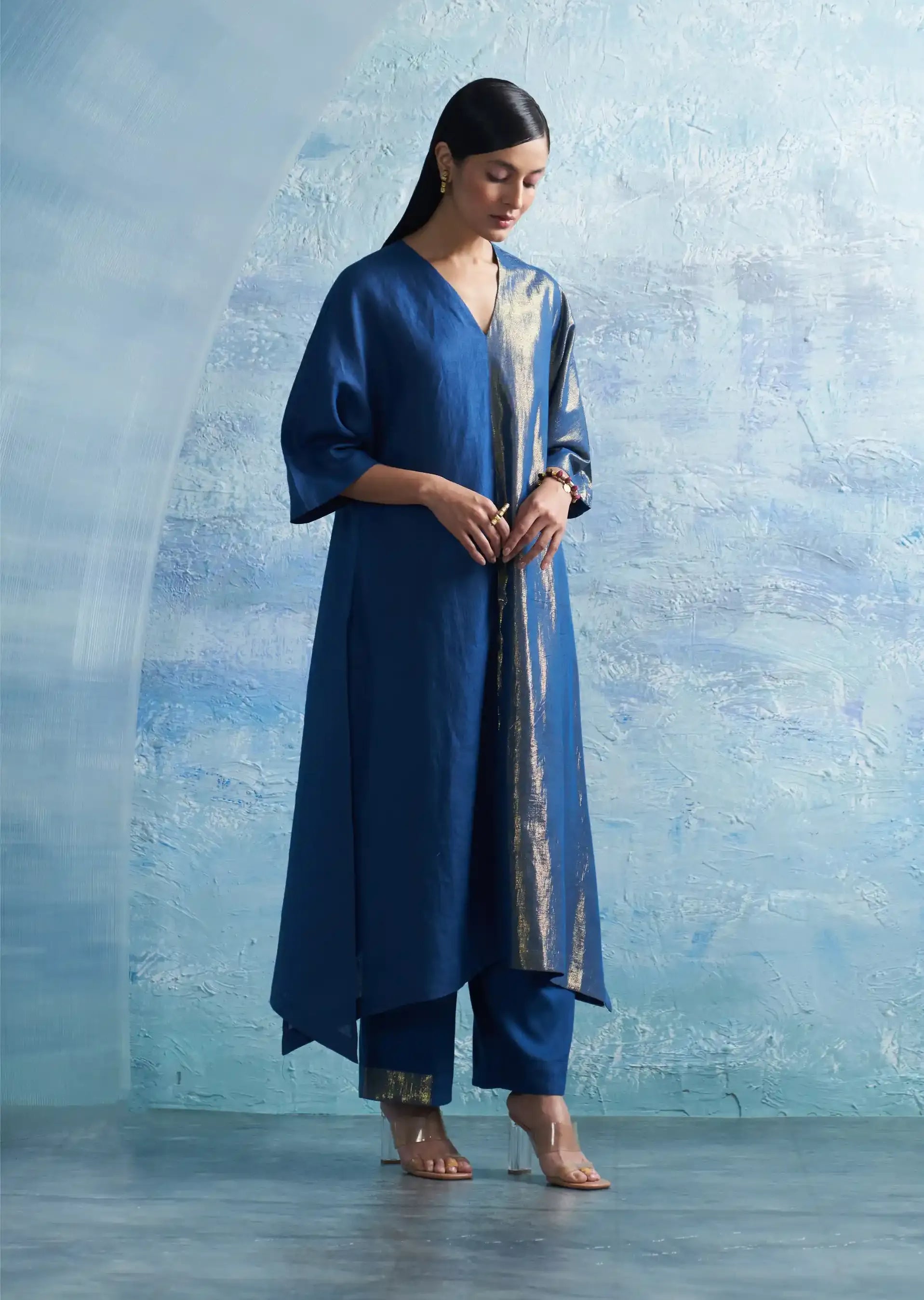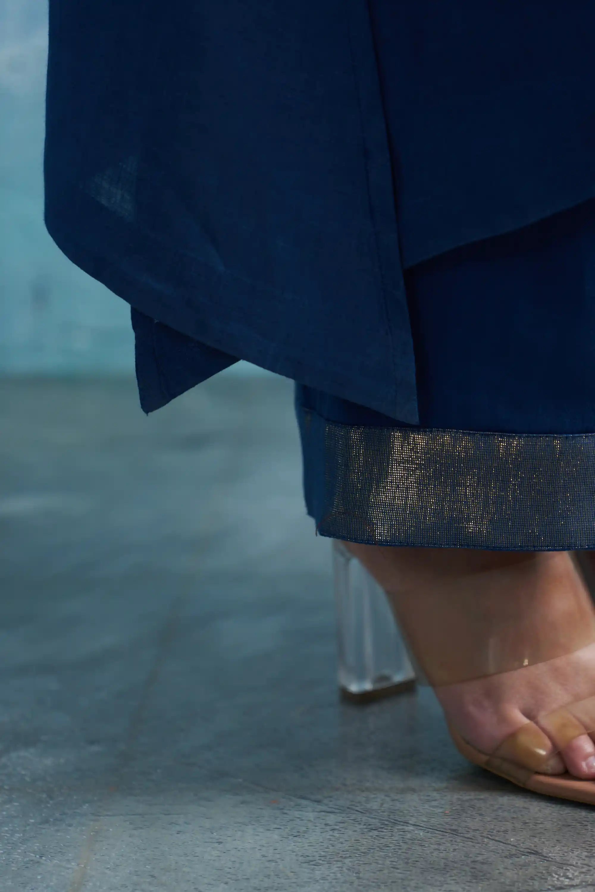 Step into a realm of elegance with this exquisite kurta set, beautifully crafted from a premium blend of linen and cotton shimmer. Its timeless silhouette features a flowy design that exudes chic sophistication, while the subtle allure of linen pairs effortlessly with the refined shimmer, creating a captivating interplay that enchants the eye. Complemented by comfortable, elasticated cotton satin pants with a drawstring, this ensemble ensures both style and ease. The look is completed with a sheer organza dupatta, adding an ethereal touch to your wardrobe that is perfect for any occasion.
