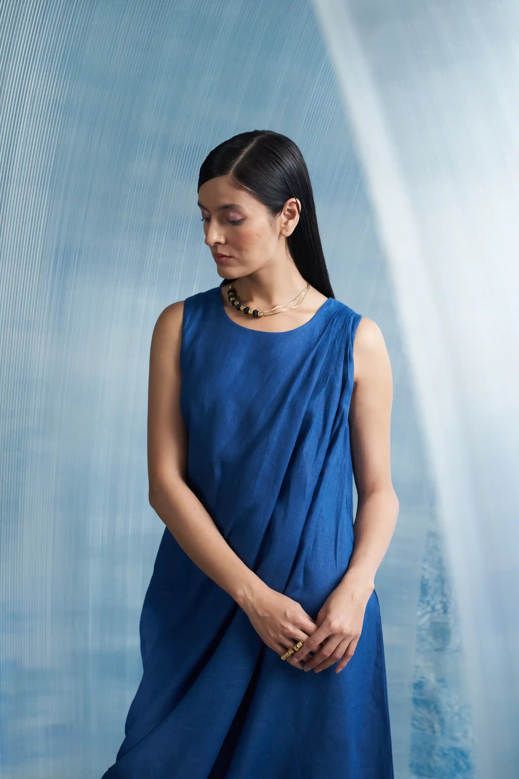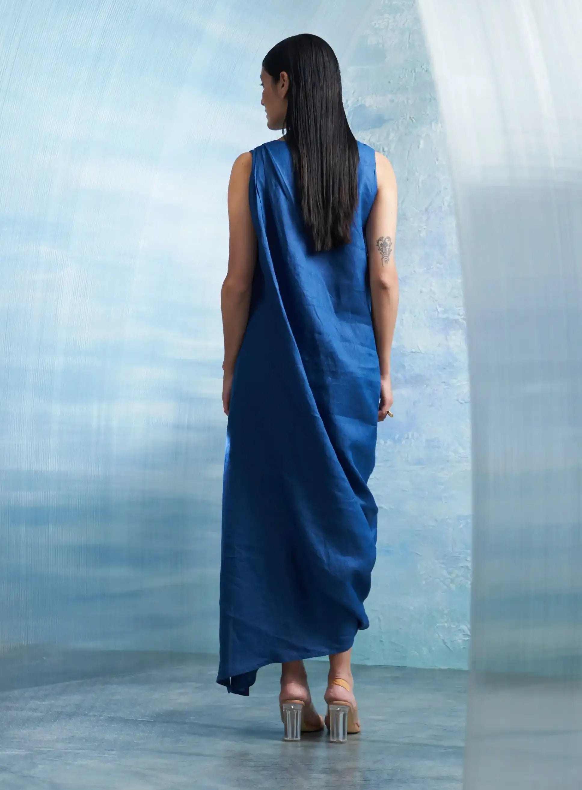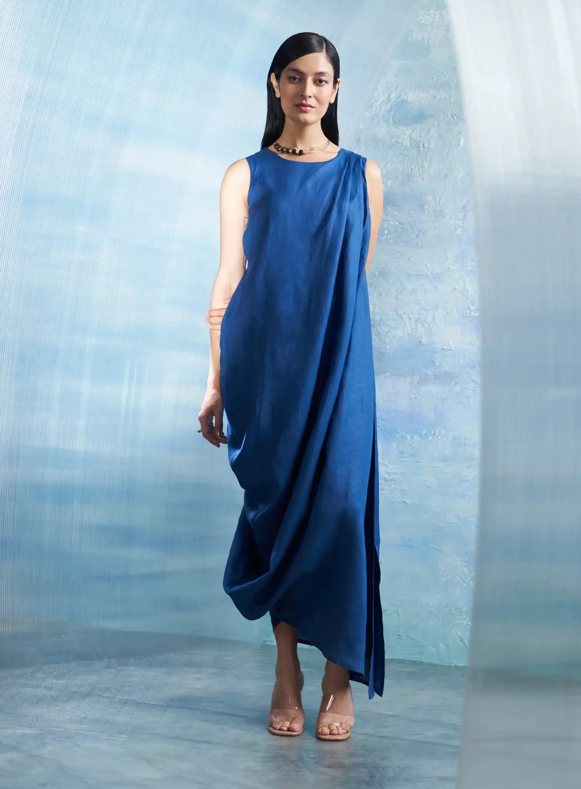 Introducing our lining drape style dress, beautifully draped in the regal richness of royal blue. Impeccably crafted with an inner lining, it offers comfort and confidence with every step. A stylish tie-up belt adds to its allure, accentuating your waistline for a flattering silhouette. Whether worn with or without the belt, this dress radiates elegance and sophistication. Versatile enough for any occasion, it promises to make every moment memorable with its captivating appeal. Embrace the perfect blend of style and grace with this stunning piece.