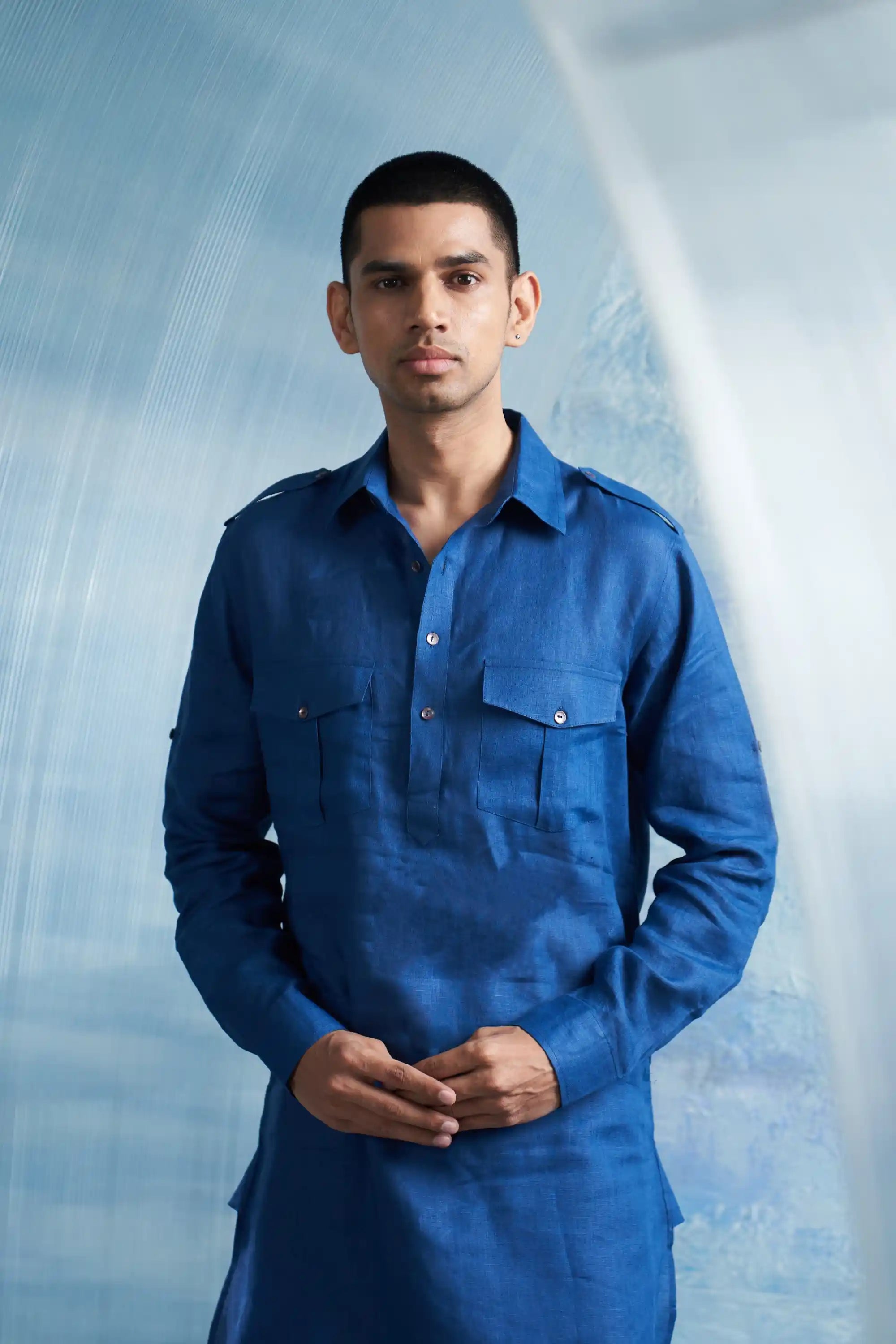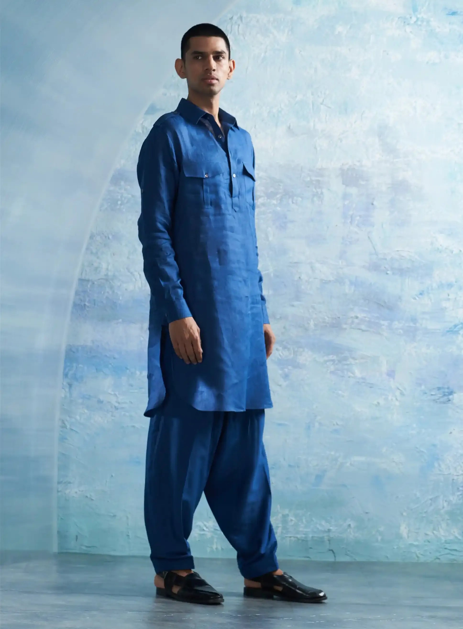 Step into elegance with our Aura royal blue linen pathani, a standout piece from our collection. This classic ensemble features a stylish shirt collar, shoulder loops, folded sleeves, and a rounded bottom, exuding refinement and grace. Enhanced with double-sided flap pockets, it beautifully balances sophistication with functionality. Paired with a matching royal blue salwar, this ensemble offers versatility and timeless charm for any occasion. Elevate your style effortlessly with our Aura royal blue linen pathani, designed to make a statement wherever you go.