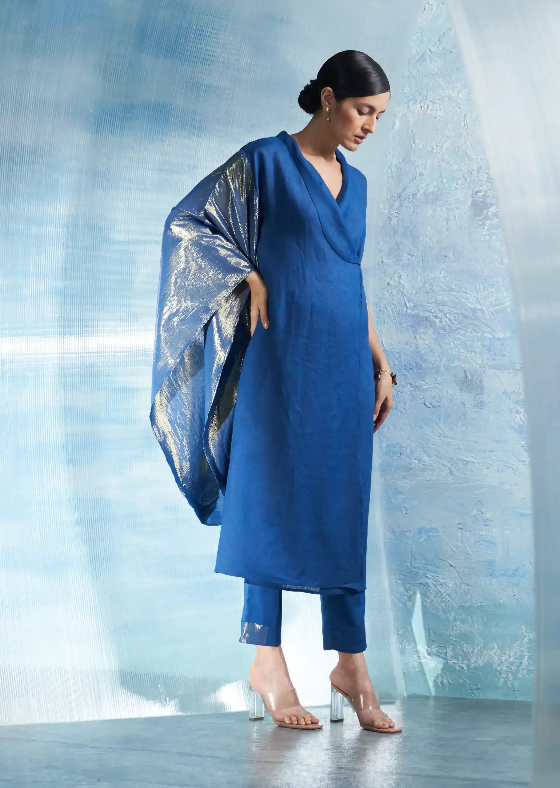 Illuminate your inner radiance with our wrap kurta from the Aura collection—a versatile ensemble that effortlessly combines comfort and style. Featuring a unique shimmer sleeve on one side, it exudes sophistication and charm, making it the perfect choice for any occasion. Crafted from premium fabric, its flattering silhouette and graceful draping ensure it’s a wardrobe essential for every event. The look is beautifully completed with flowy cotton satin pants that offer both comfort and style in equal measure. The pants are elasticated and include a drawstring for a perfect fit, ensuring you feel fabulous all day long.