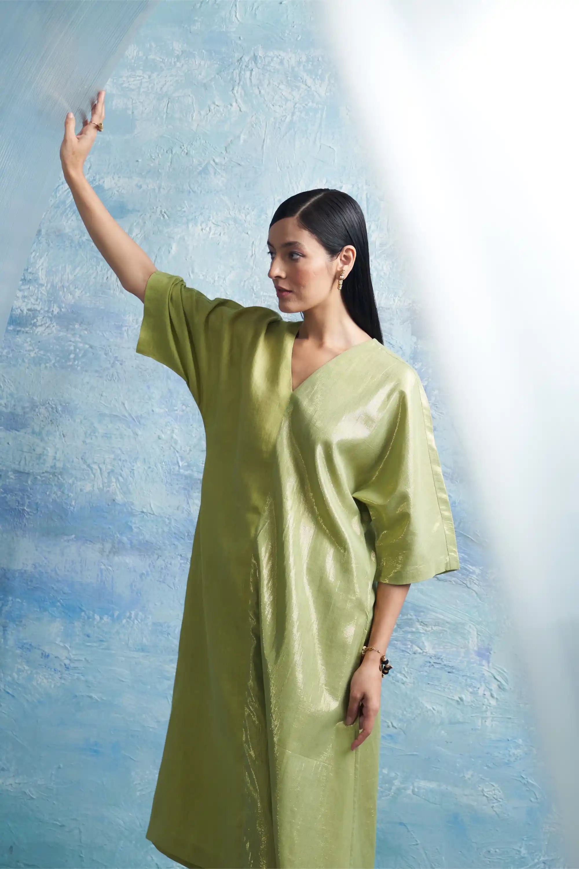 Step into elegance with our sheen green kurta set, meticulously crafted from a luxurious blend of premium linen and cotton shimmer. Its timeless silhouette flows gracefully, radiating chic charm, while the subtle sheen of linen harmonizes beautifully with the refined shimmer, creating an enchanting interplay that captivates the eye. Paired with flowy cotton satin pants for ultimate comfort and style, this set is designed for effortless wear. Completing the look is a sheer organza dupatta, adding an ethereal touch to your ensemble. The pants feature an elasticated waistband and a convenient drawstring for a perfect fit.