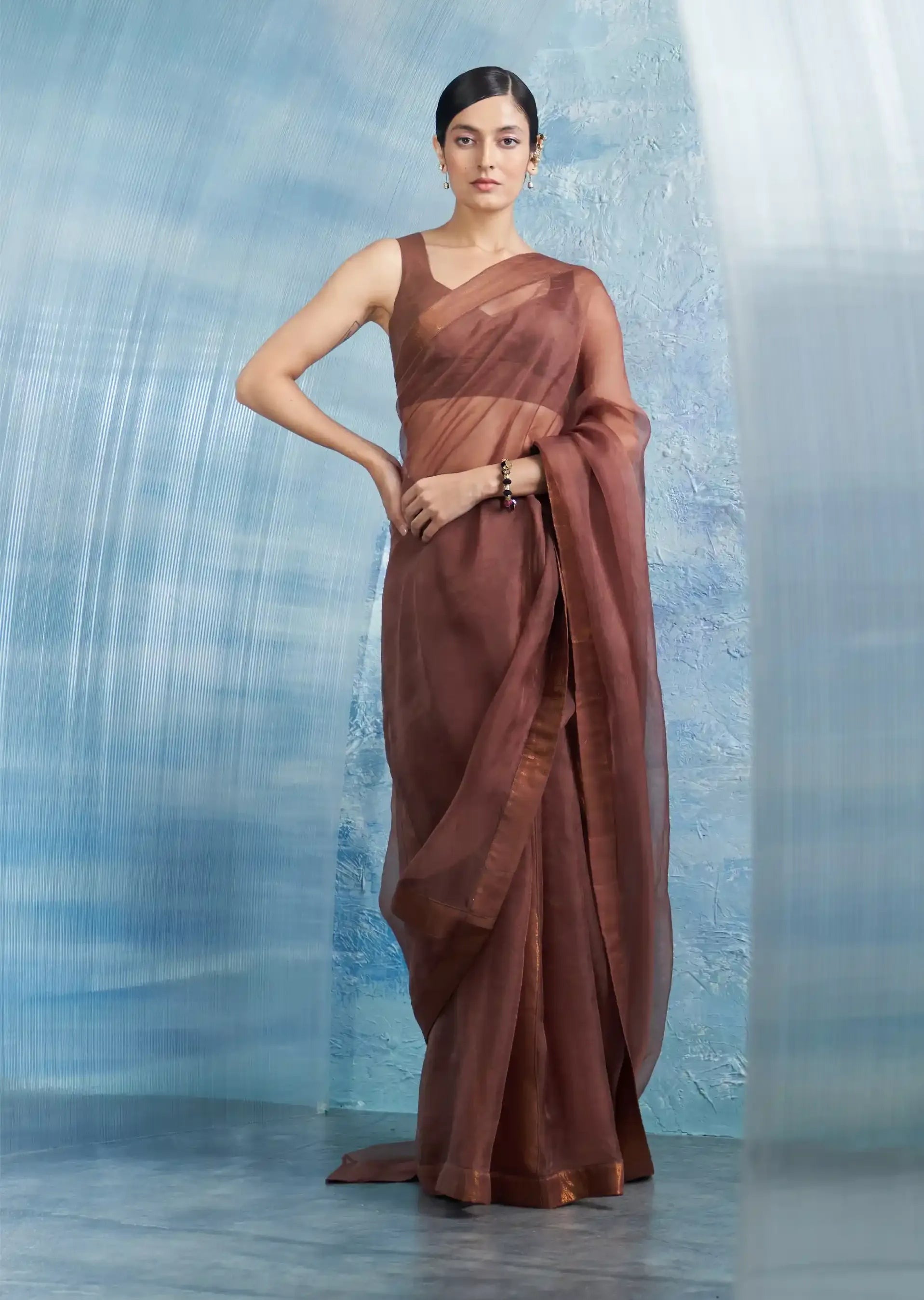 Introducing our show-stopping masterpiece, the Aura shimmer organza saree, designed to mesmerize with every graceful movement. Crafted from ethereal organza fabric, this saree features subtle shimmer accents that delicately catch the light, casting a spell of enchantment wherever you go. Paired with a linen blouse, this ensemble strikes the perfect balance between raw, natural beauty and refined sophistication. The simplicity of the linen blouse enhances the radiance of the shimmering organza, creating a harmonious fusion of textures and tones that is sure to turn heads at any occasion. Embrace elegance and charm with this captivating piece.