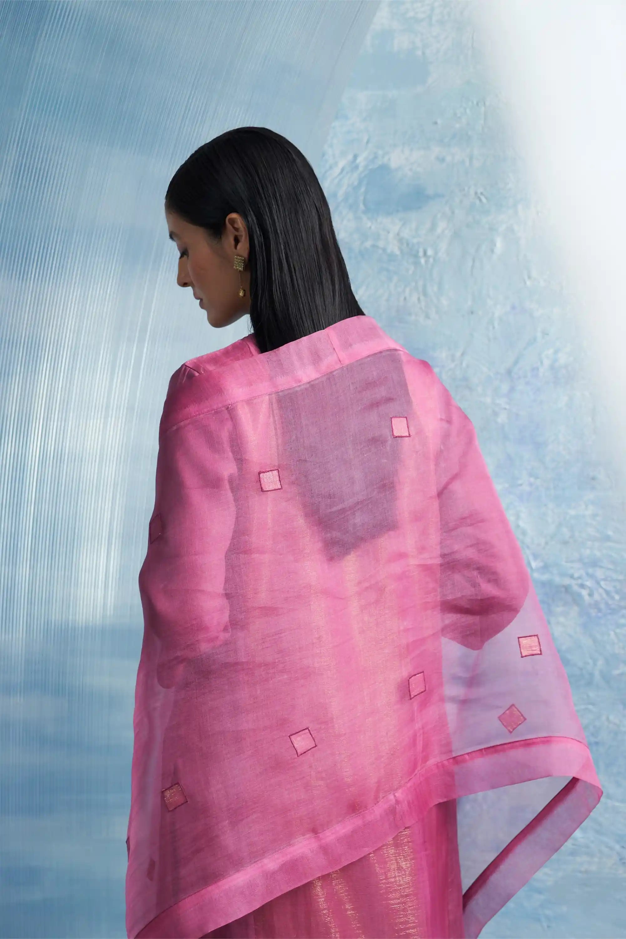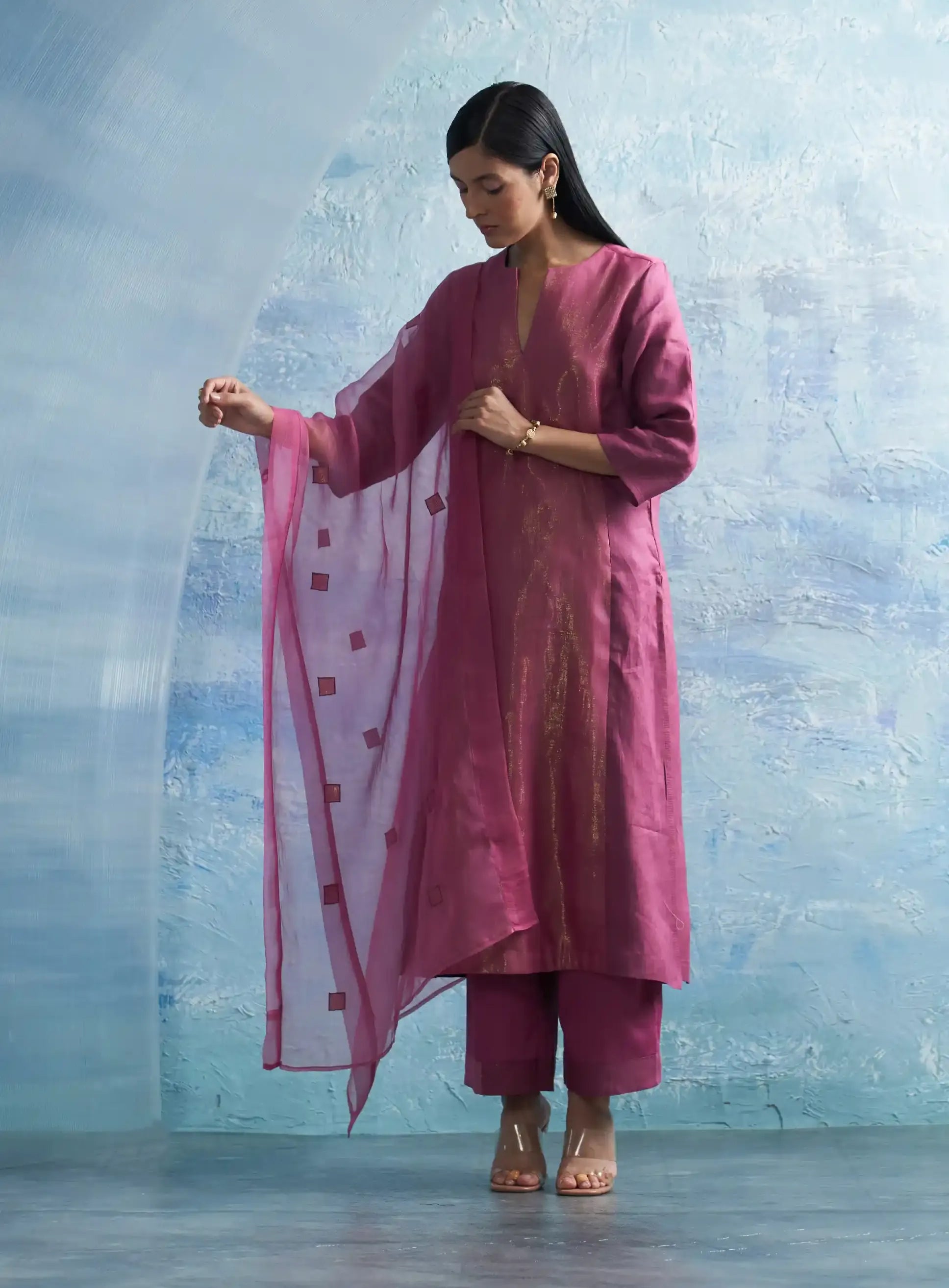 Indulge in the epitome of festive elegance with our Aura fuchsia notch neck kurta set, designed in a luscious grape pink hue. Crafted from premium linen, this ensemble boasts a subtle shimmer effect that exudes understated glamour. The crisp notch neckline and flattering A-line silhouette ensure a refined fit for every body type, while the straight palazzo pants provide both comfort and sophistication. Elevating the look further, the sheer organza dupatta features meticulous patchwork and delicate hand embroidery, adding a touch of sophistication perfect for any upscale occasion. The pants are elasticated and include a drawstring for a comfortable, adjustable fit.