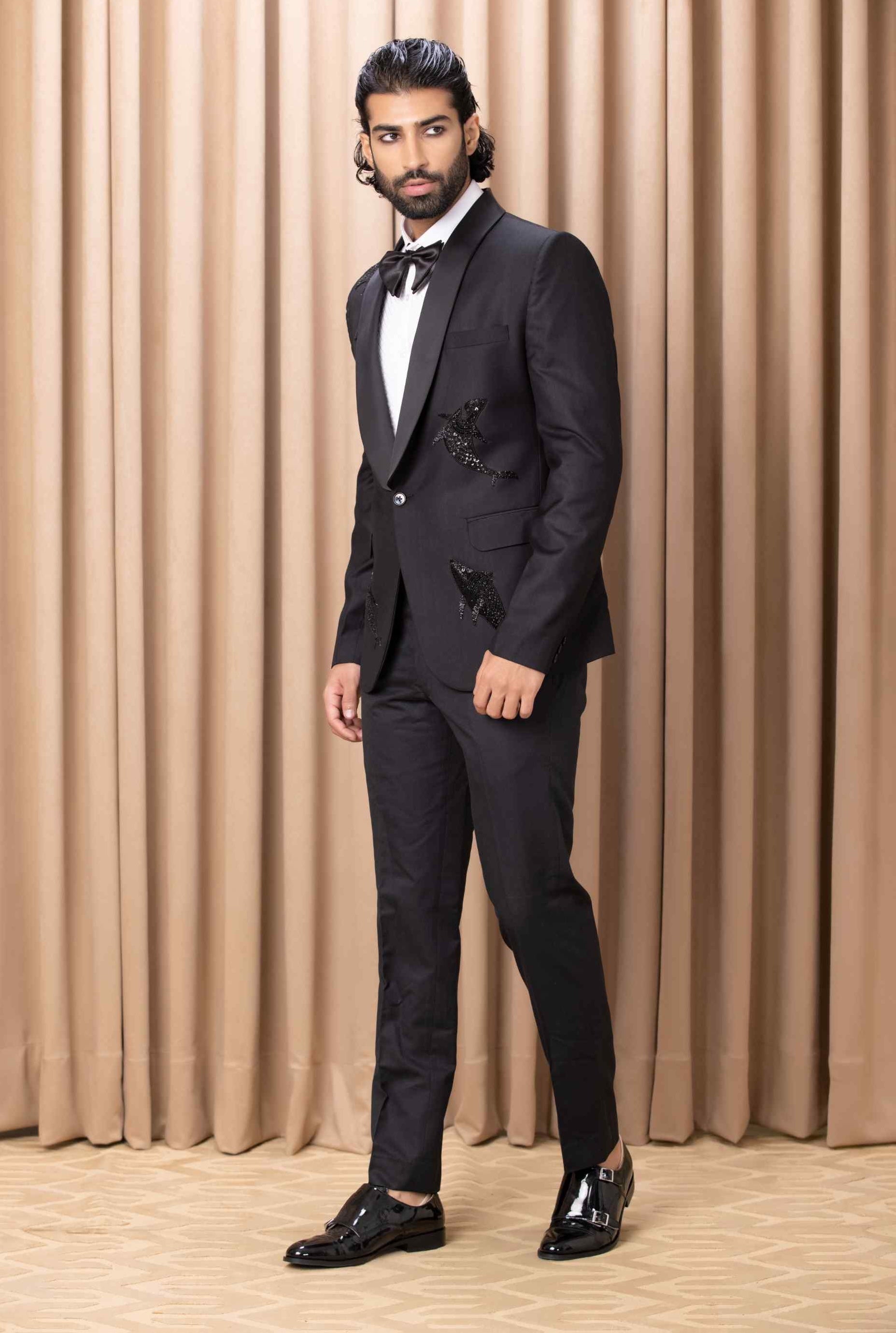 Embrace elegance with our bespoke hand-embroidered black tuxedo set, featuring a sophisticated shawl collar and exquisite detailing. Tailored for distinguished events, this set includes a sleek black jacket and matching black trousers. Perfect for making a refined statement at any classy occasion, this tuxedo seamlessly combines timeless sophistication with meticulous craftsmanship.