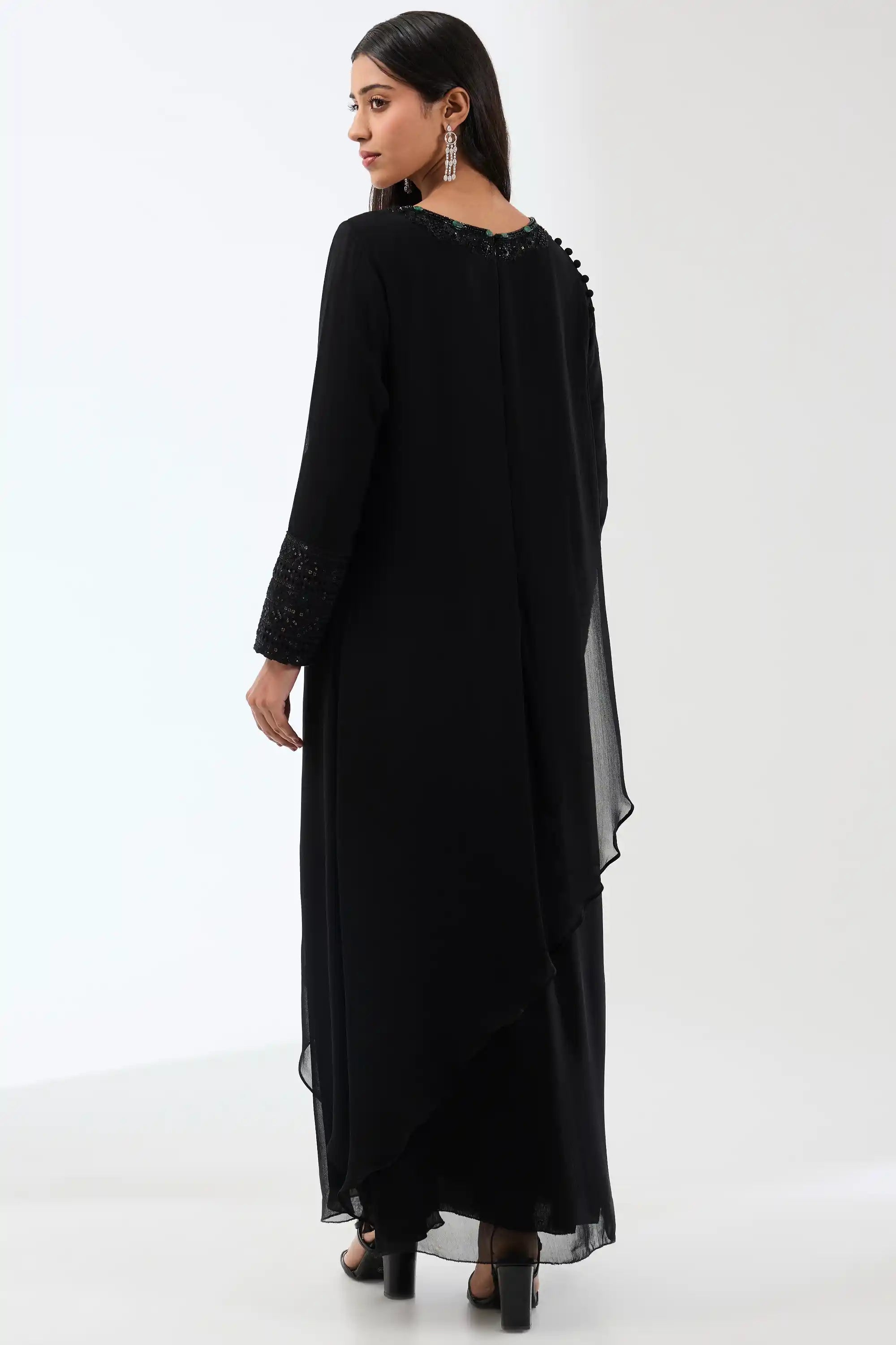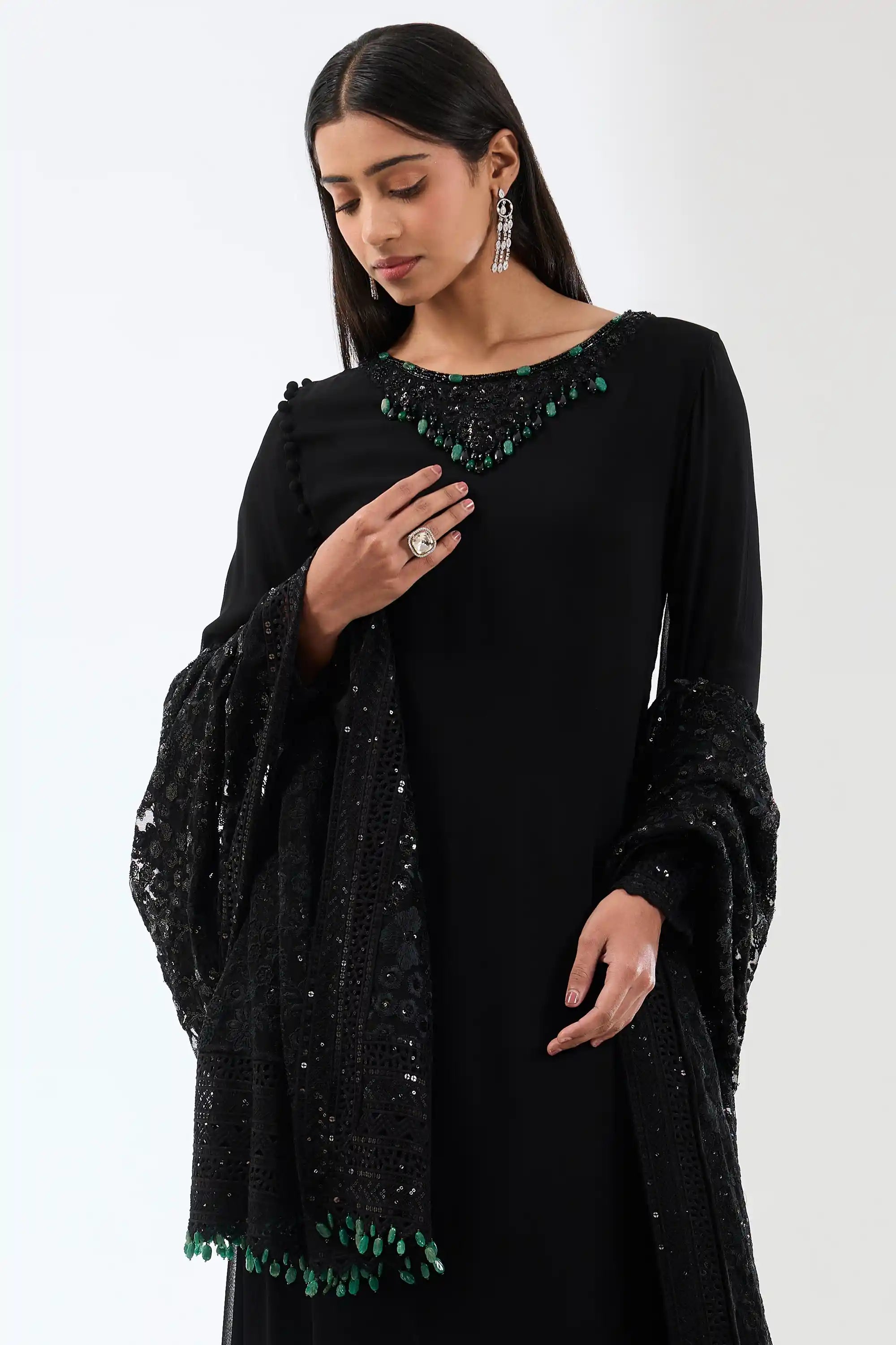 Step into elegance with this striking black georgette long kurta, featuring a chic two-layer design. Adorned with emerald green stone hand embroidery on the neck and cuffs, it is beautifully complemented by a thread work dupatta with a matching embroidered border. Perfect for special occasions, this ensemble effortlessly combines sophistication and style.