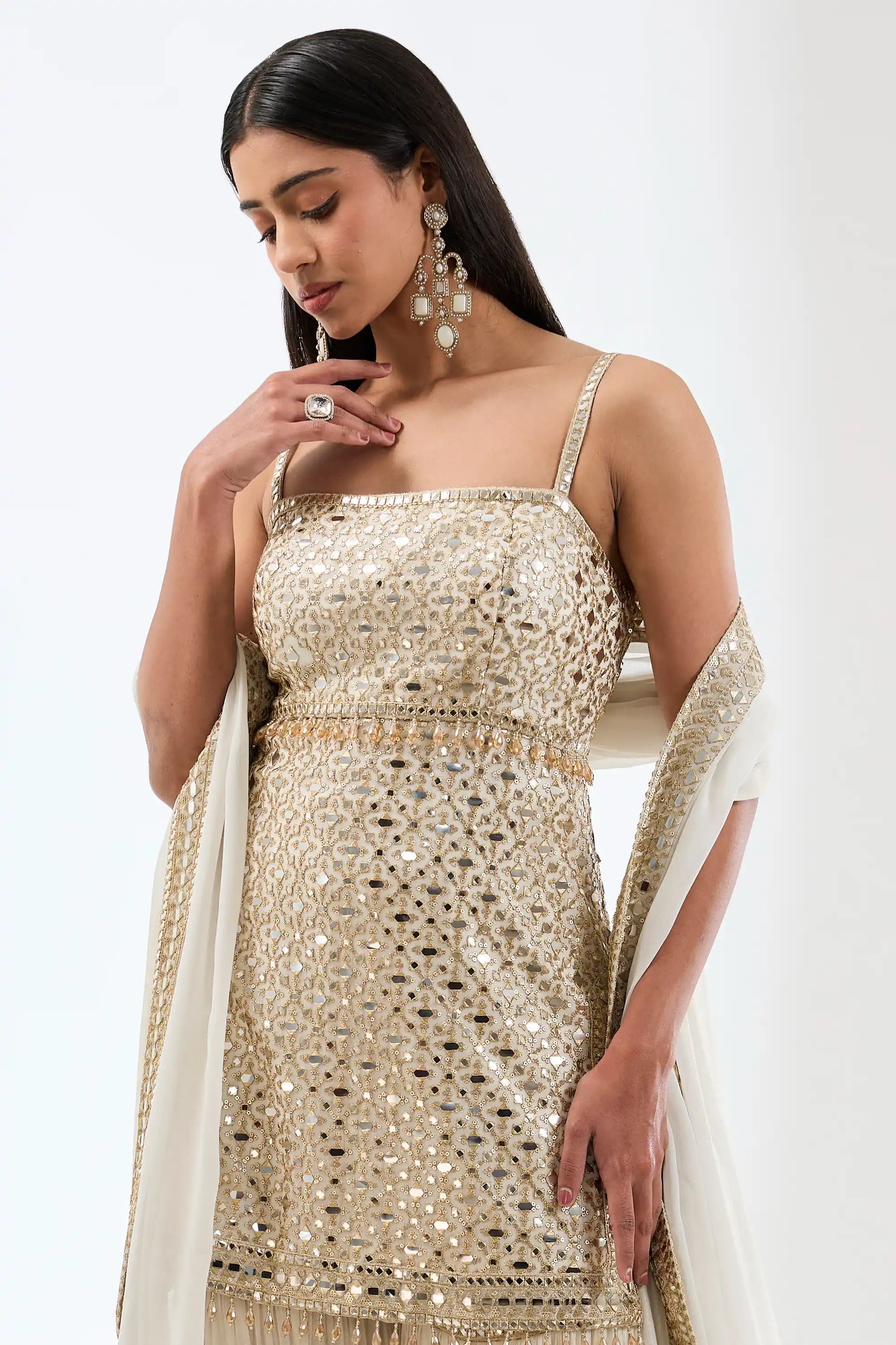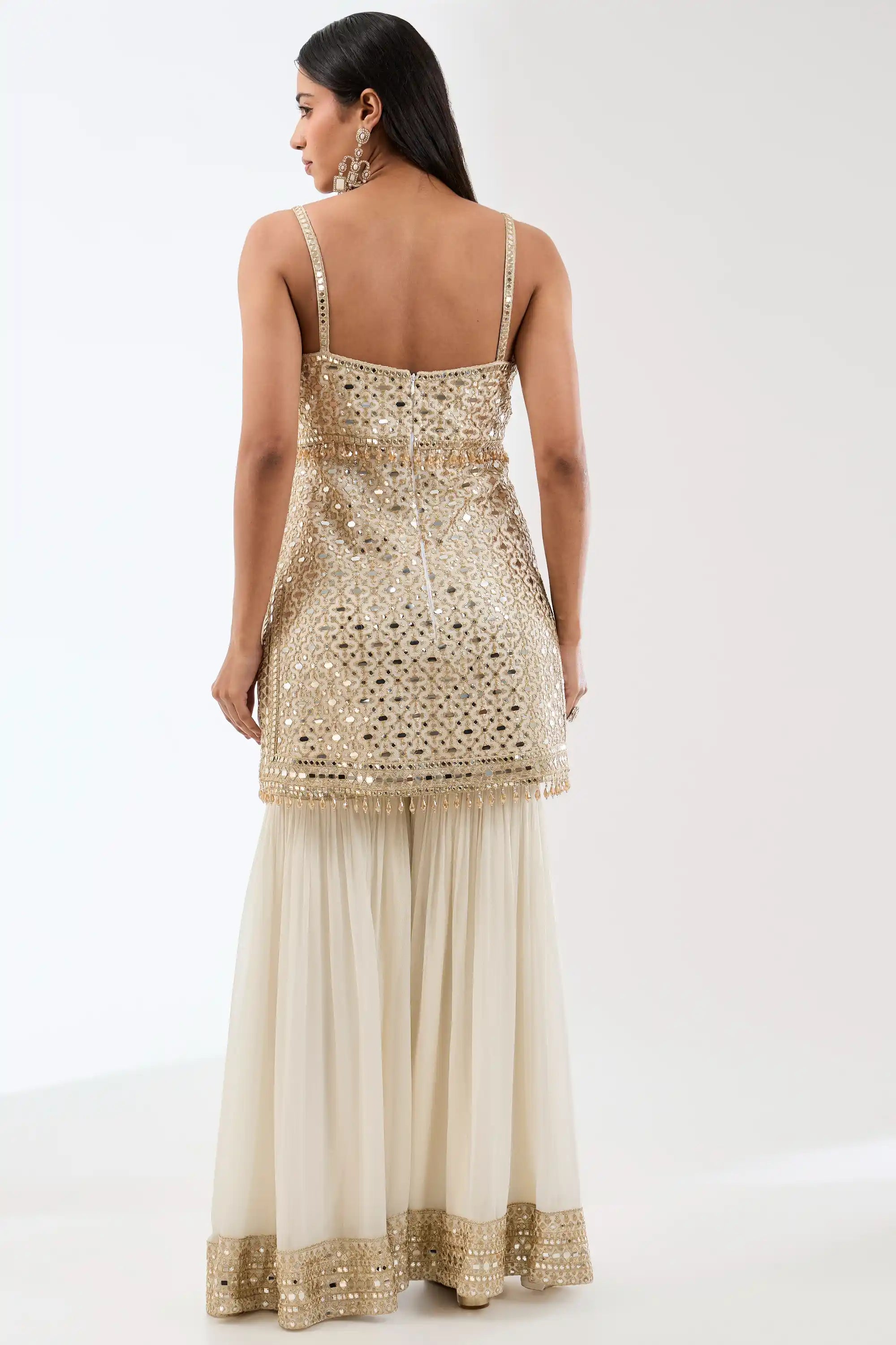 Elevate your style with this exquisite ivory georgette kurta and gharara set, beautifully adorned with gold zari, sequins, and mirror work. The elegant design and flowing silhouette create a stunning look, perfect for festive occasions. This ensemble effortlessly blends traditional craftsmanship with modern sophistication.