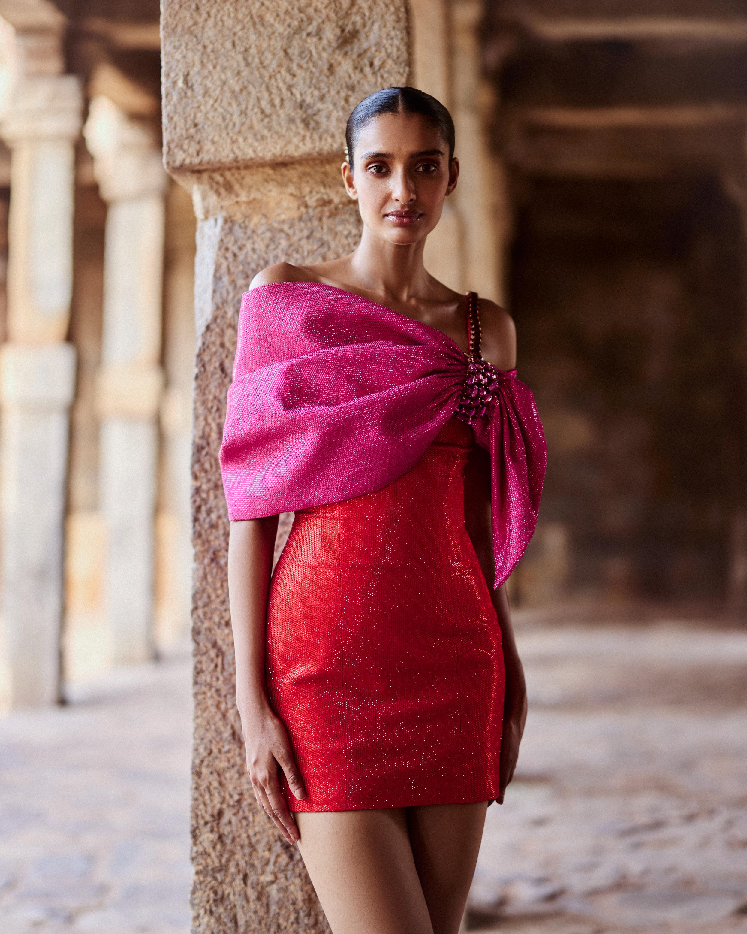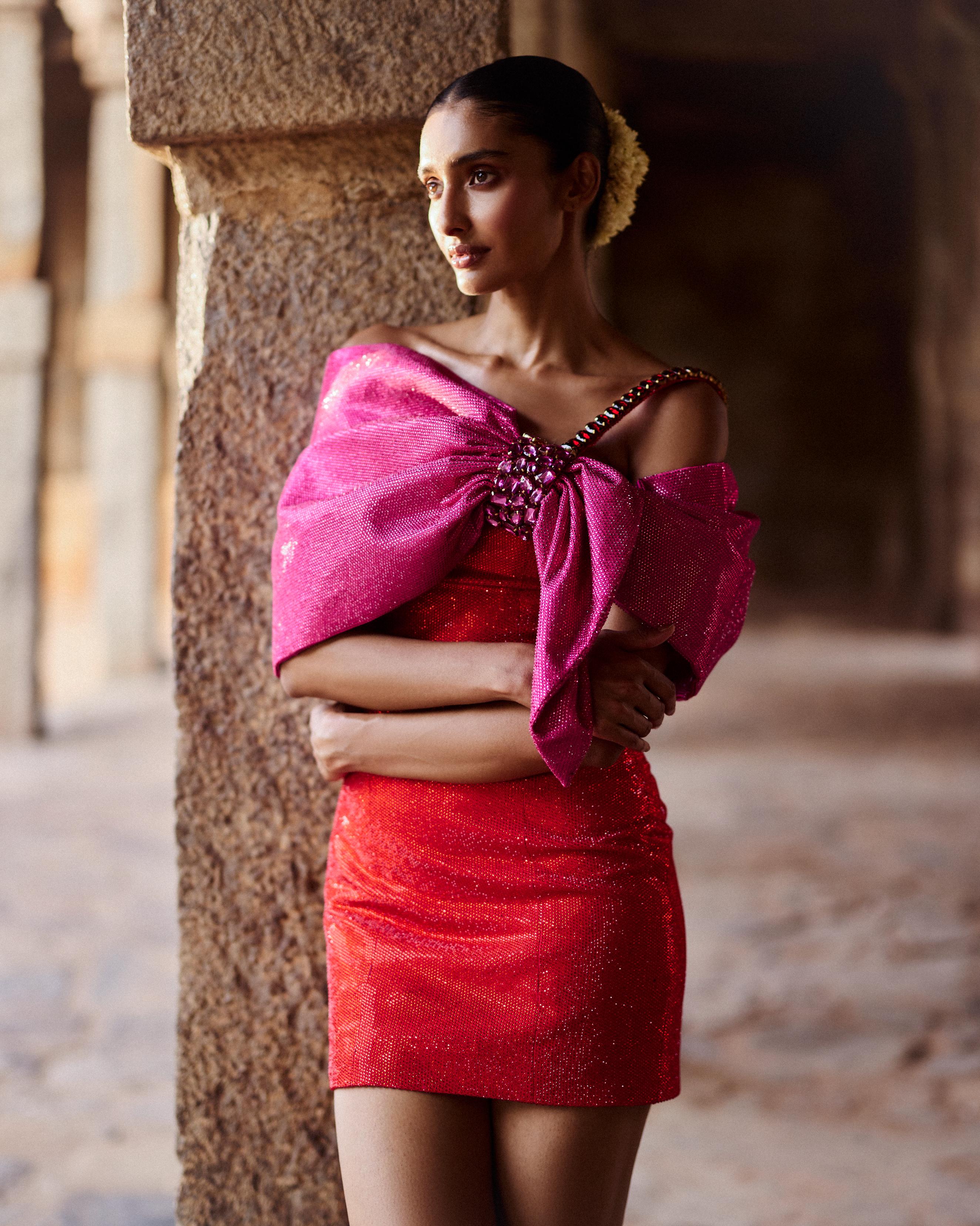 Make a vibrant statement with this pink and orange dress, crafted from melon crepe and featuring off-shoulder bow-shaped sleeves for a playful touch. The lower panel in shimmering orange crystal fabric adds a glamorous contrast, while the attached corset provides structure and elegance, perfect for standout occasions.
