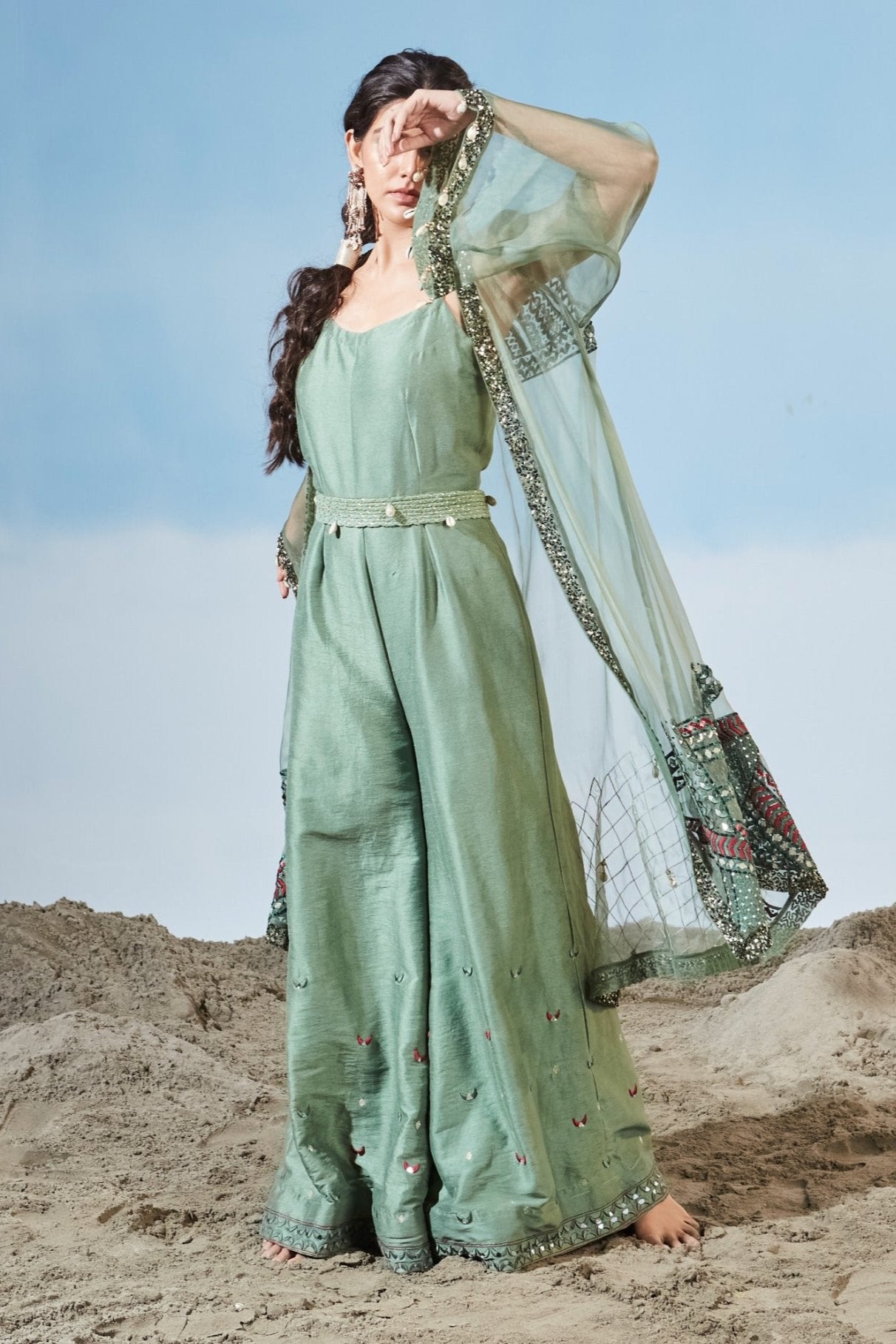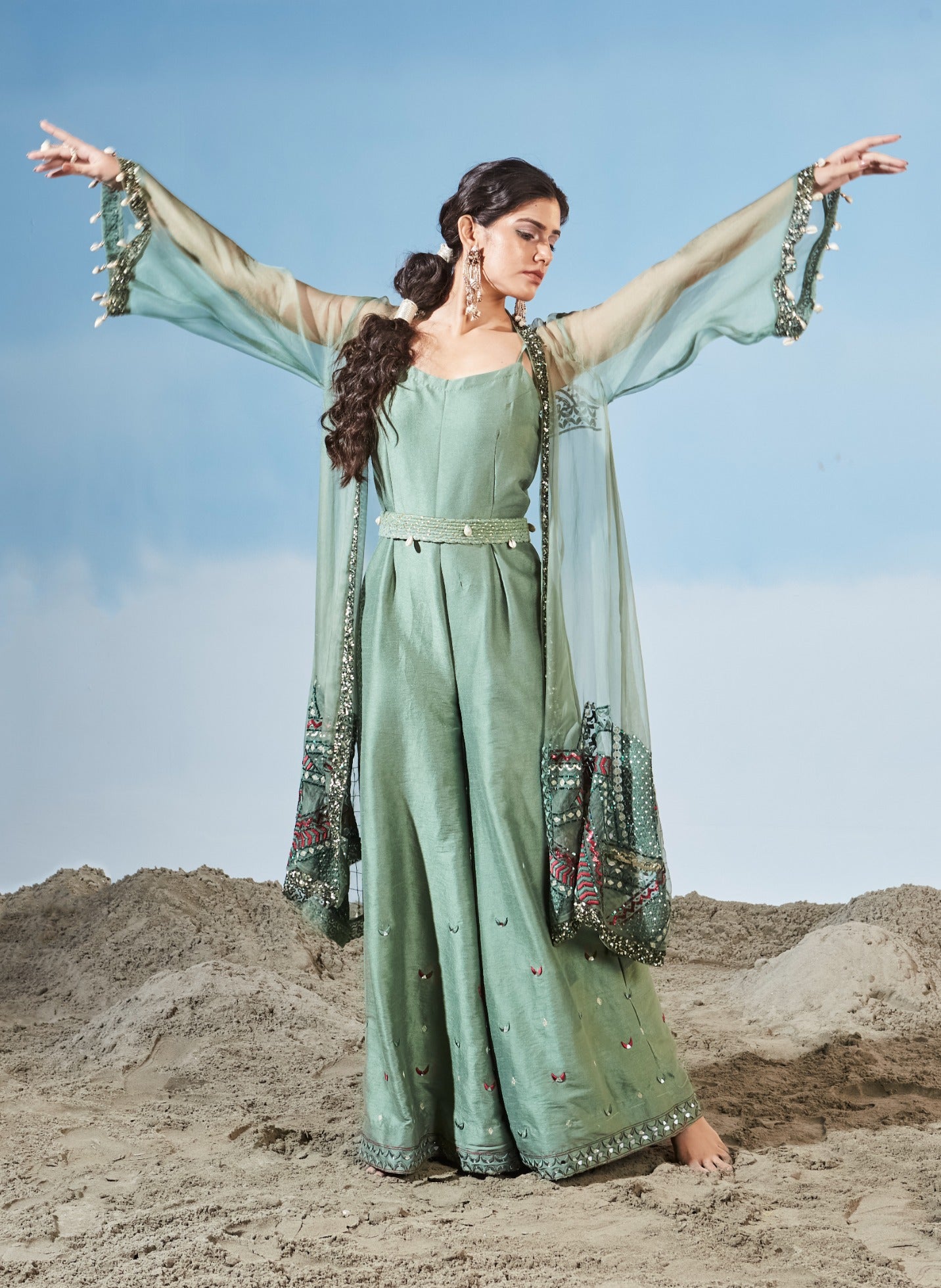 Discover a blend of contemporary chic and timeless elegance with our Strappy Jumpsuit, paired with a stunning organza embroidered cape and a braided belt. The jumpsuit’s sleek strappy design offers a modern, streamlined silhouette, while the organza cape, adorned with intricate embroidery, adds a layer of ethereal sophistication. The braided belt cinches the waist, enhancing the outfit's structure and adding a touch of artisanal detail. Perfect for upscale events or stylish soirées, this ensemble effortlessly combines comfort with couture, ensuring you stand out with grace and poise.