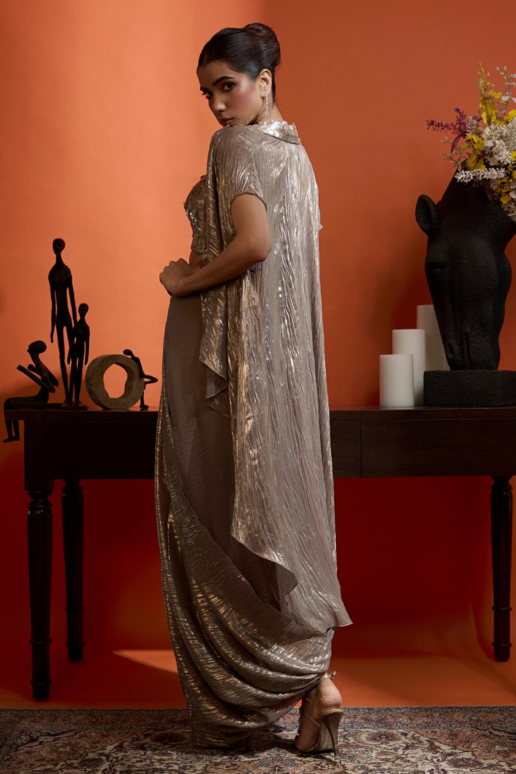 The Gold Wedding Guest Drape Skirt with Cape by Babita Malkani is a show-stopping outfit designed to make a statement at any grand celebration. Featuring a beautifully draped skirt and a matching cape, this ensemble merges traditional elegance with a contemporary twist. The rich gold tone adds a royal charm, making it a perfect choice for weddings, receptions, cocktail parties, and festive gatherings. Crafted with high-quality lightweight fabric, this drape skirt with cape ensures all-day comfort while maintaining a polished and luxurious appearance. Babita Malkani’s attention to detail is visible in the impeccable draping, flawless finishing, and flattering fit that complements various body types. Styling this drape skirt with cape is effortless. It pairs beautifully with statement earrings, metallic heels, and a clutch for an elevated evening look. For a subtler approach, minimal jewellery enhances its timeless sophistication. This drape skirt with cape is ideal for women who appreciate versatile and elegant pieces that can be worn across multiple occasions. Its contemporary silhouette offers freedom of movement while ensuring a striking presence at any event. By choosing Babita Malkani’s Gold Wedding Guest Drape Skirt with Cape, you invest in a timeless wardrobe essential that blends tradition with modern fashion sensibilities. Perfect for destination weddings, cocktail events, and grand receptions, this ensemble guarantees both style and comfort, ensuring you stand out with grace and sophistication.