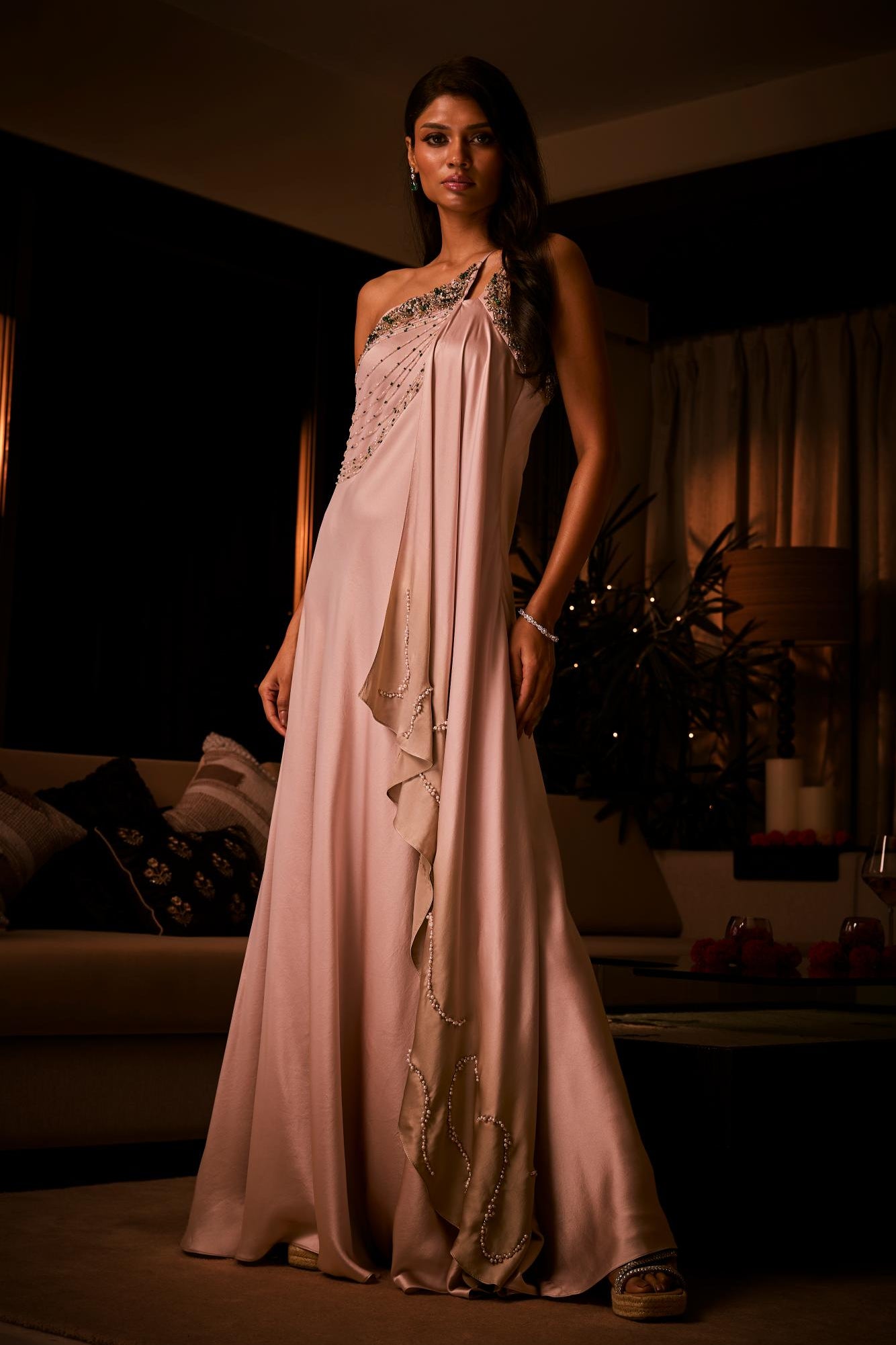 The Pink one-shoulder gown ombre cocktail gown by Babita Malkani is designed for modern festive dressing. This cocktail gown offers a flattering silhouette that balances elegance and comfort. Ideal for wedding receptions and cocktail celebrations, the cocktail gown ensures effortless movement while maintaining structure. The one-shoulder design elevates the appeal of this cocktail gown, making it perfect for statement occasions. Crafted with attention to detail, the cocktail gown reflects Babita Malkani’s refined aesthetic. Whether styled with bold accessories or kept minimal, this cocktail gown adapts seamlessly to evening celebrations. The Pink one-shoulder gown ombre cocktail gown is an essential addition to contemporary occasion wardrobes.