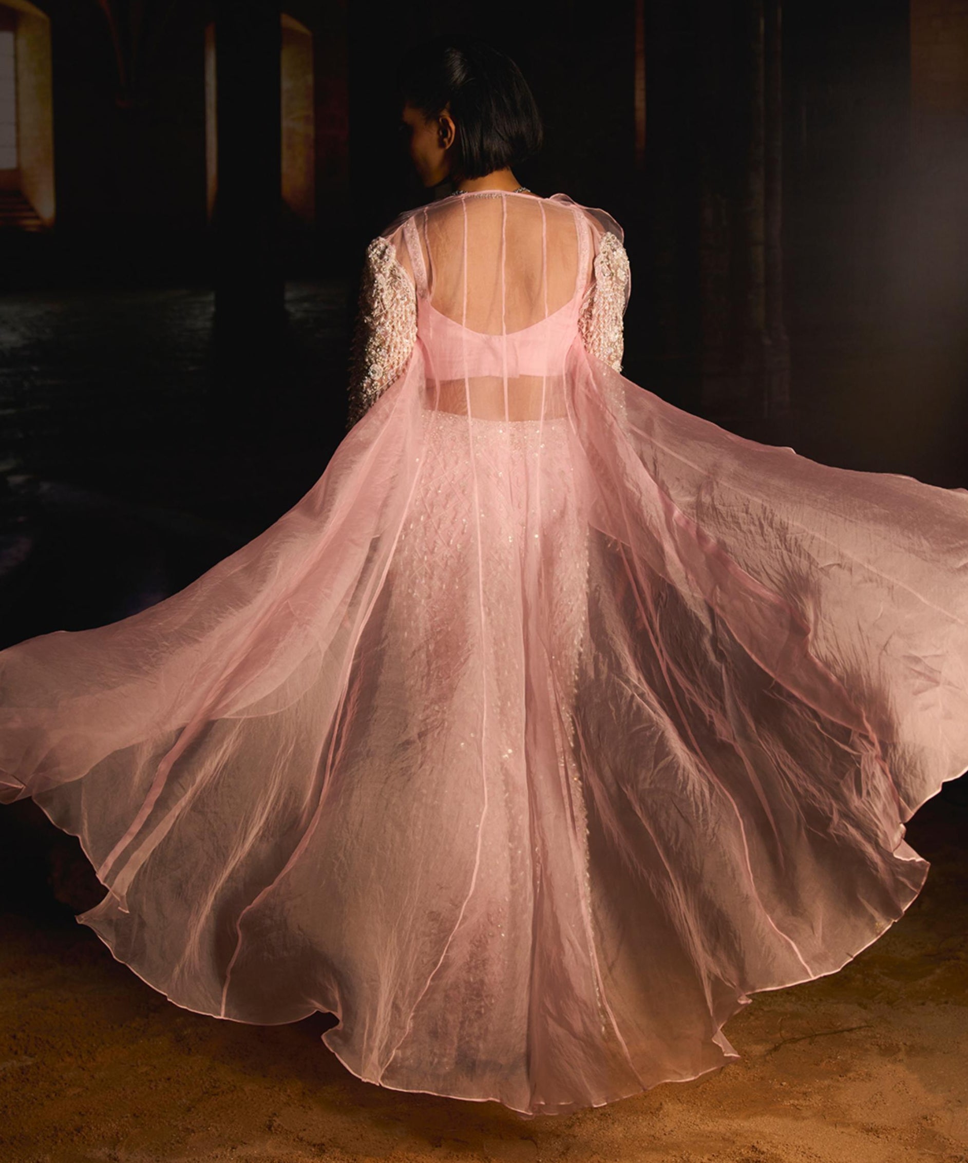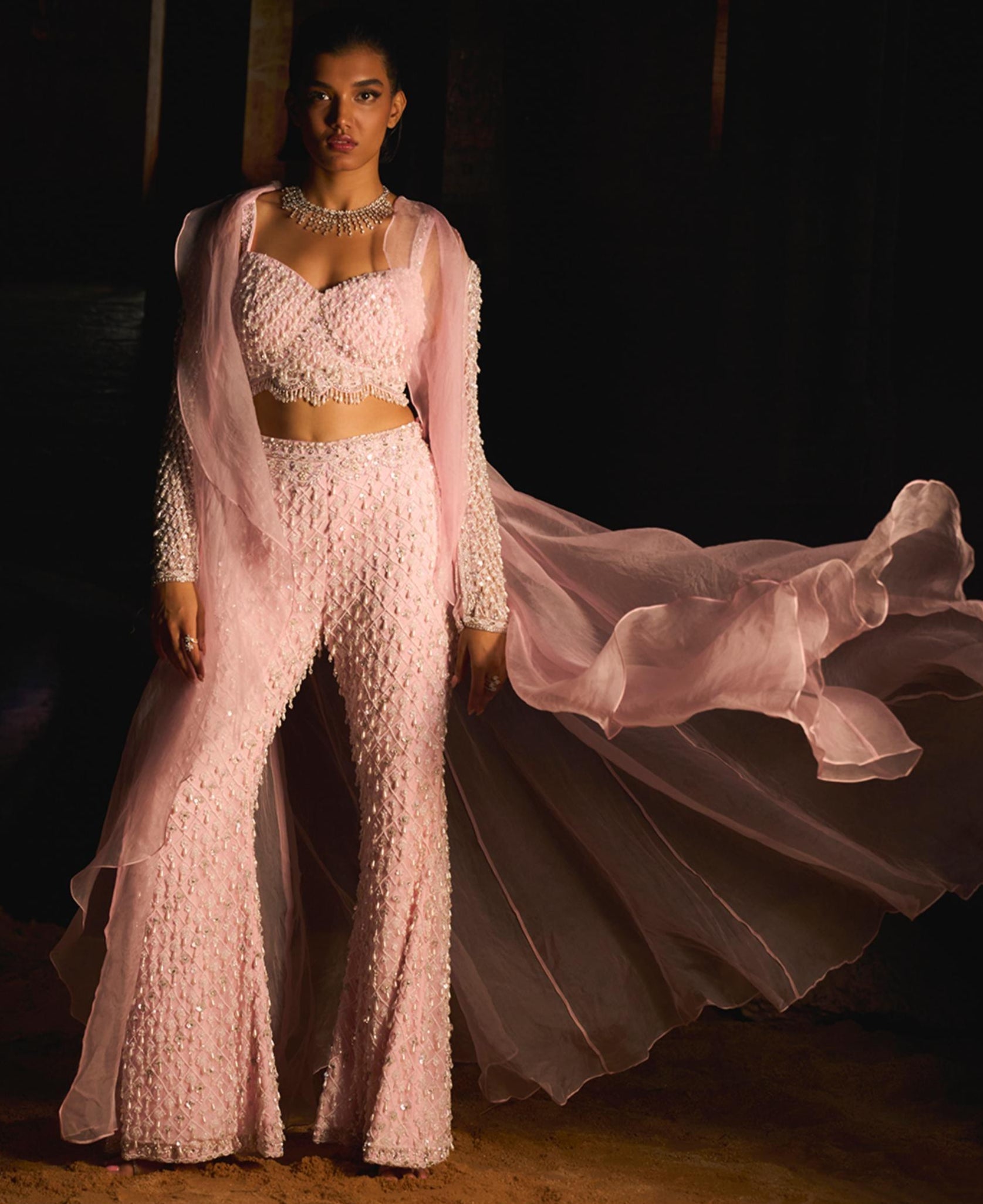 Turn heads with this pink set, featuring a cutdana and pearl embroidered bustier, paired with intricately embroidered pants. The ensemble is elevated by an embroidered organza jacket with statement sleeves, offering a blend of elegance and modern flair. Perfect for weddings, receptions, or glamorous soirŽes.