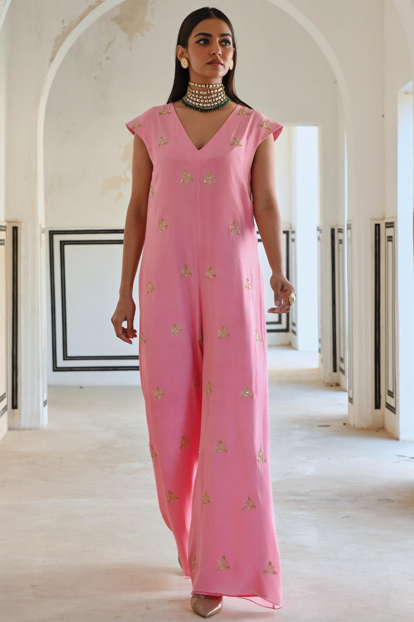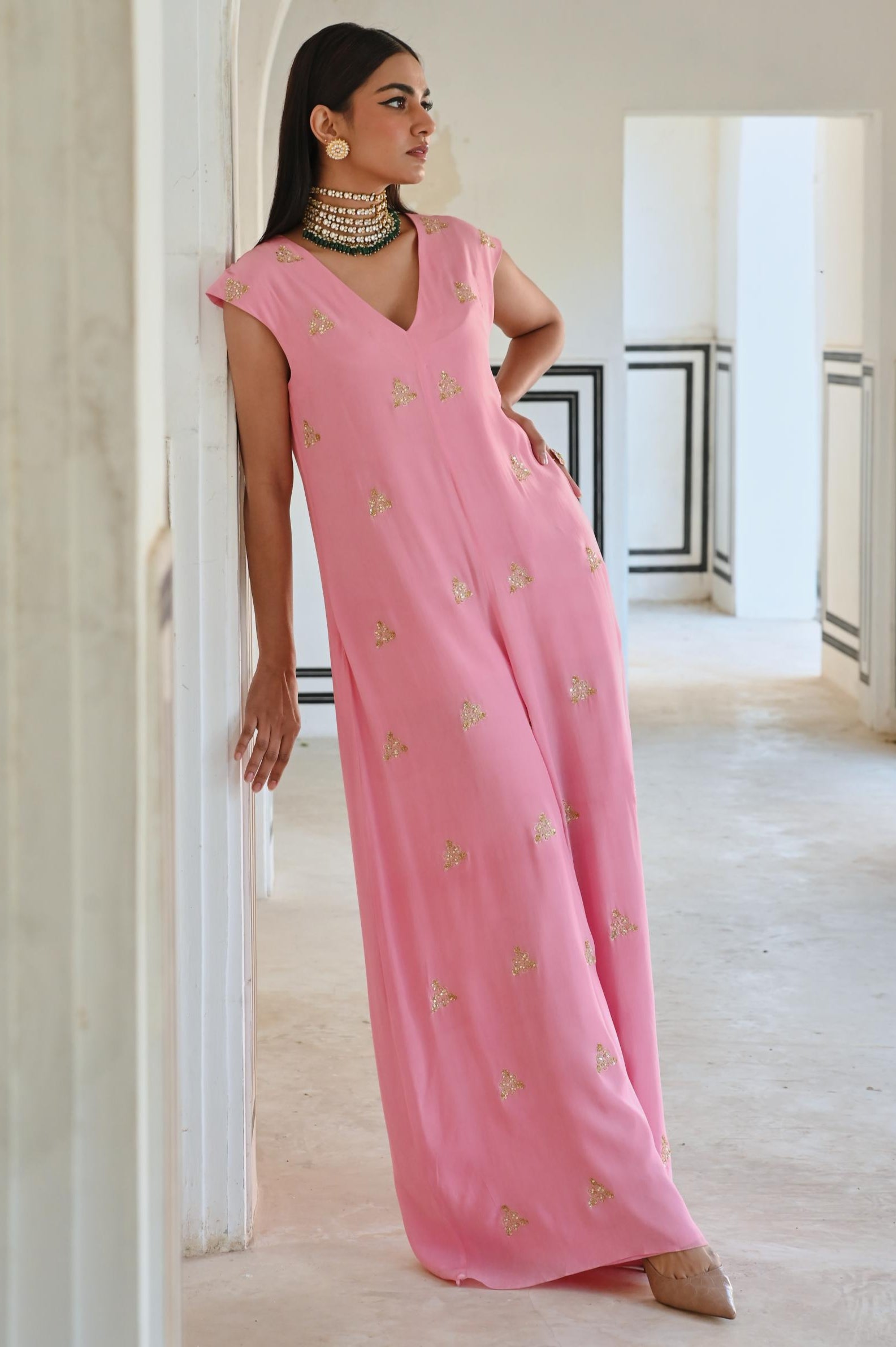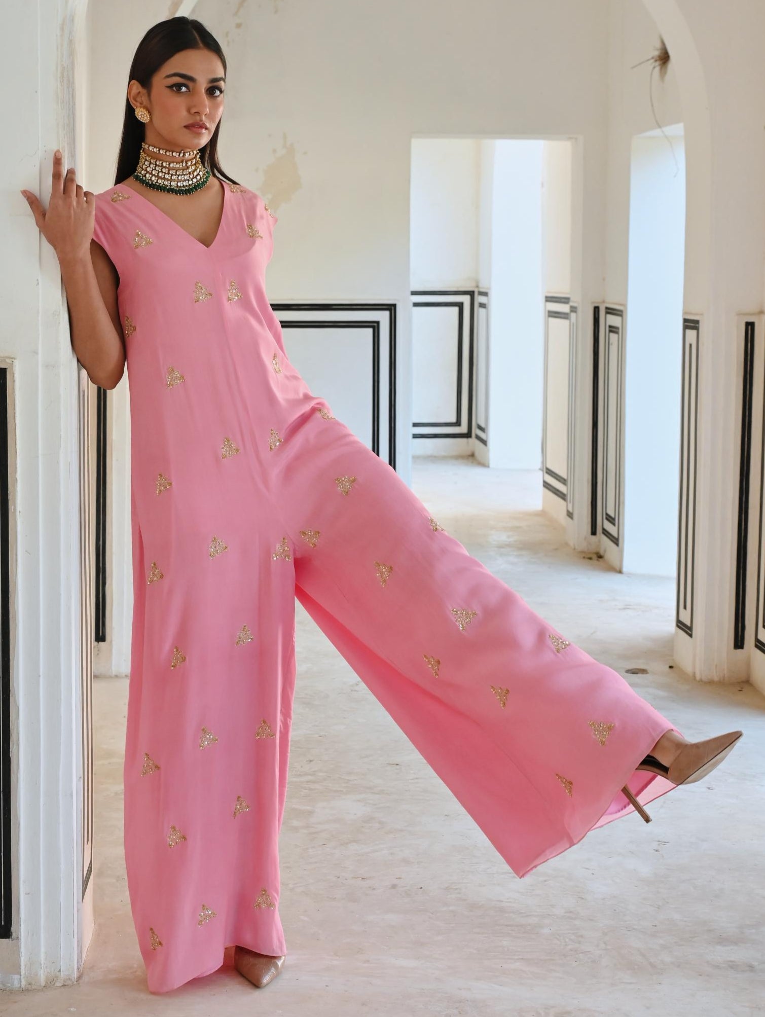 Embrace effortless elegance in the Baby Pink Rahi Loose Jumpsuit. With its flowy silhouette and soft hue, this ensemble is perfect for festive gatherings, casual chic outings, and special occasions.