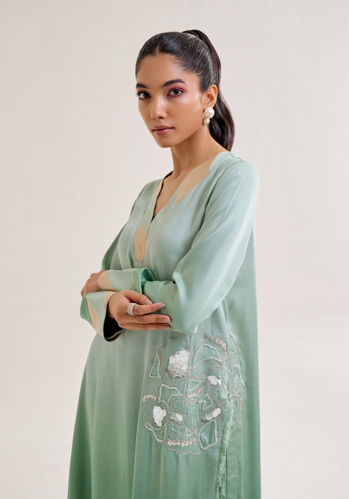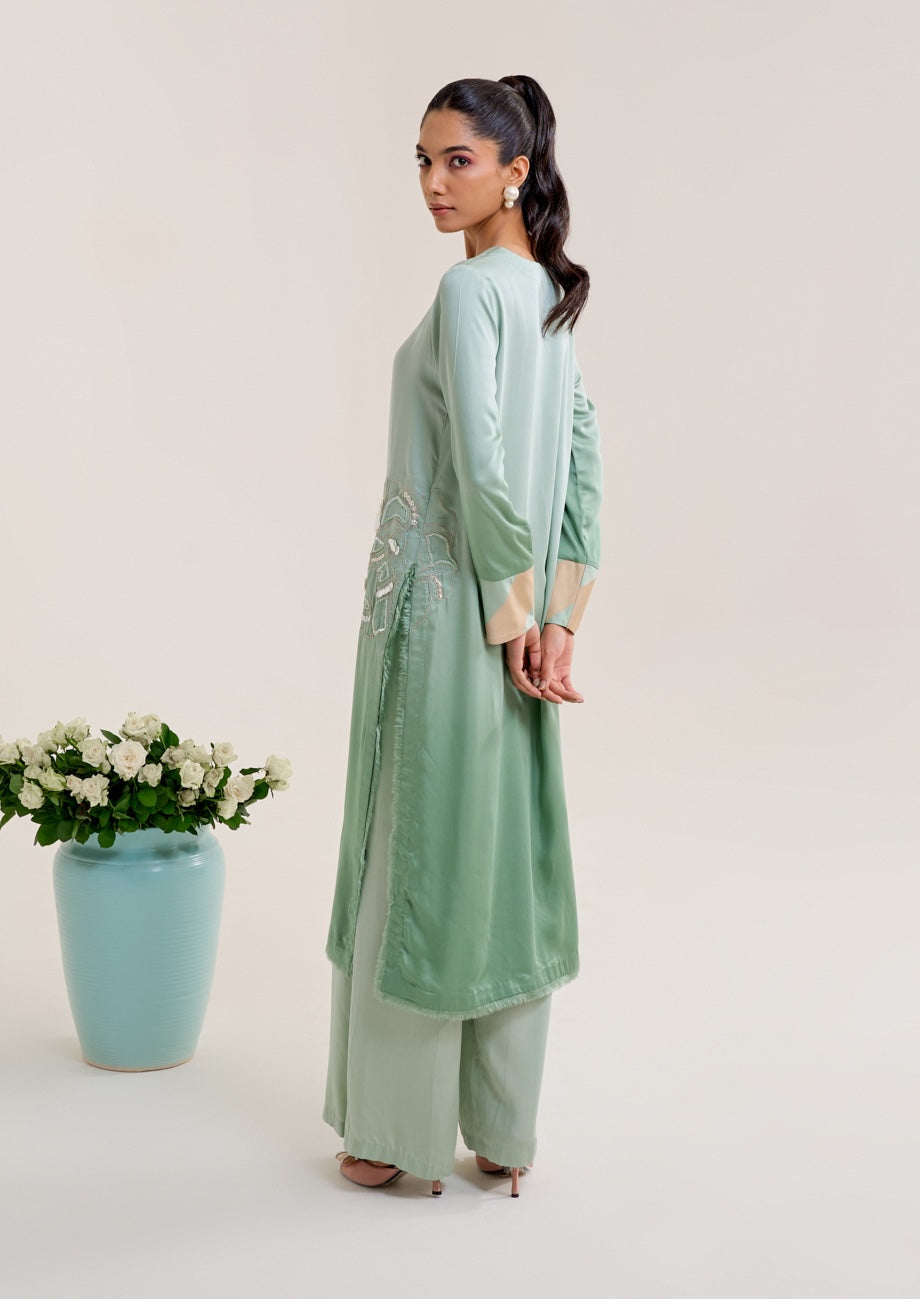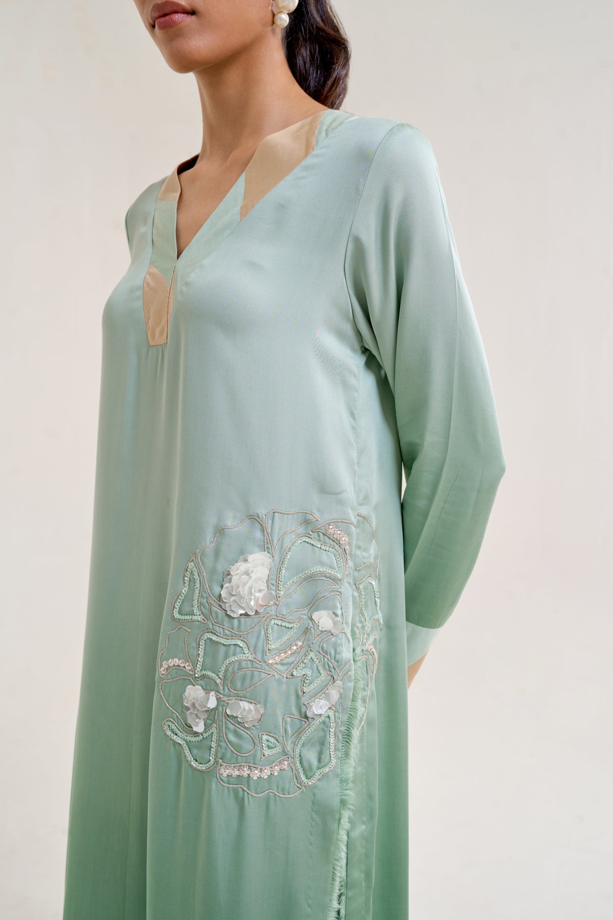 Immerse yourself in refined elegance with our long kurta, adorned with exquisite hand-embellished floral details that add a touch of artistic charm. This beautifully crafted kurta is complemented by matching pants, creating a sophisticated and cohesive look. Perfect for special occasions or formal events, this ensemble combines intricate design with modern style to make a lasting impression. Elevate your fashion with this graceful outfit that effortlessly blends tradition and contemporary flair.