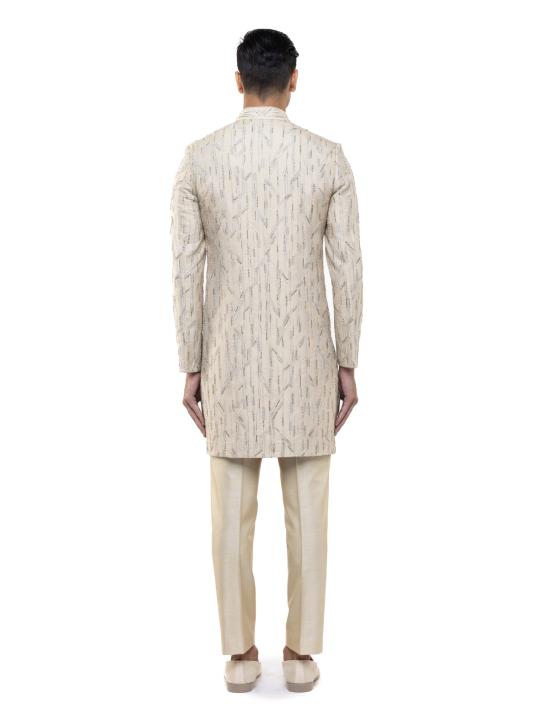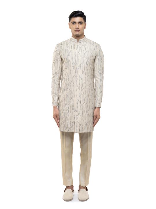 Elegant and understated, this Beige Silk Abstract Sequin Embroidered Sherwani Set features delicate abstract sequin patterns that add subtle shimmer and texture. Crafted from luxurious silk, it boasts a stand collar, concealed placket, and refined Mother of Pearl buttons. The regular fit and straight hem create a timeless silhouette-perfect for weddings, festive occasions, and formal events seeking a touch of modern sophistication.