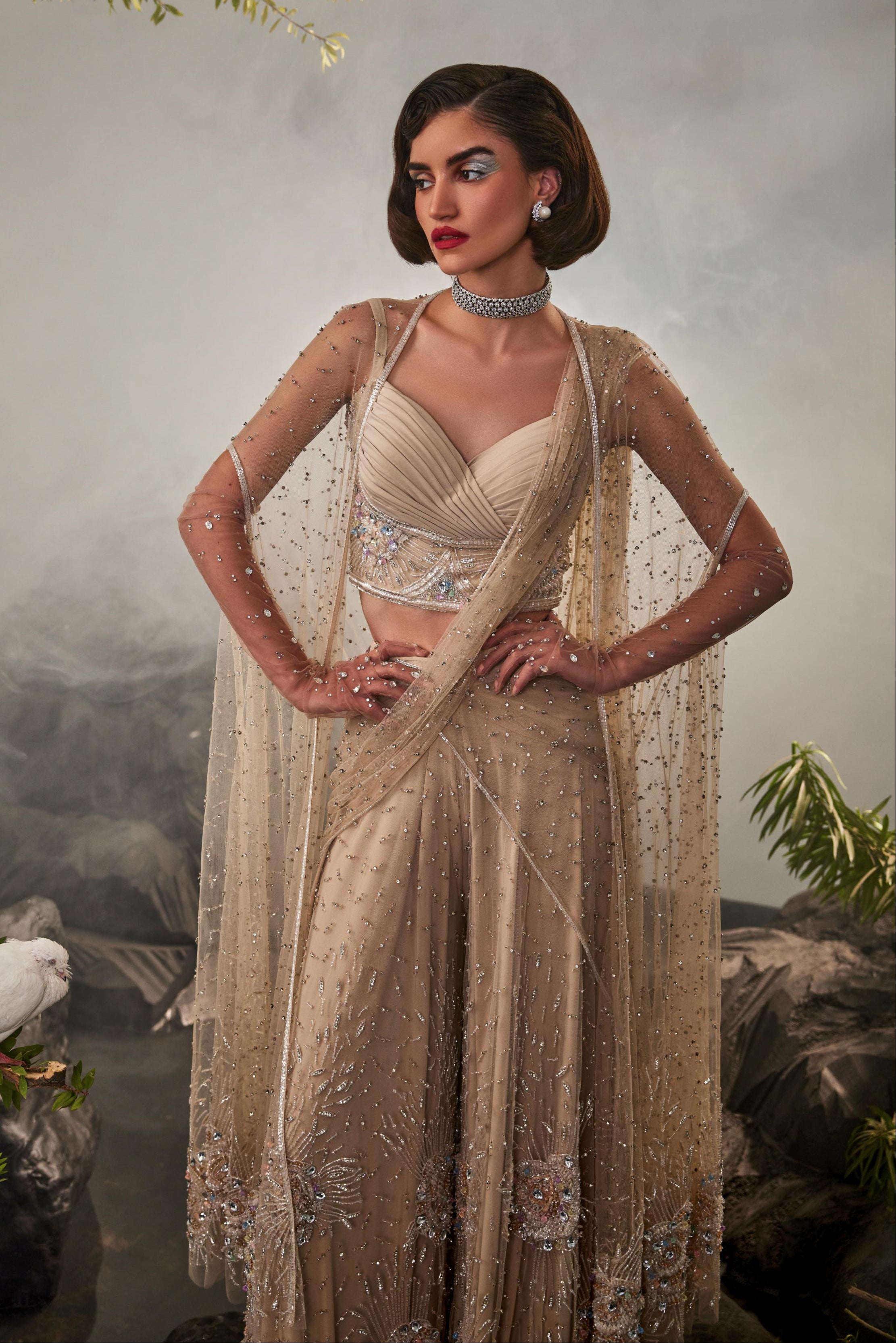 Beige amour sharara sari with blouse and cape