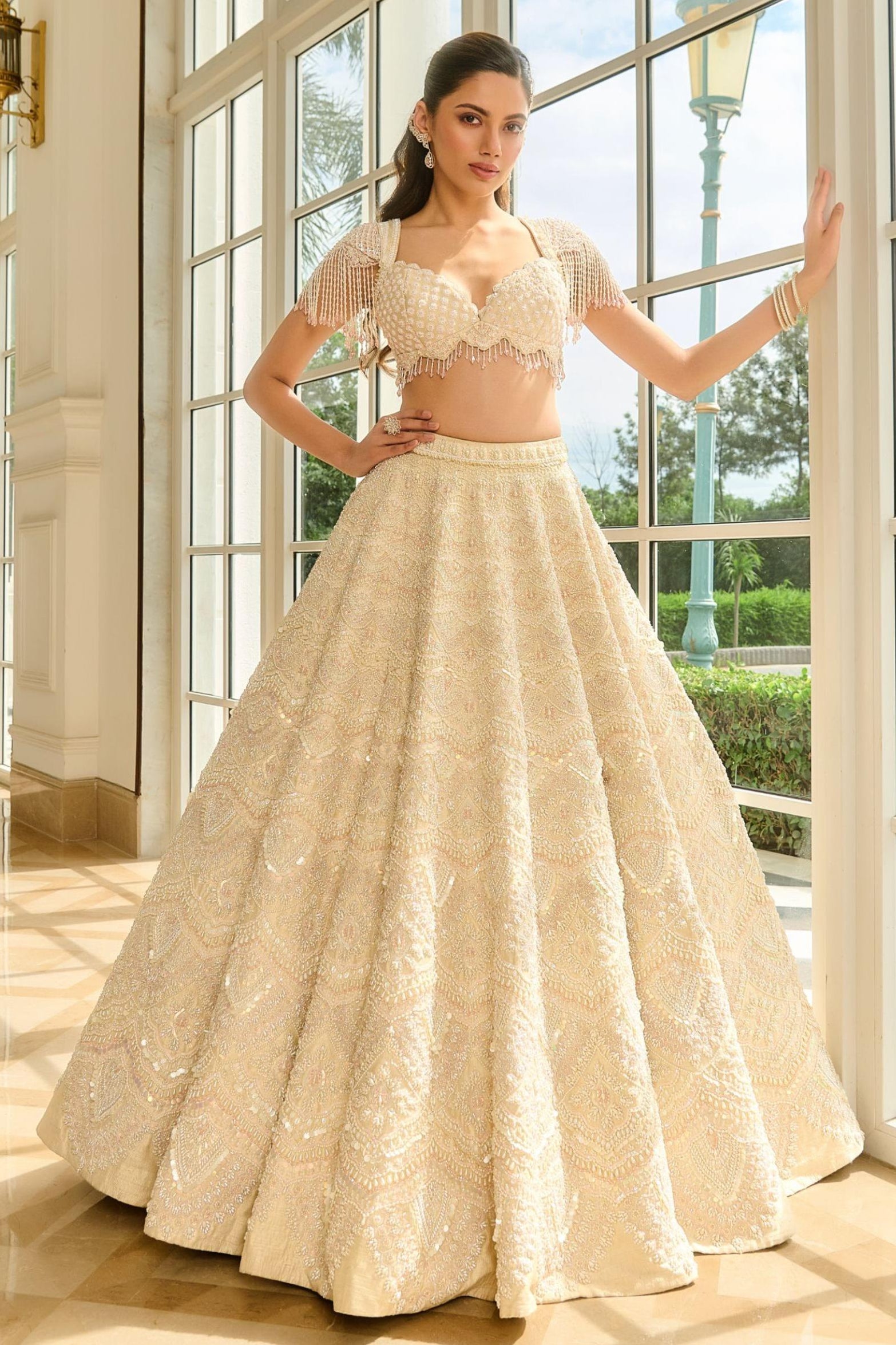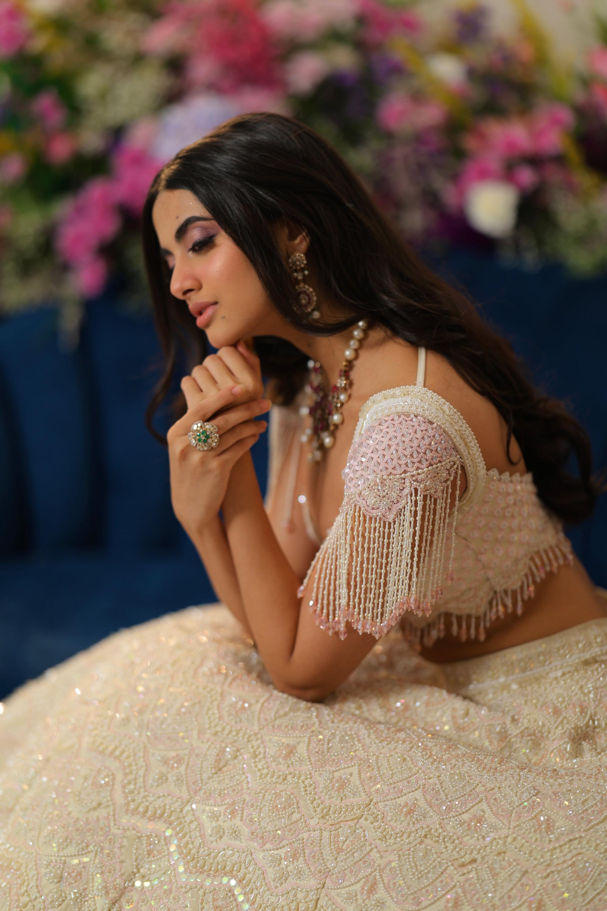 The Blaire Lehenga from our Naayab collection is designed for the modern sundowner bride. Crafted in pure raw silk in an elegant ecru shade, it features intricate hand embroidery with glass beads, pearls, crystals, sequins, and soft pink accents. Paired with a puff-sleeved embroidered blouse and a stunning cutwork soft net veil, this lehenga is rich in surface detailing—making it a must-have for your big day.