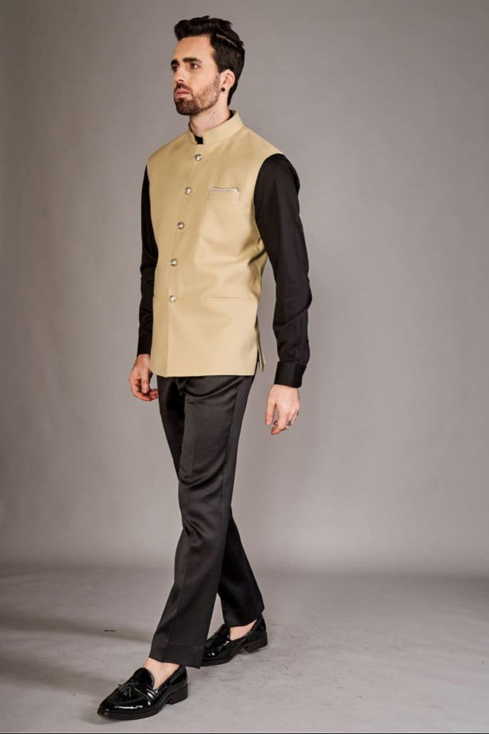 Add a touch of sophistication to your wardrobe with this Beige Classic Bundi paired with a Black Chinese Collar Shirt. The versatile beige Bundi offers a refined, structured look, while the black Chinese collar shirt adds a modern, sleek edge. Perfect for both formal and semi-formal occasions, this ensemble combines traditional elegance with contemporary style.