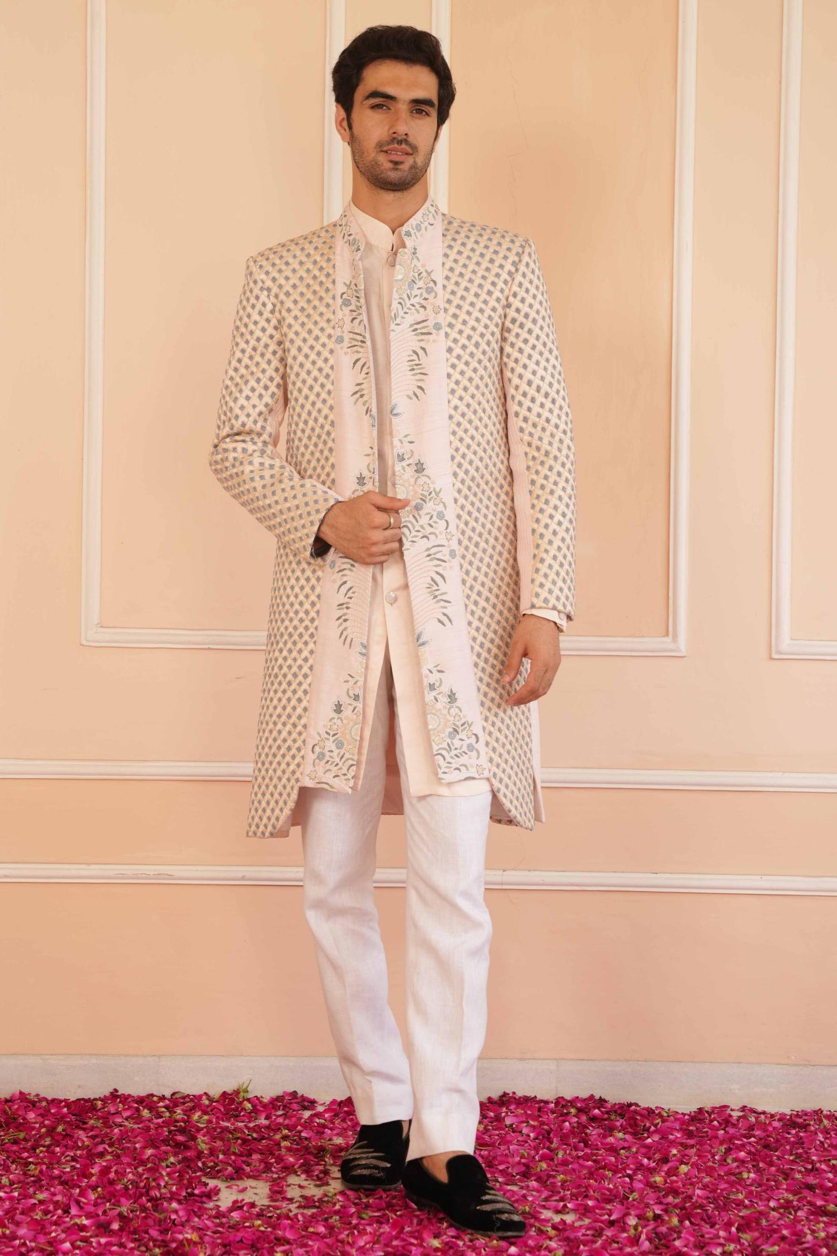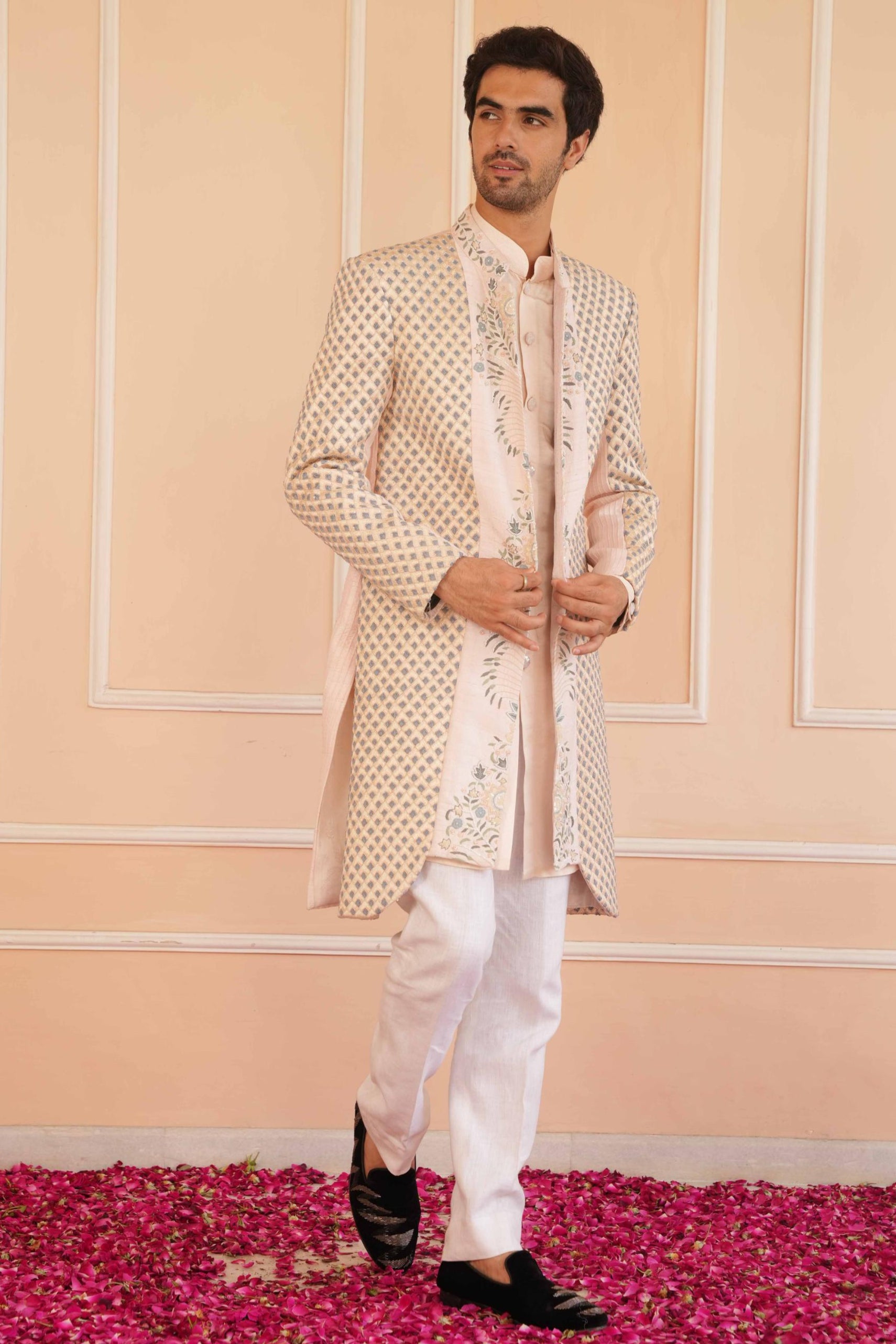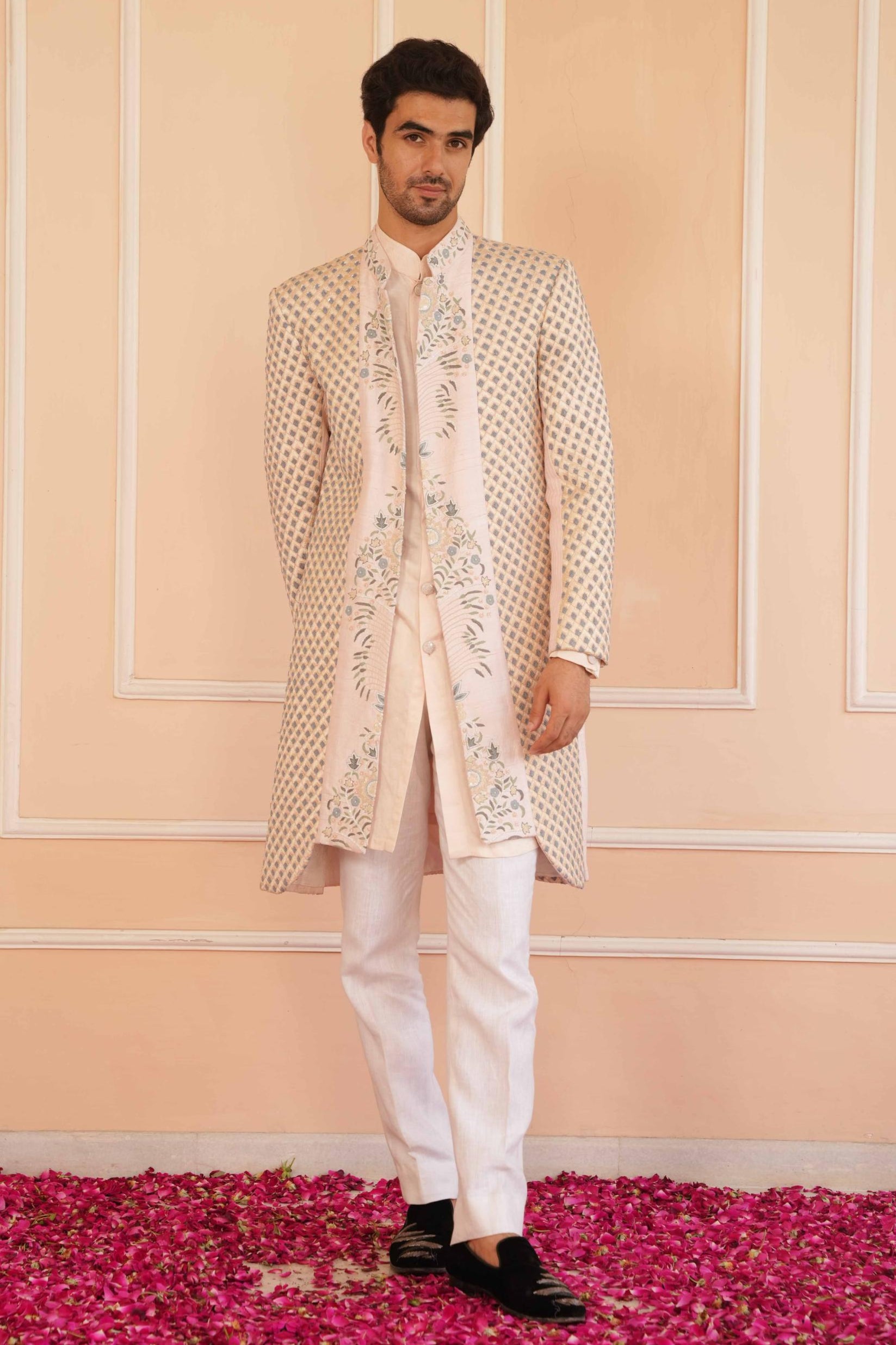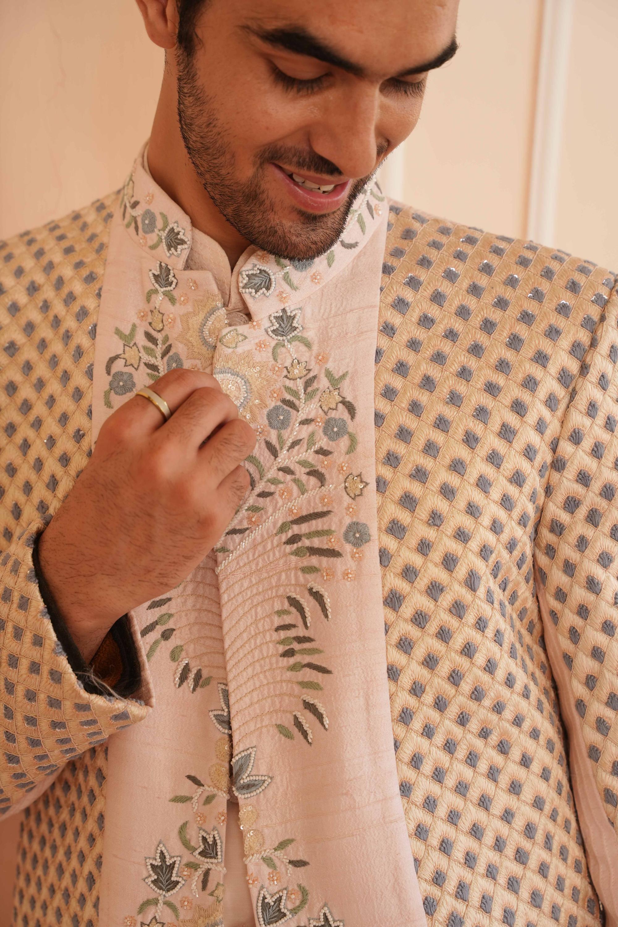 The Beige Dil Se Ayan Zardosi Sherwani is a masterpiece of tradition, grace, and grandeur. Crafted in an elegant beige tone and enriched with intricate zardosi embroidery, this sherwani embodies timeless royalty with a modern edge. Named Ayan, meaning “grace” and “blessing,” the ensemble reflects the quiet confidence of a man who honors heritage with poise and presence. Ideal for grooms, formal wedding rituals, or traditional celebrations. Style with a matching stole, churidar, and handcrafted mojris for a look that’s regal, rooted, and unmistakably dil se.