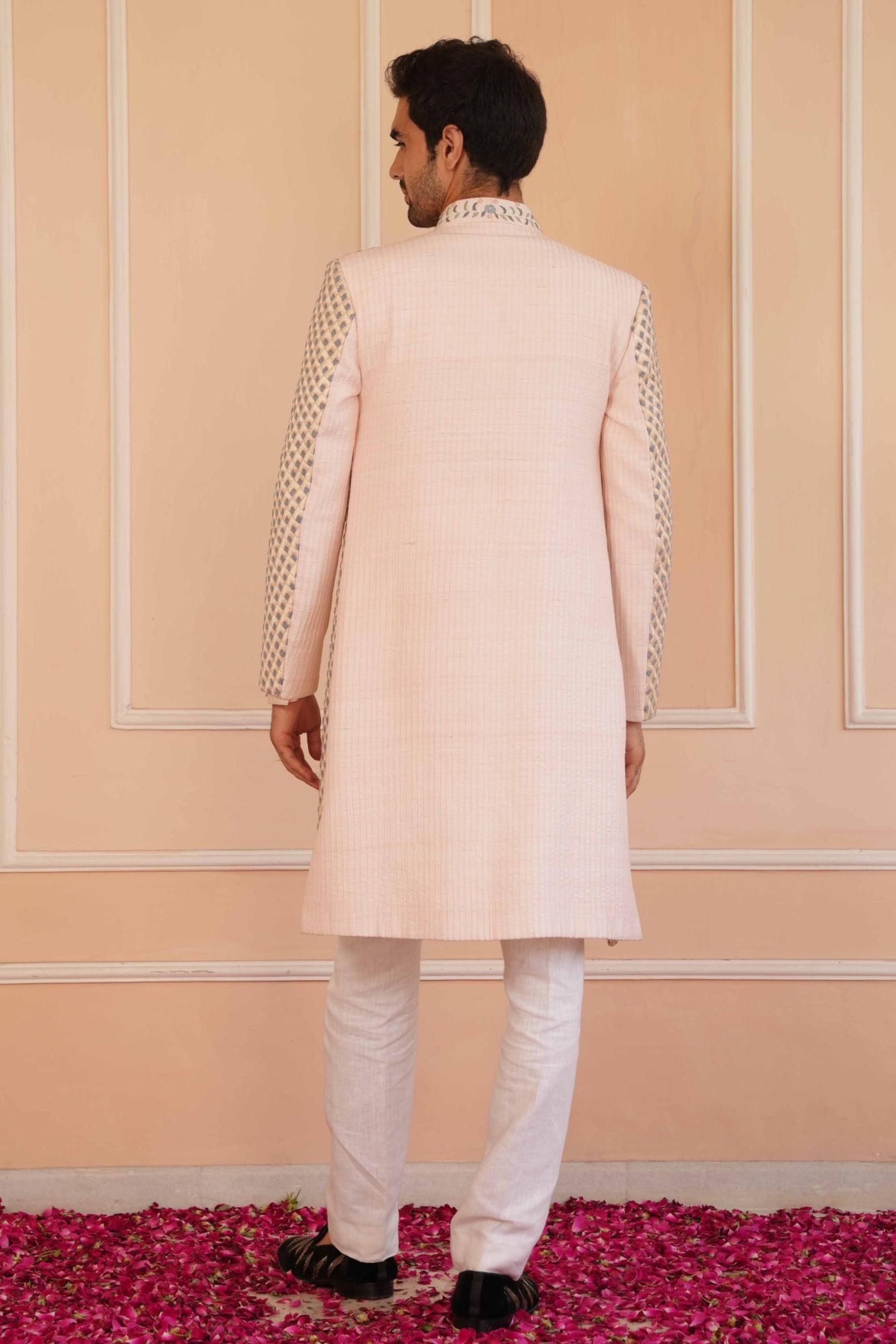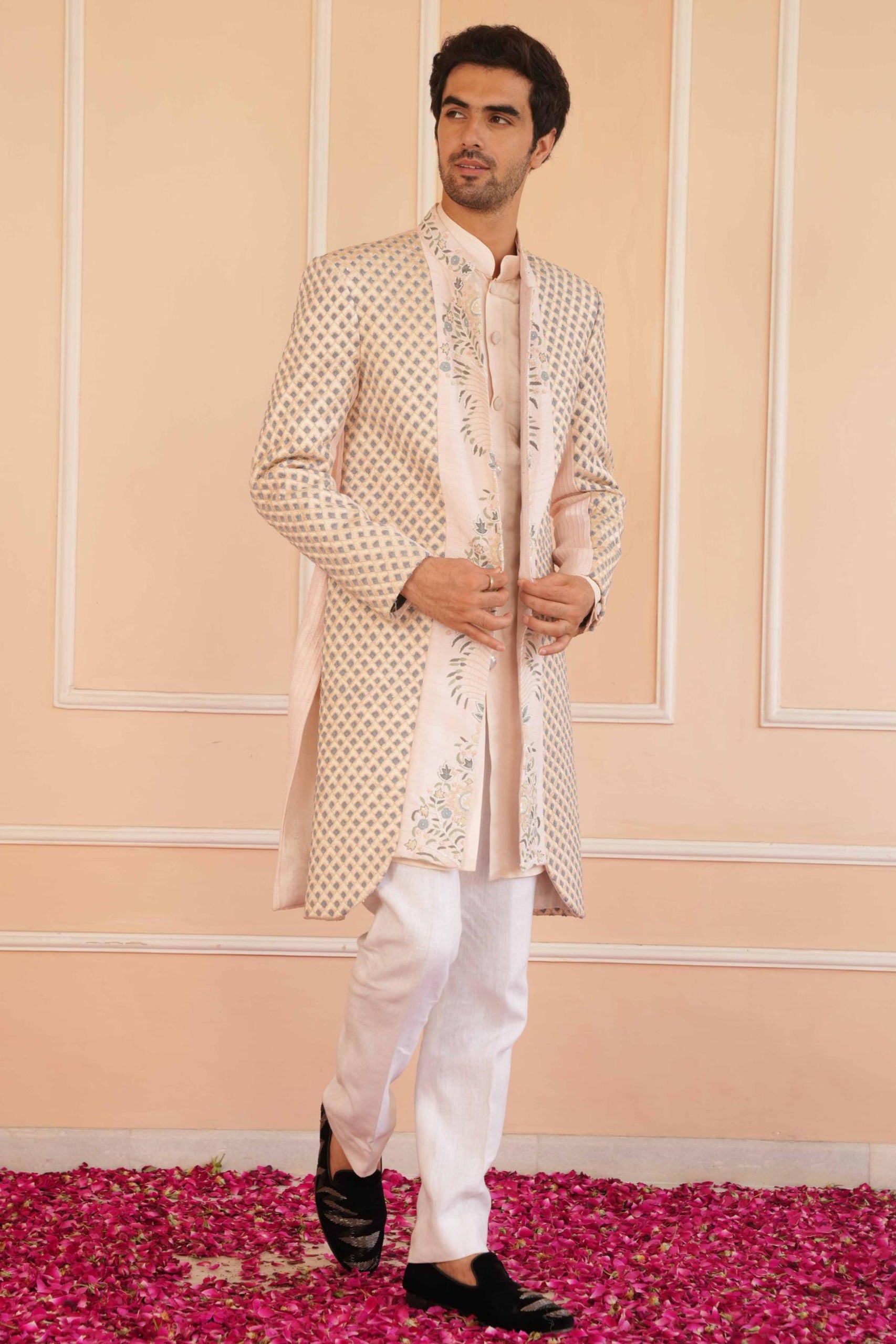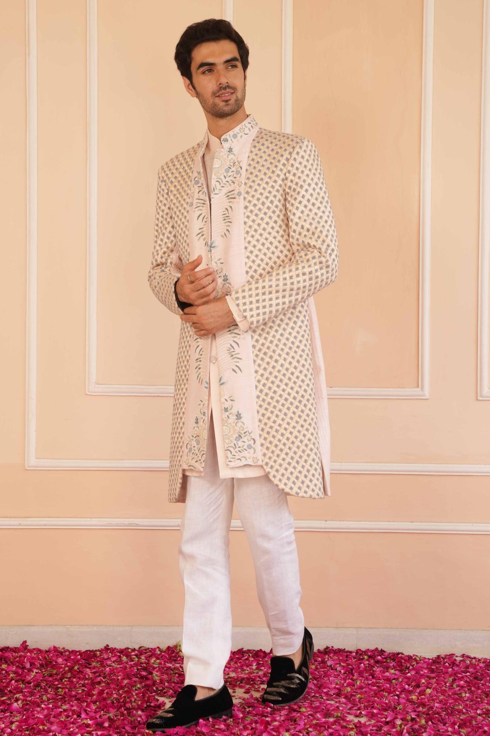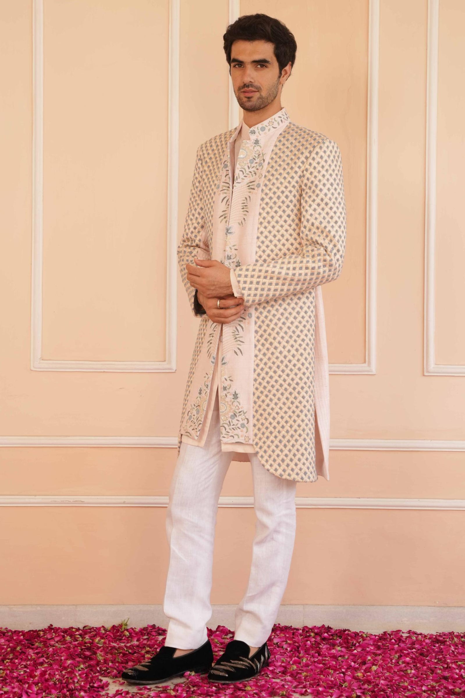 The Beige Dil Se Ayan Zardosi Sherwani is a masterpiece of tradition, grace, and grandeur. Crafted in an elegant beige tone and enriched with intricate zardosi embroidery, this sherwani embodies timeless royalty with a modern edge. Named Ayan, meaning “grace” and “blessing,” the ensemble reflects the quiet confidence of a man who honors heritage with poise and presence. Ideal for grooms, formal wedding rituals, or traditional celebrations. Style with a matching stole, churidar, and handcrafted mojris for a look that’s regal, rooted, and unmistakably dil se.
