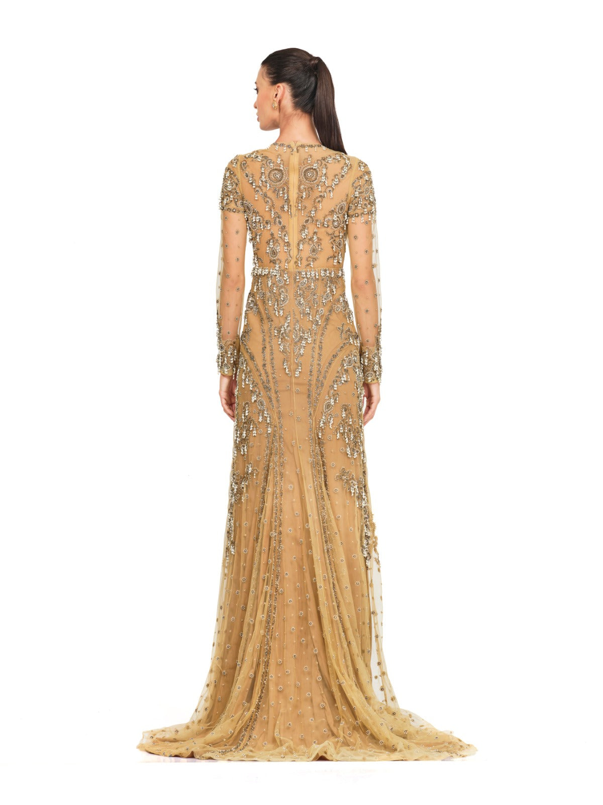 This elegant beige dress features beautifully embroidered full sleeves with intricate pearl hand embroidery, adding a touch of luxurious detail. The sheer panels enhance its sophistication, creating a subtle yet captivating effect. Finished with a center back zip closure, this dress combines classic grace with modern refinement, making it a perfect choice for any special occasion.