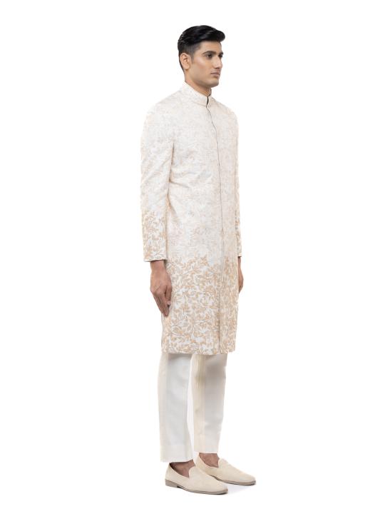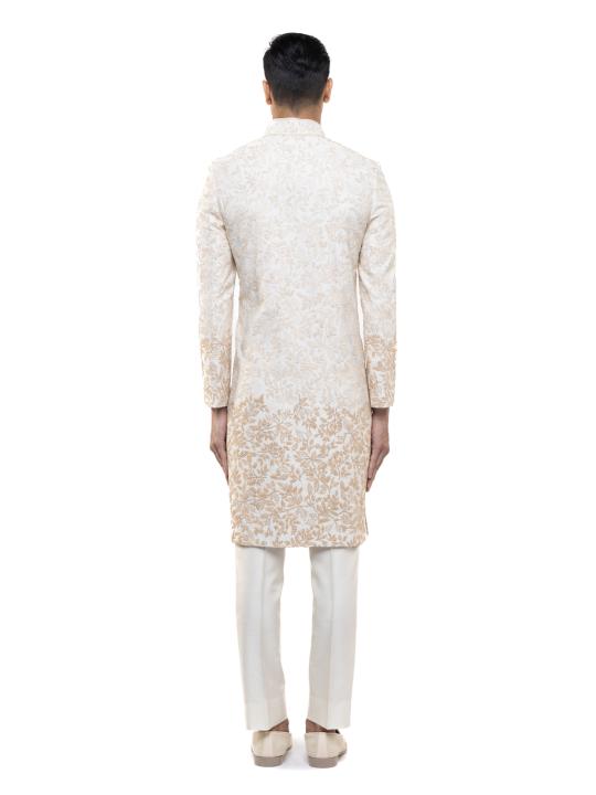 Elegant and contemporary, this Ivory & Beige Silk Faded Hand Embroidery Sherwani Set blends subtle artistry with timeless design. Made from luxurious silk, it features softly faded hand embroidery that adds depth and sophistication without overpowering. The stand collar, concealed placket, and Mother of Pearl buttons enhance its refined aesthetic. With a regular fit and straight hem, this sherwani is perfect for modern grooms and formal celebrations.