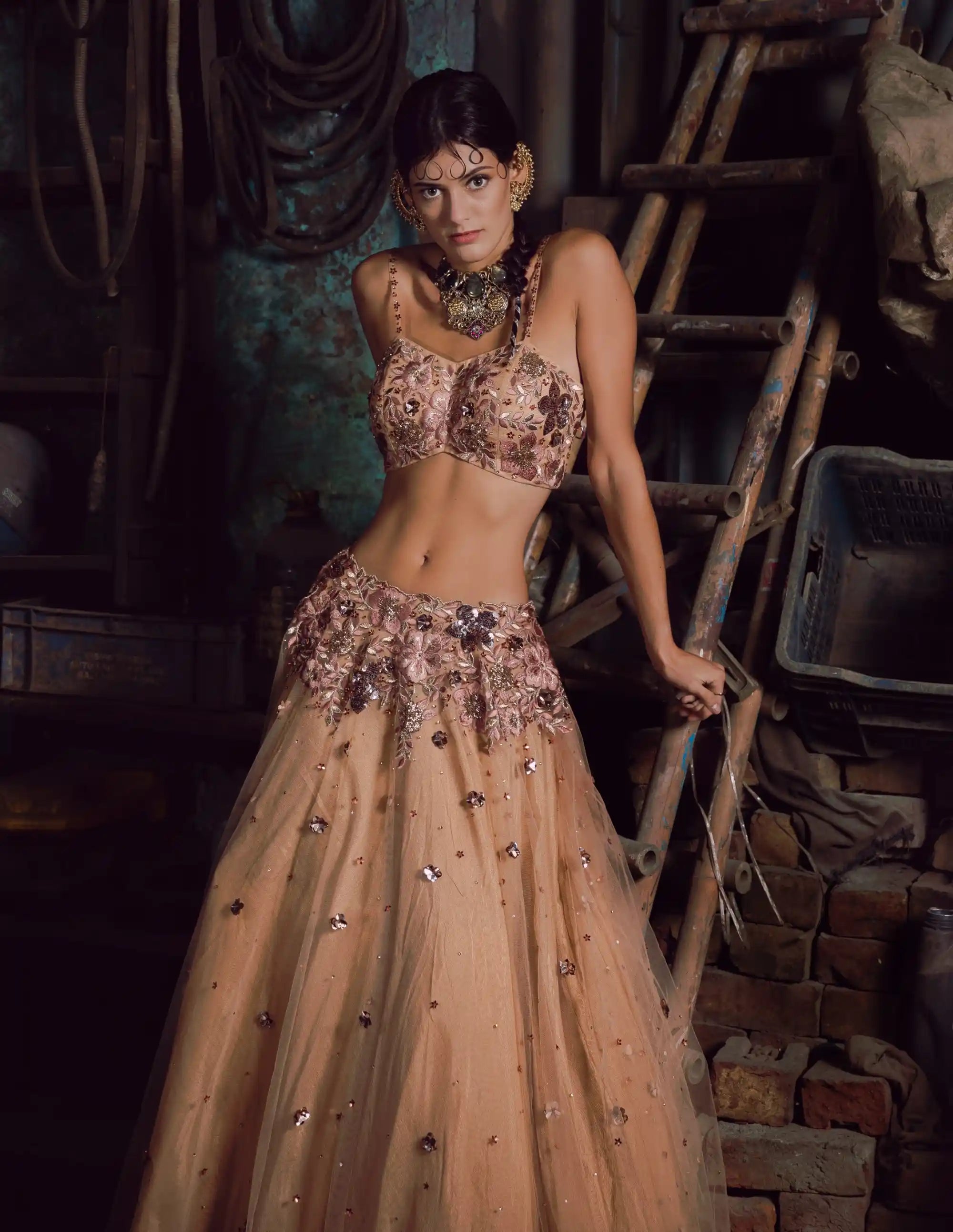 The floral embroidery v-hem bustier is a stylish piece that effortlessly elevates your festive wardrobe. When paired with an embroidered waist lehenga and a matching floral border dupatta, this outfit creates a cohesive look that is both chic and elegant. Perfect for weddings or parties, its intricate details ensure you look stunning while feeling confident.