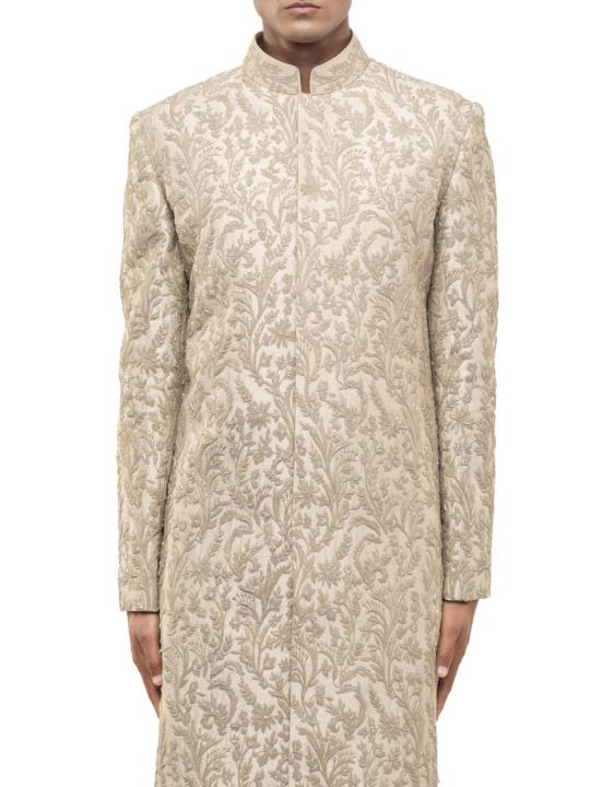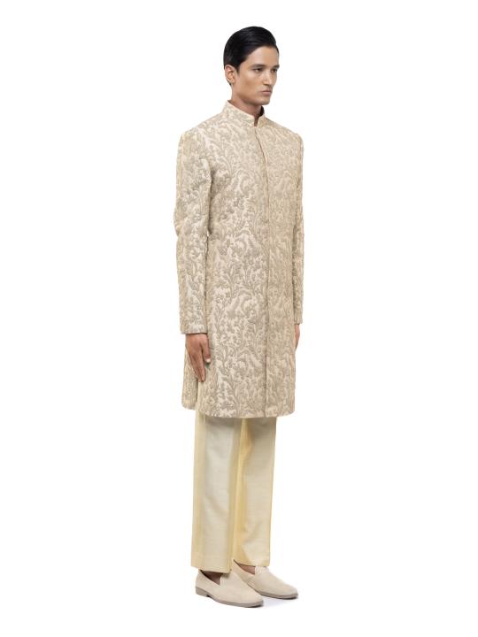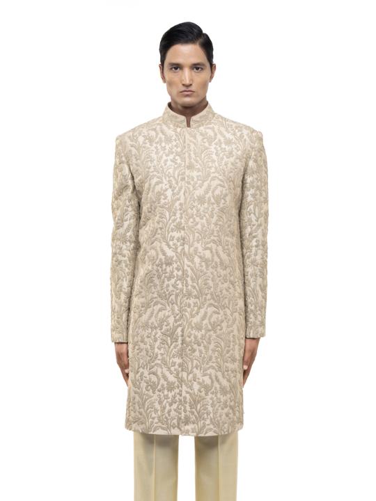 Refined and regal, this Beige Silk Floral Hand Embroidery Sherwani Set exudes timeless charm. Crafted in luxurious silk, it features delicate floral hand embroidery that adds a touch of elegance and artistry. Designed with a stand collar, concealed placket, and Mother of Pearl buttons, the regular fit and straight hem ensure a flattering silhouette. Ideal for weddings, engagements, or festive occasions with a classic twist.