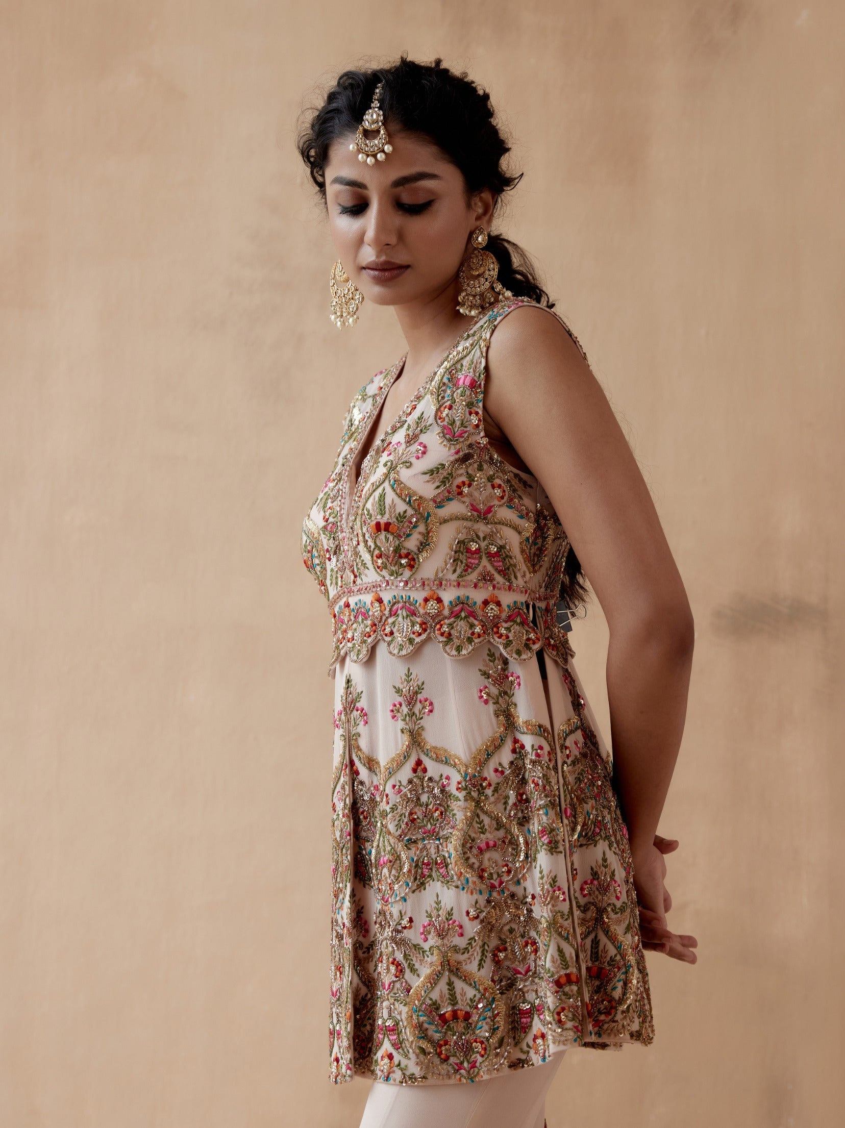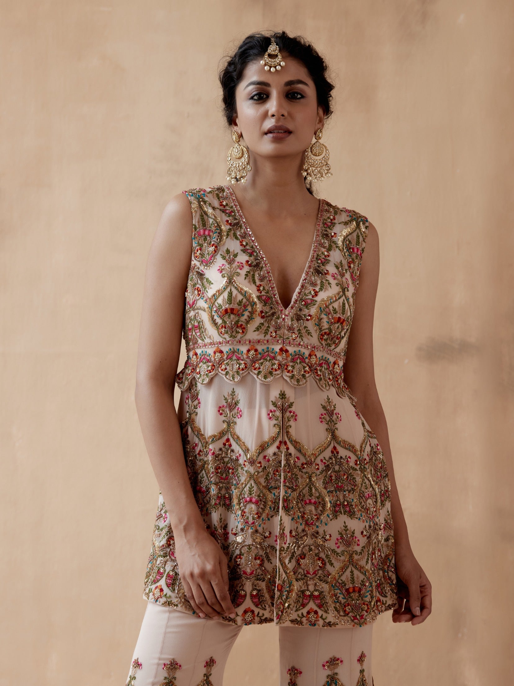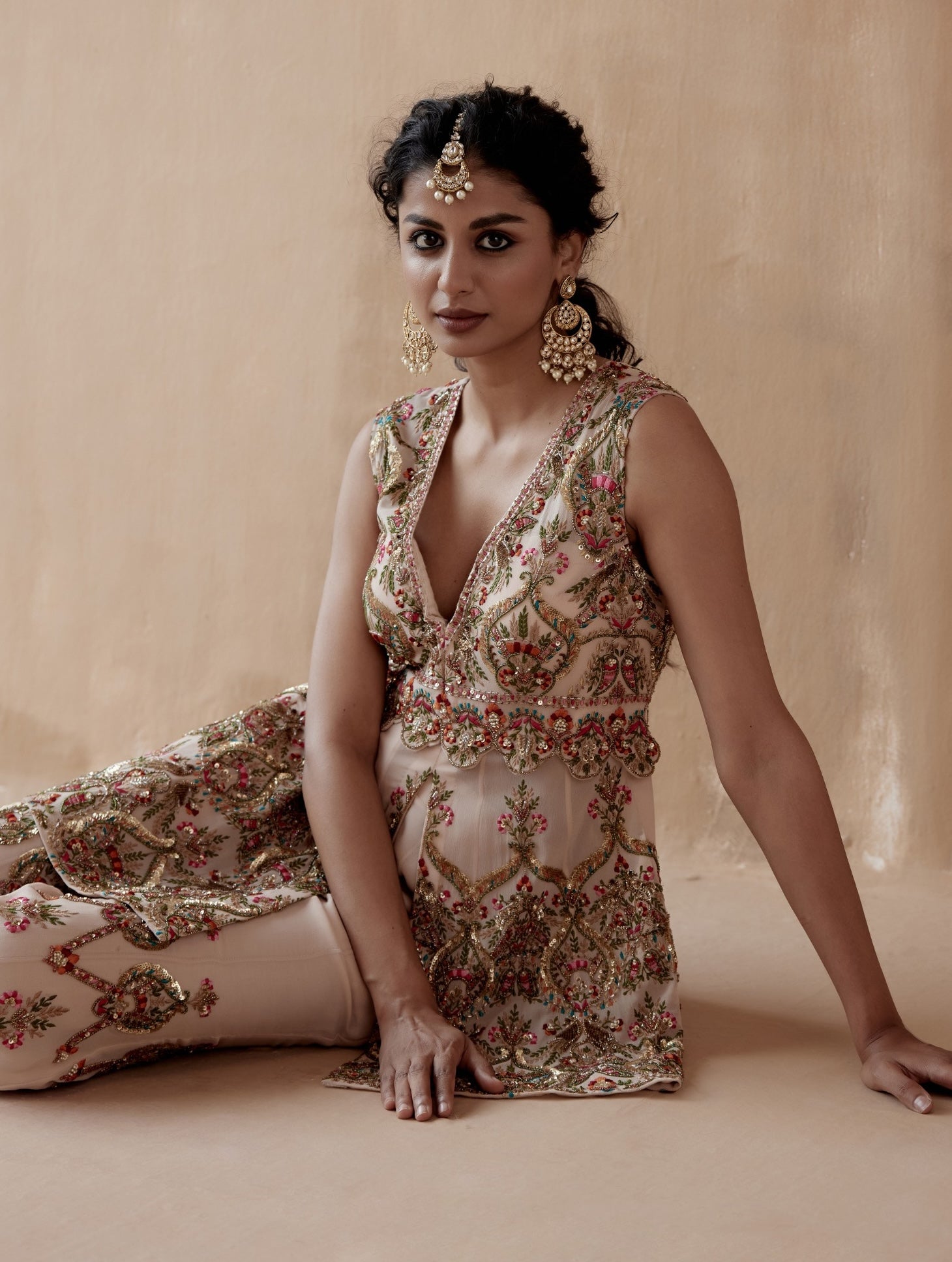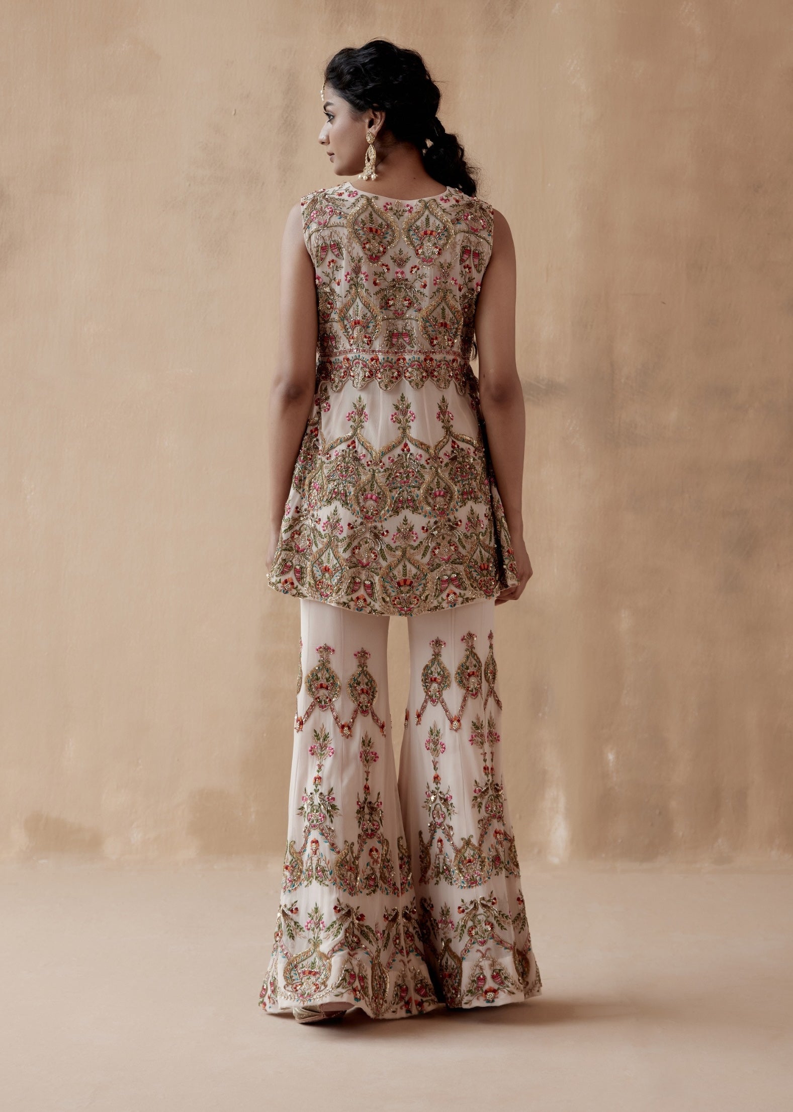 Discover refined elegance with our exquisite beige kurta, beautifully adorned with intricate floral thread embroidery and highlighted with an array of sophisticated embellishments. This timeless kurta is perfectly paired with a matching sharara, creating a harmonious and stylish ensemble ideal for any special occasion or festive event. The subtle color and detailed craftsmanship offer a blend of classic grace and contemporary charm, making this outfit a versatile addition to your wardrobe.