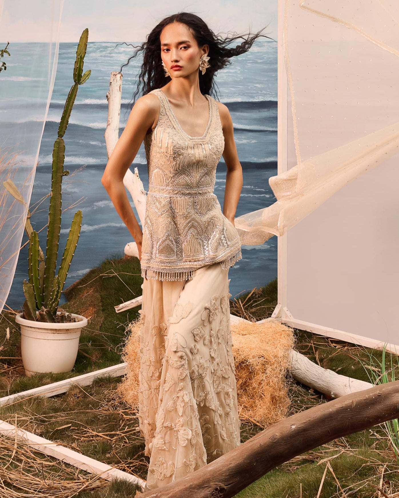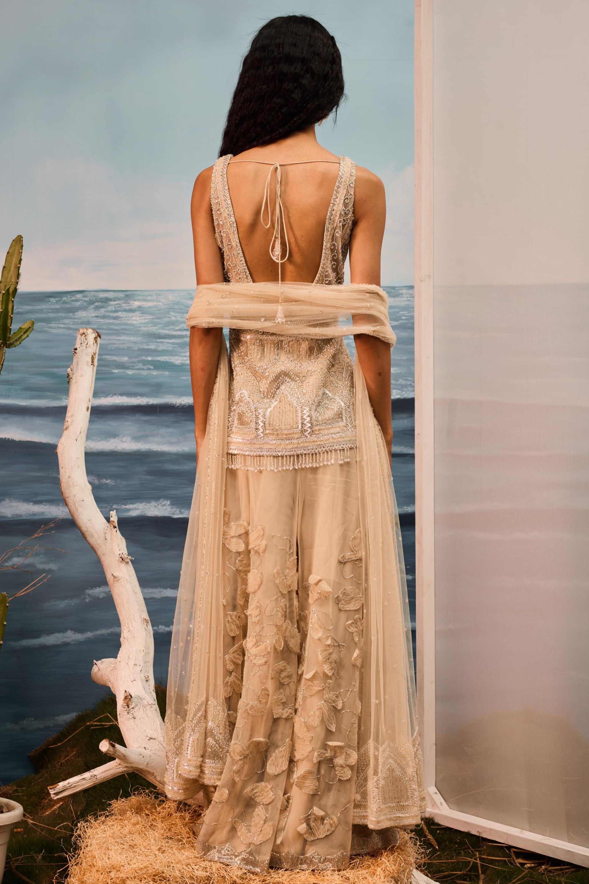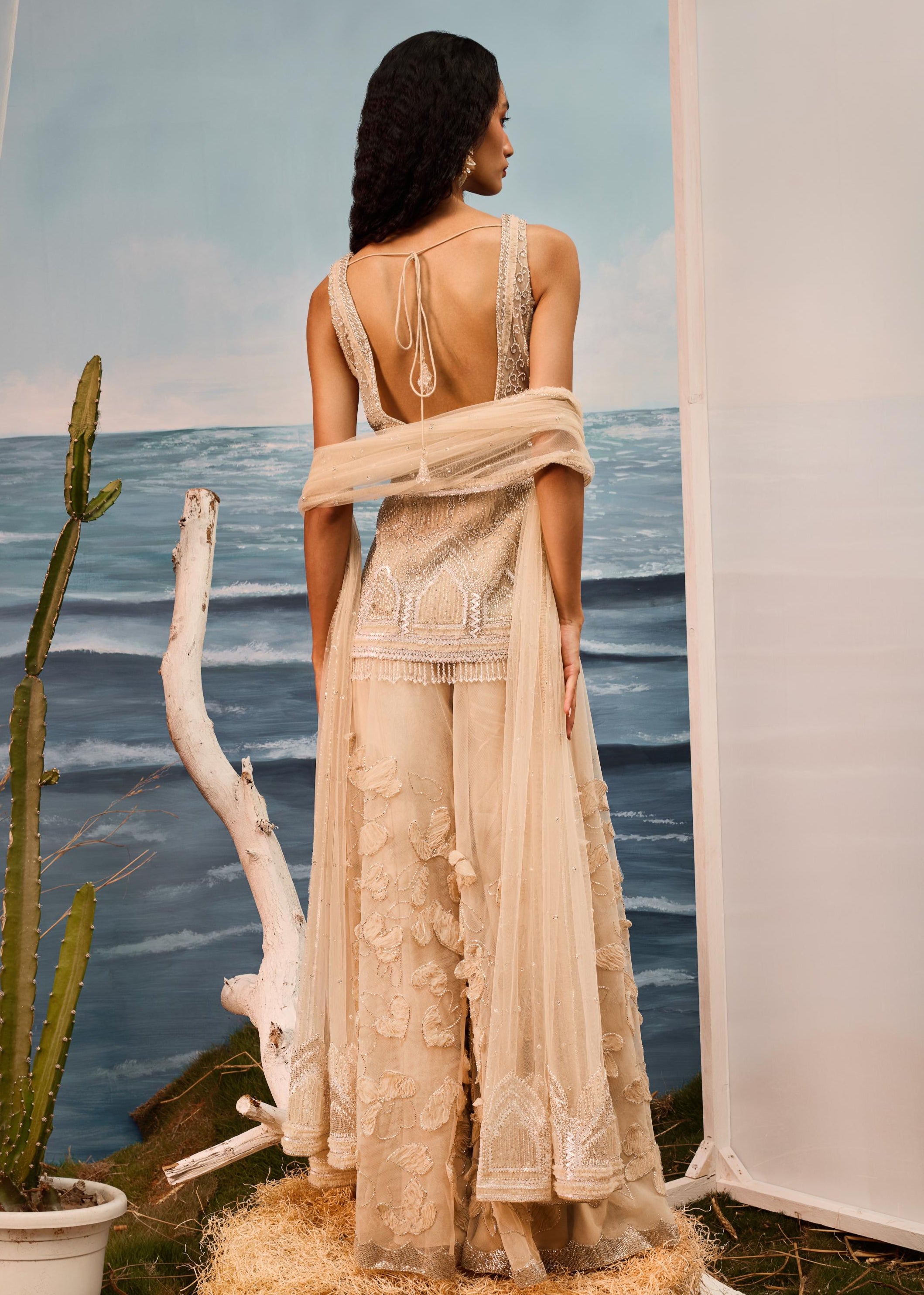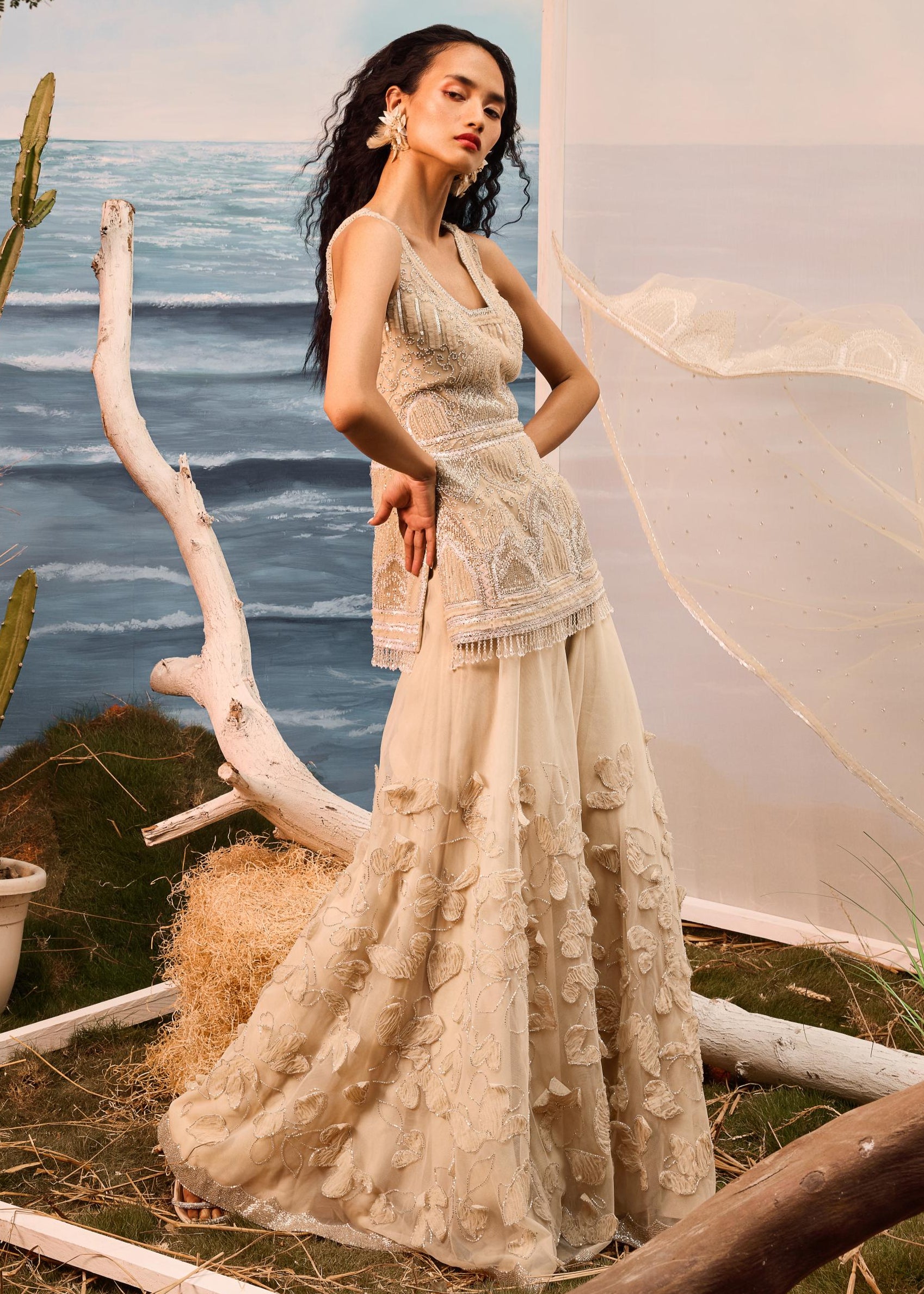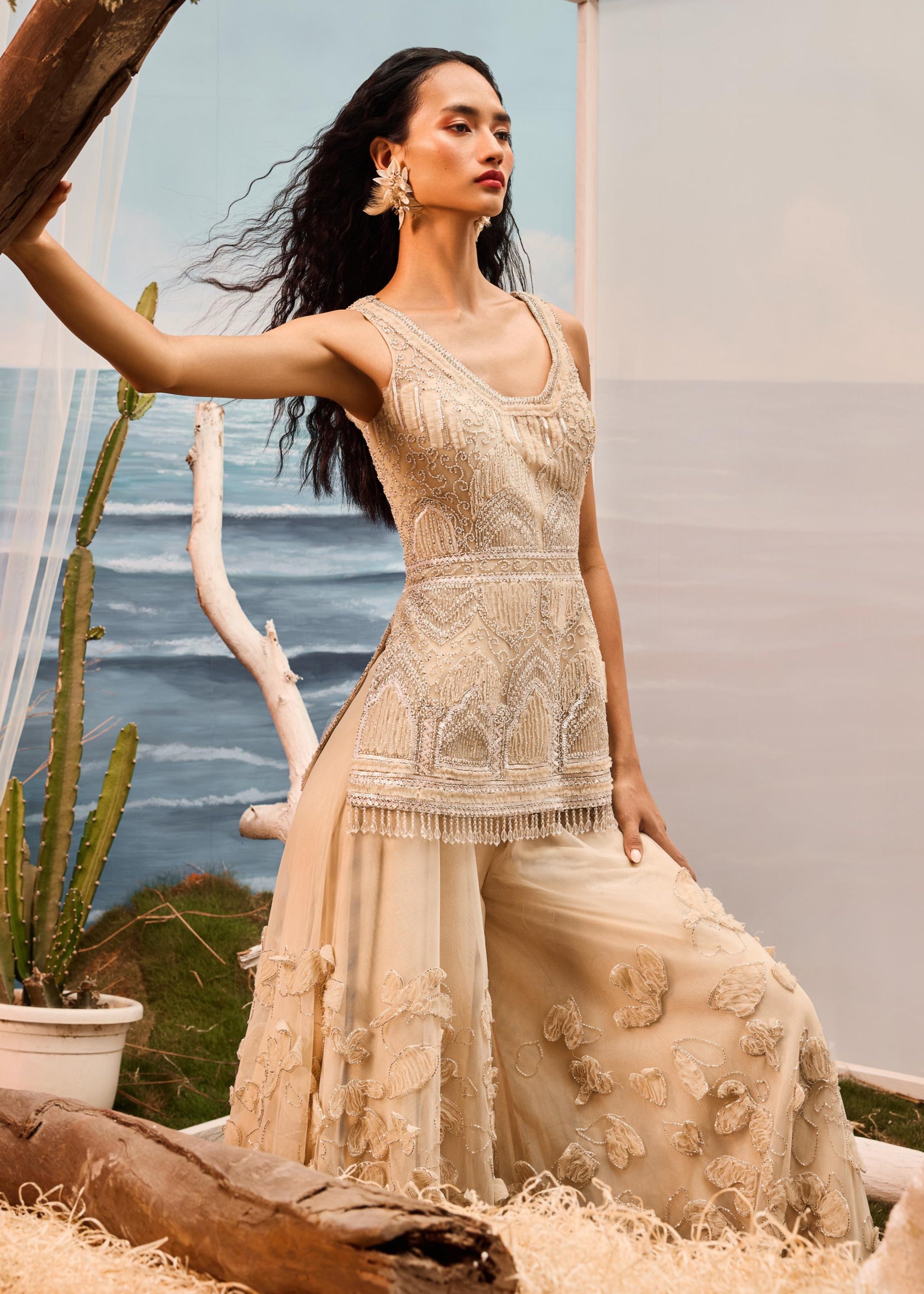 Elegant, contemporary, and full of intricate beauty, the Beige Florentia Applique Sharara Set is a stunning fusion of traditional craftsmanship and modern design. The delicate applique work on the sharara adds texture and depth, while the soft beige hue brings a sense of warmth and sophistication. The sharara's flowing silhouette creates a flattering, graceful look, making this set ideal for weddings, festive events, or formal gatherings. For the woman who loves to embrace intricate details and timeless elegance, this applique sharara set offers an unforgettable statement of style and grace.