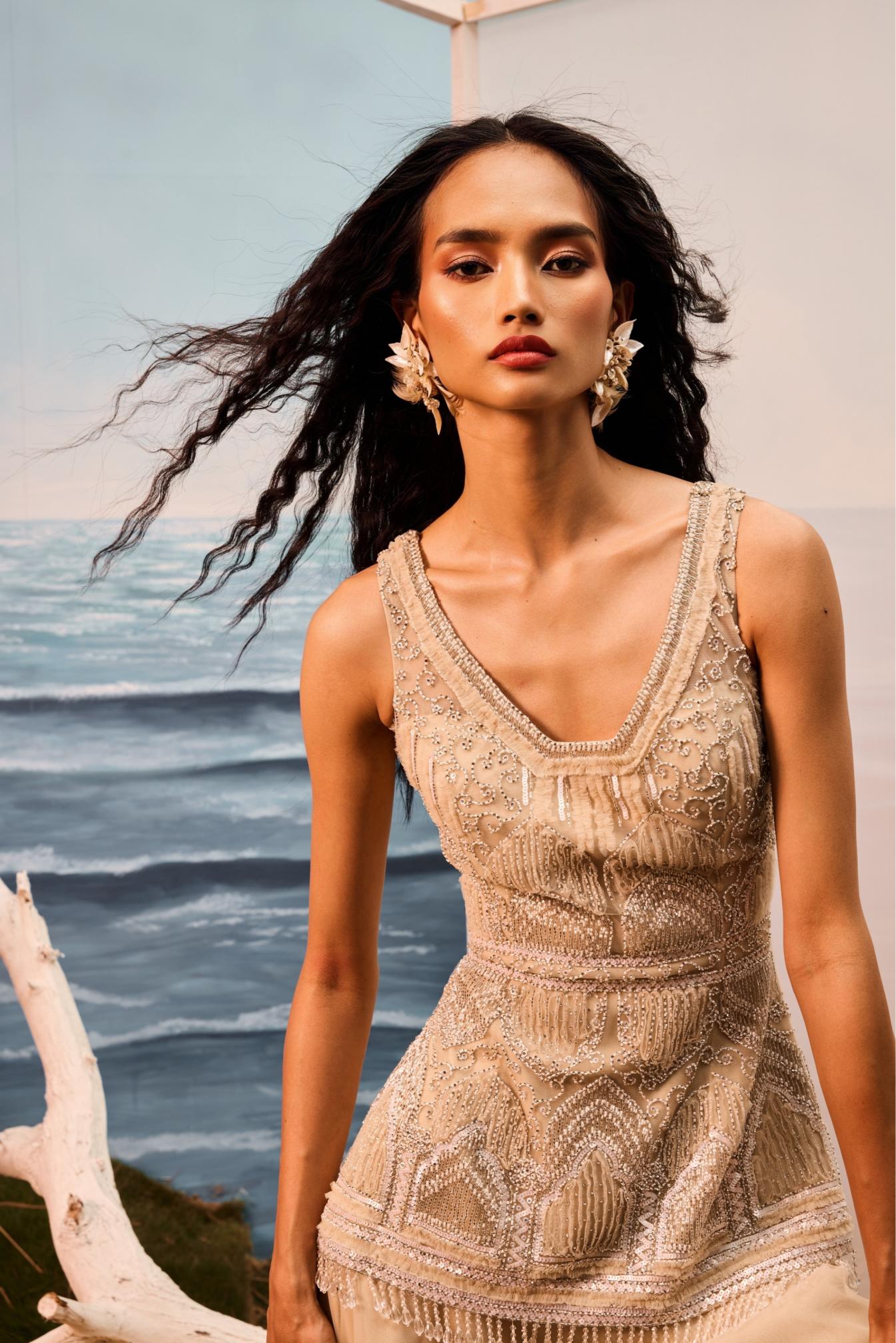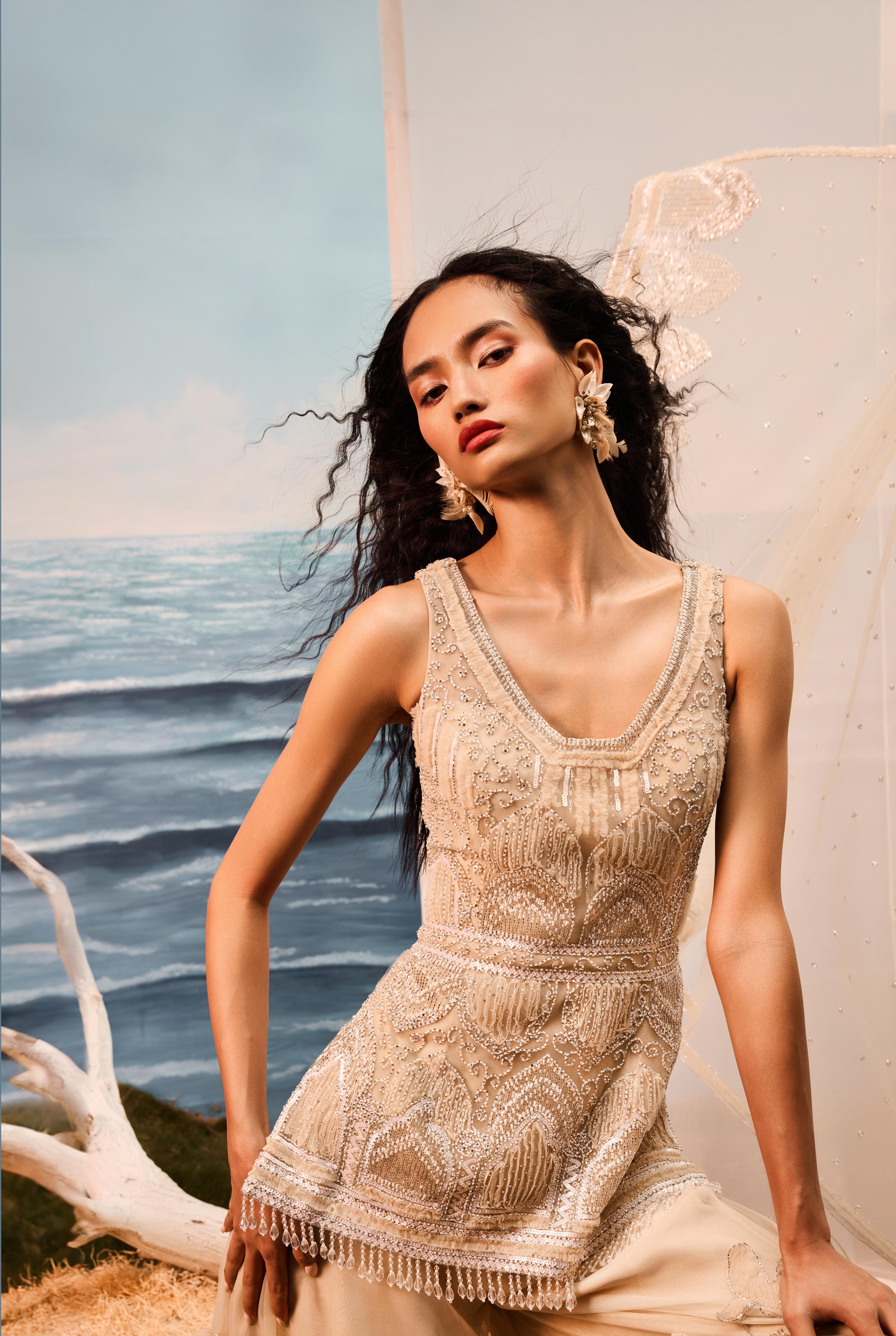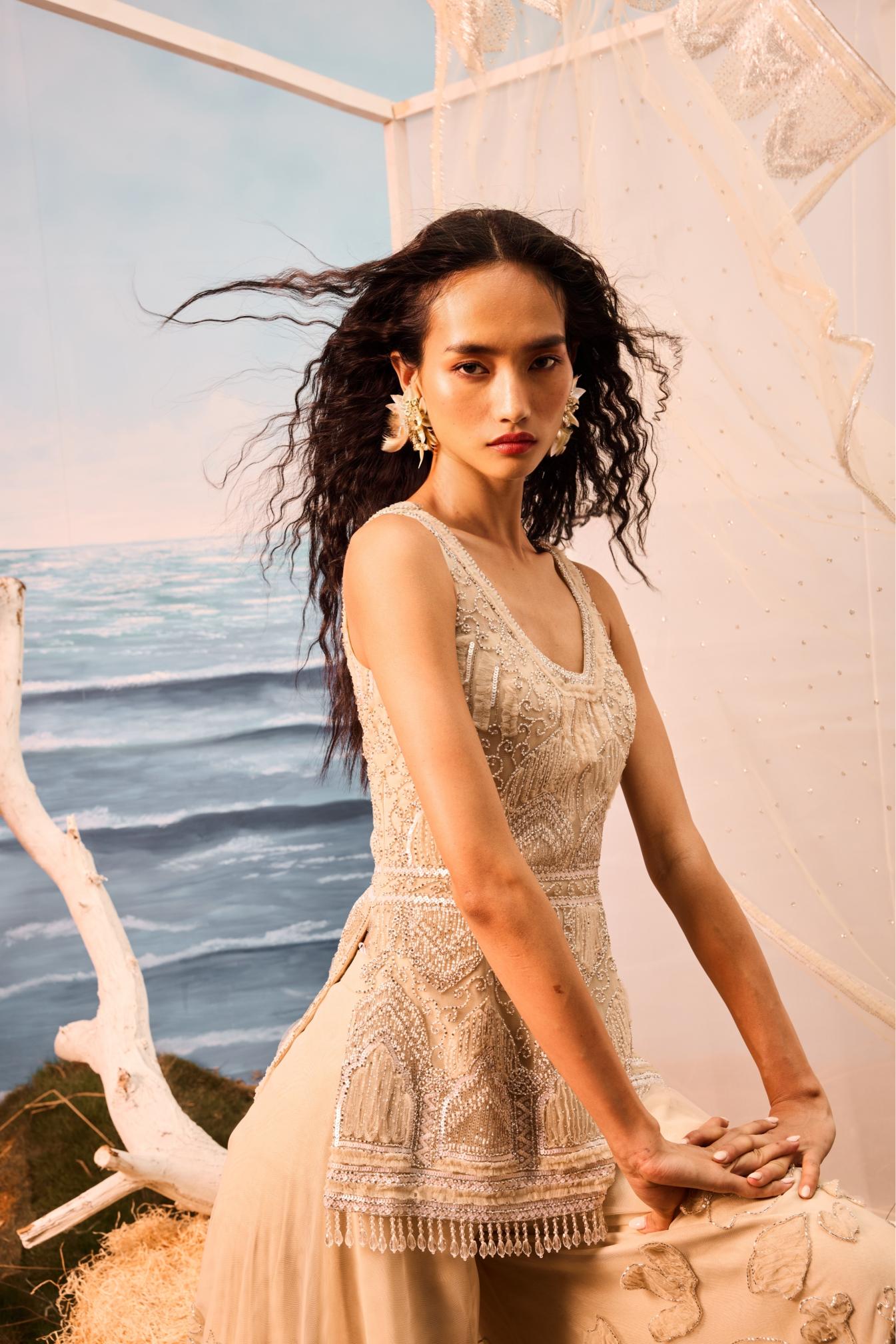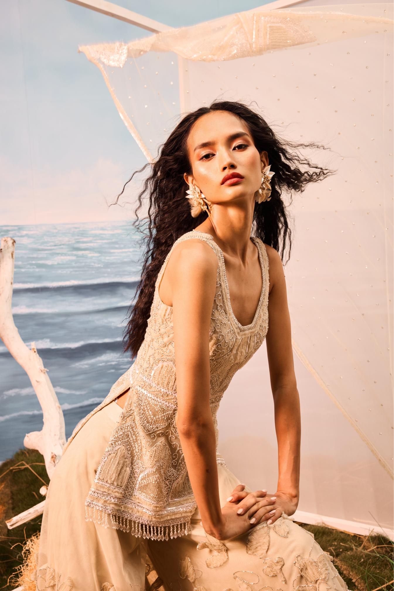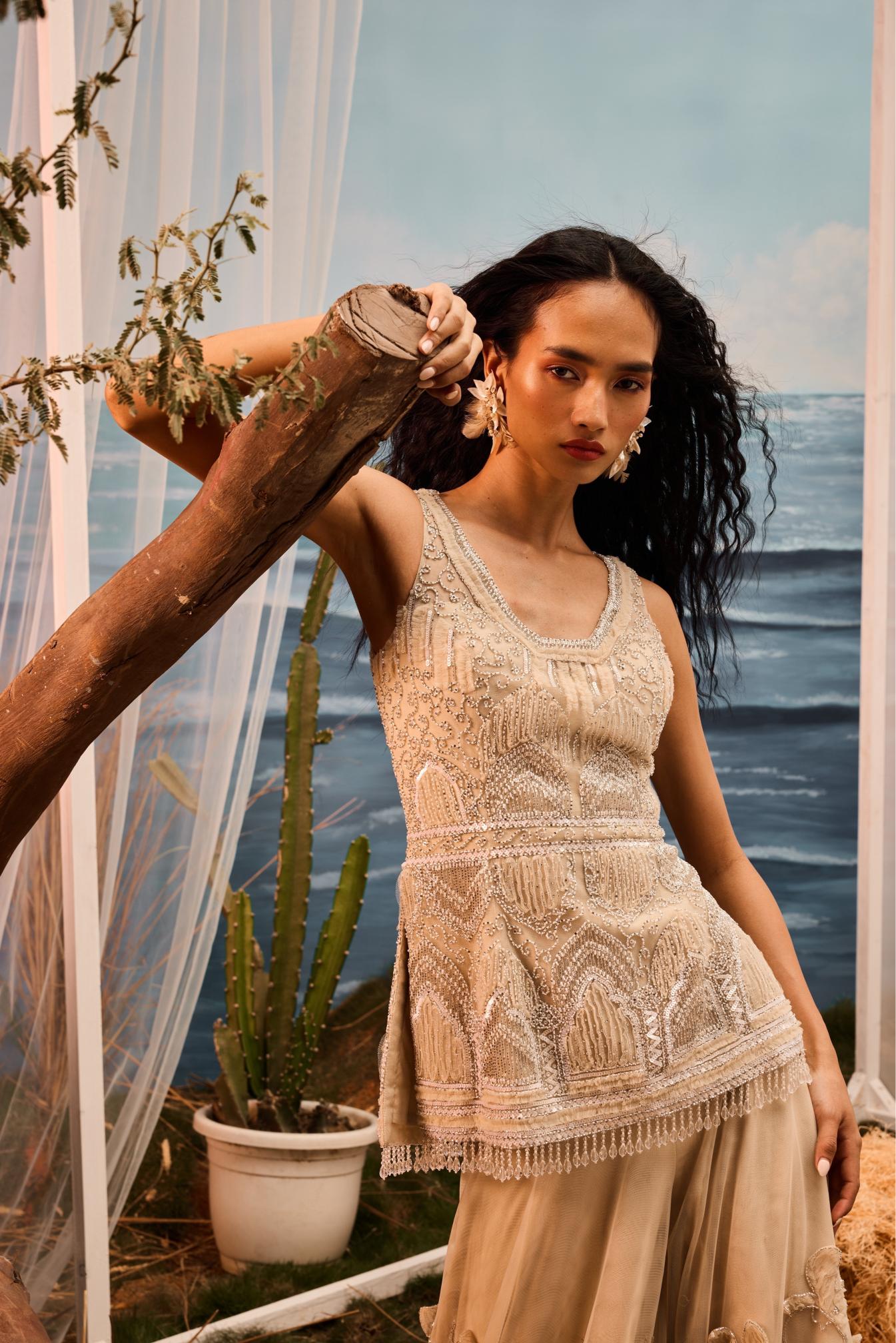 Elegant, contemporary, and full of intricate beauty, the Beige Florentia Applique Sharara Set is a stunning fusion of traditional craftsmanship and modern design. The delicate applique work on the sharara adds texture and depth, while the soft beige hue brings a sense of warmth and sophistication. The sharara's flowing silhouette creates a flattering, graceful look, making this set ideal for weddings, festive events, or formal gatherings. For the woman who loves to embrace intricate details and timeless elegance, this applique sharara set offers an unforgettable statement of style and grace.