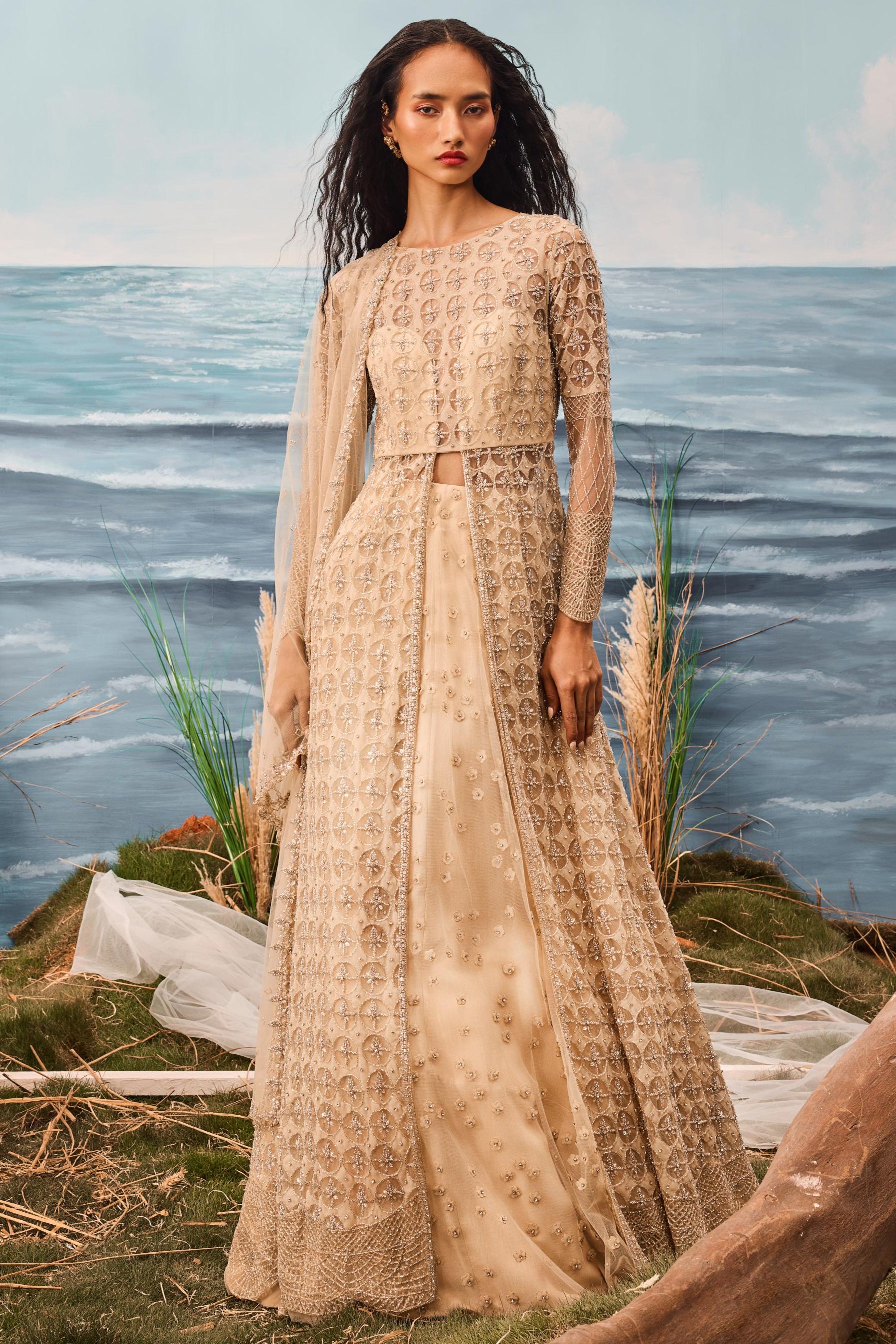 Graceful, luxurious, and full of timeless charm, the Beige Florentia Jacket with Lehenga and Dupatta is a perfect blend of modern design and traditional elegance. The beautifully tailored jacket adds a structured yet stylish layer, while the flowing lehenga exudes sophistication and movement. The soft beige hue creates an aura of understated luxury, and the dupatta drapes gracefully, completing the ensemble with a touch of elegance. Ideal for weddings, festive occasions, or formal events, this set is for the woman who loves to make a statement with refined beauty and modern flair.