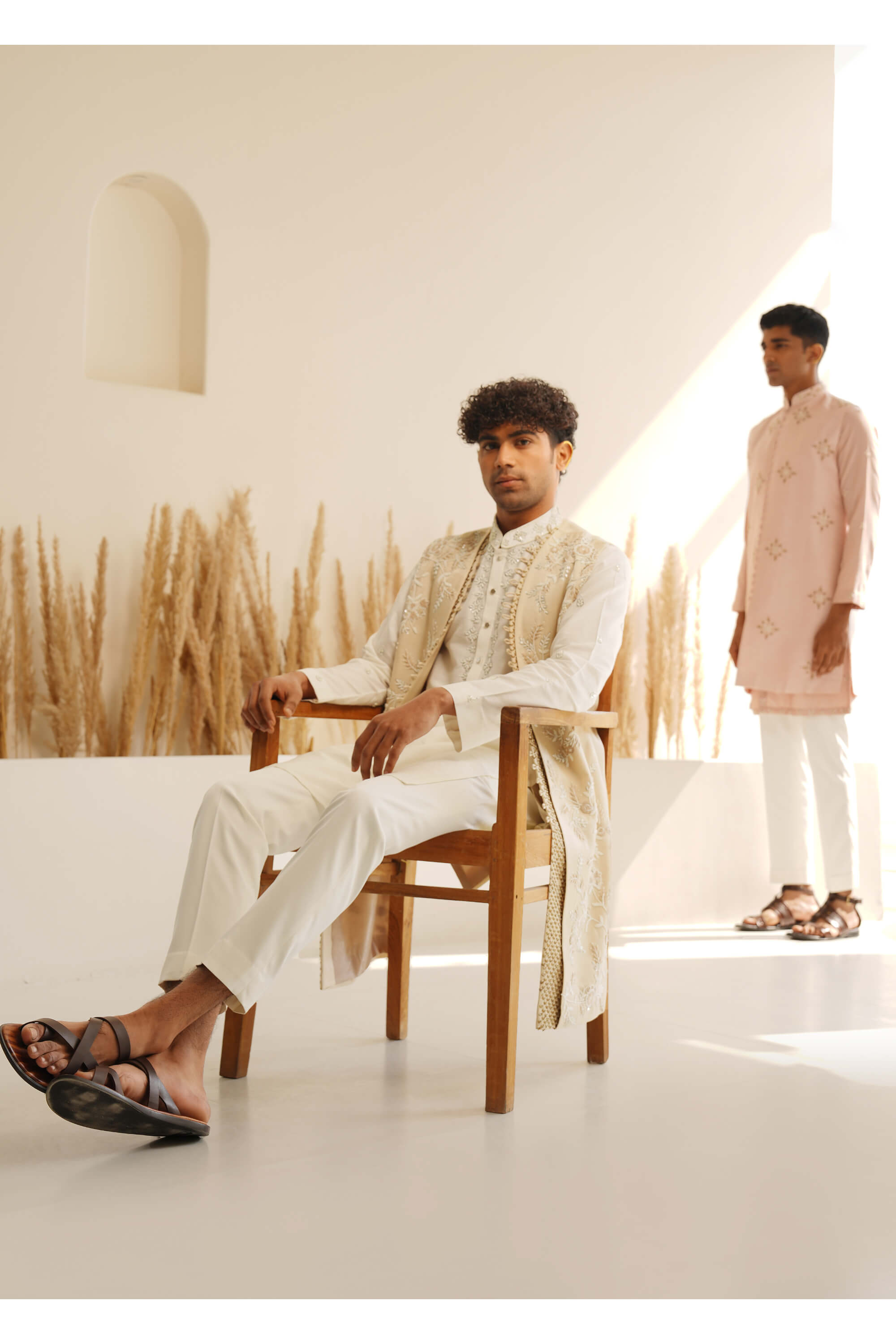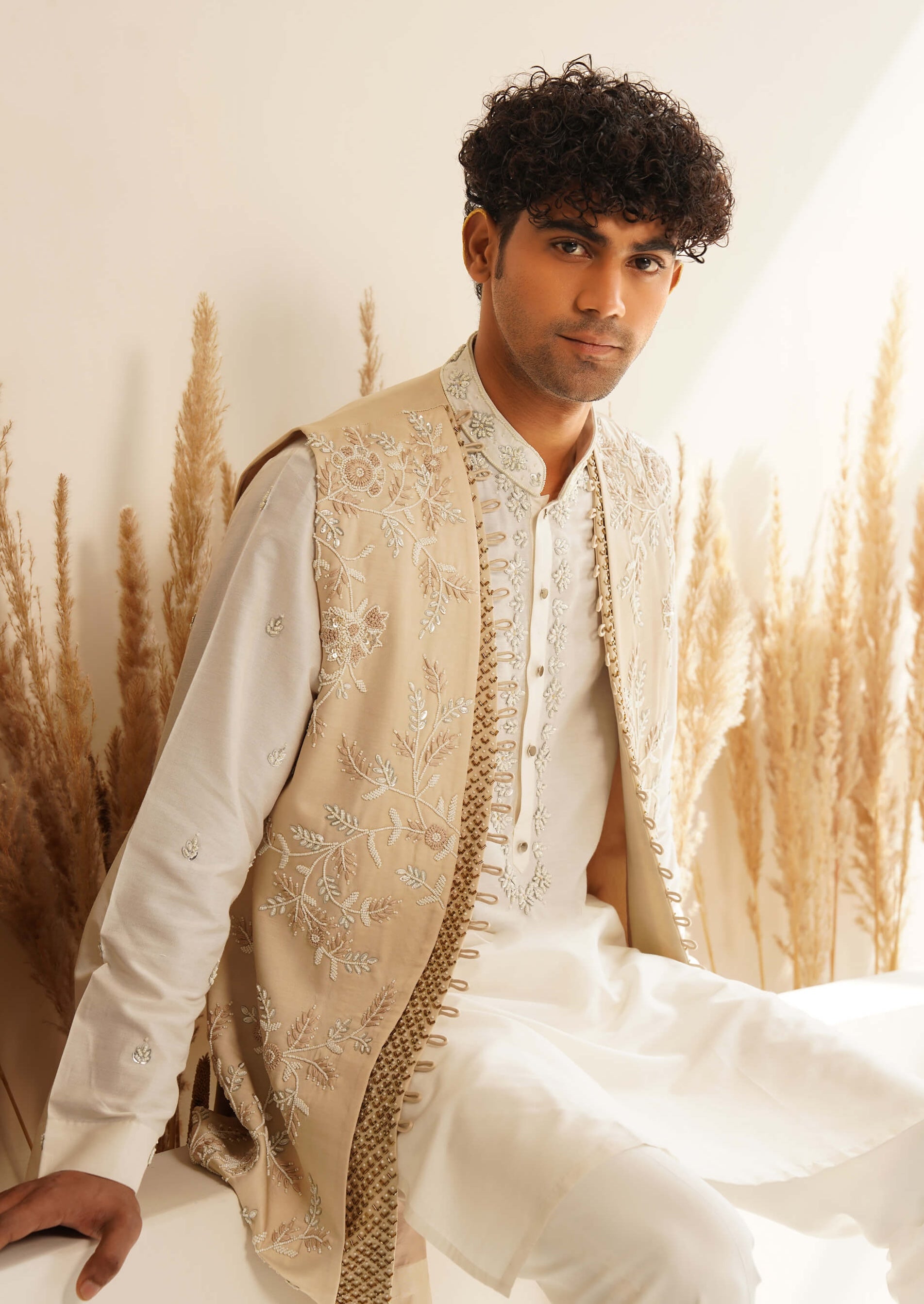 Introducing our sophisticated beige open Indo-jacket, featuring an extended placket with elegant loop details and intricate hand embroidery throughout. This timeless piece blends traditional craftsmanship with contemporary design, offering a refined and versatile addition to your wardrobe. Perfect for making a subtle yet striking statement at any special occasion, this Indo-jacket exudes both grace and sophistication.