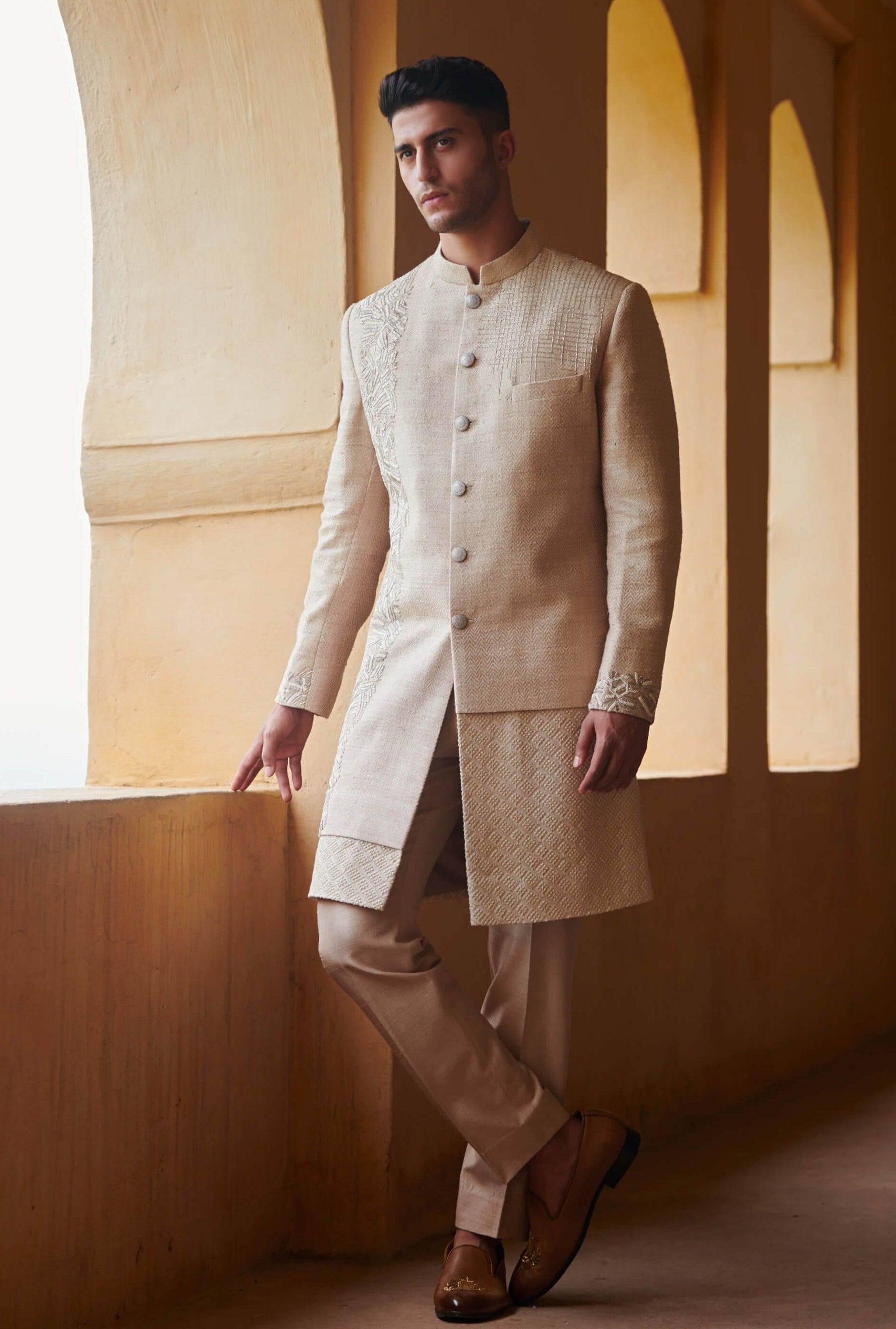 This beige Indo-western sherwani set combines traditional elegance with contemporary style. Crafted from fine fabric, the sherwani features intricate chikanari embroidery panels, adding a touch of artisanal charm. Paired with matching pants, this ensemble offers a sophisticated look that seamlessly blends classic craftsmanship with modern design. Perfect for making a refined statement at any special event.