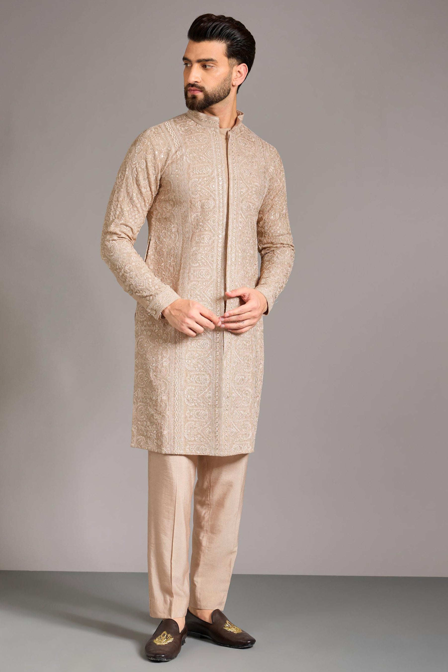 The Beige Jaal Kurta Set is an ode to subtle elegance and timeless design. Adorned with delicate jaal work, the kurta radiates an earthy charm that's both versatile and refined. Its neutral palette allows for effortless styling across occasions, whether you're attending a day event or a quiet evening gathering. Paired with matching bottoms, this set balances comfort and tradition with understated grace.