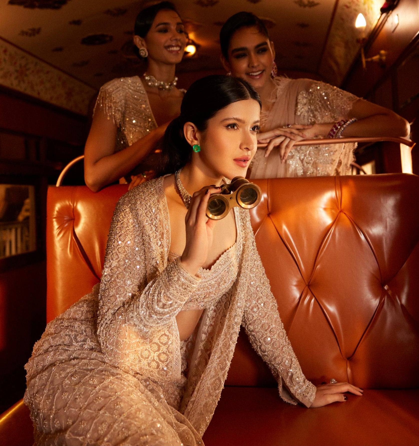 The Beige Mehfil Safarnama Jacket Set is designed to embody the grace and grandeur of festive gatherings. With its intricately embellished longline jacket, paired elegantly with a fluid lehenga and blouse, this ensemble channels quiet opulence. The soft beige hue adds a layer of timeless sophistication, making it a perfect choice for mehfils, receptions, or intimate wedding functions. Effortlessly regal and rooted in tradition, this set is an ode to celebration with soul.