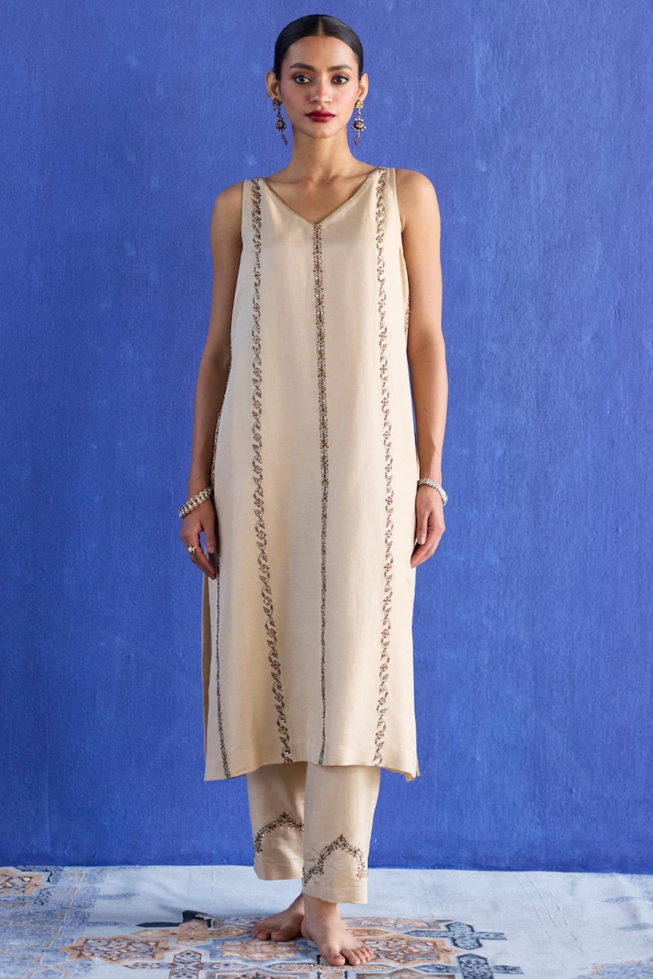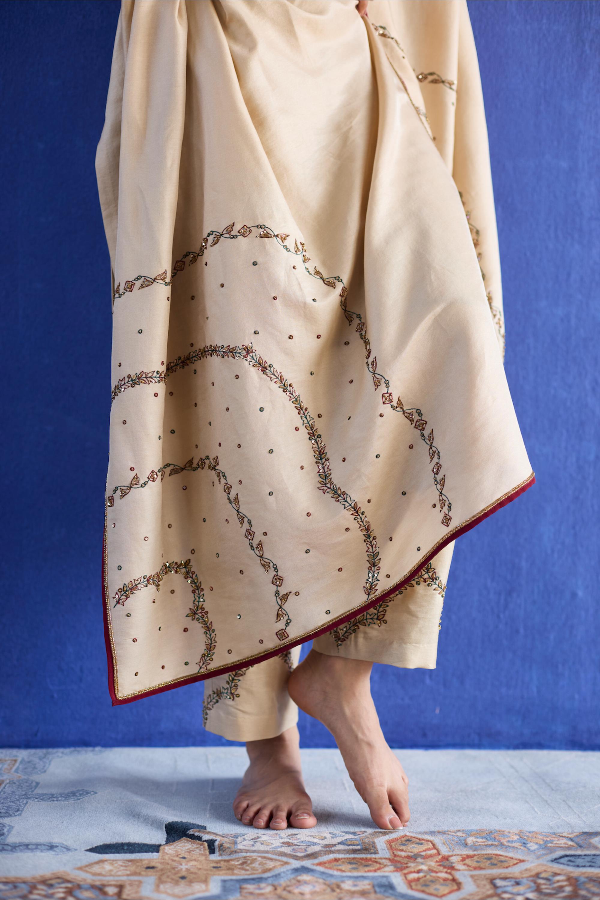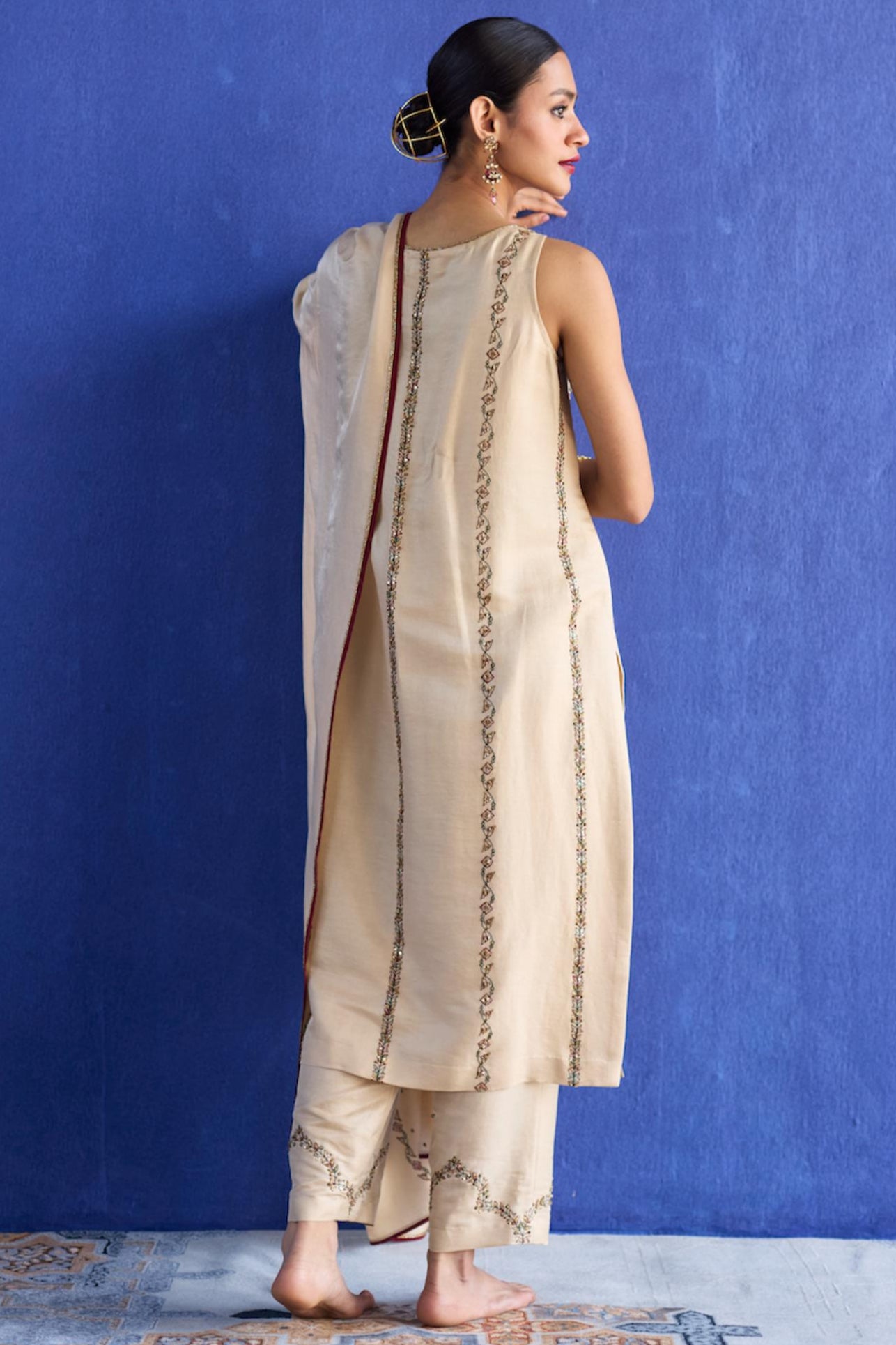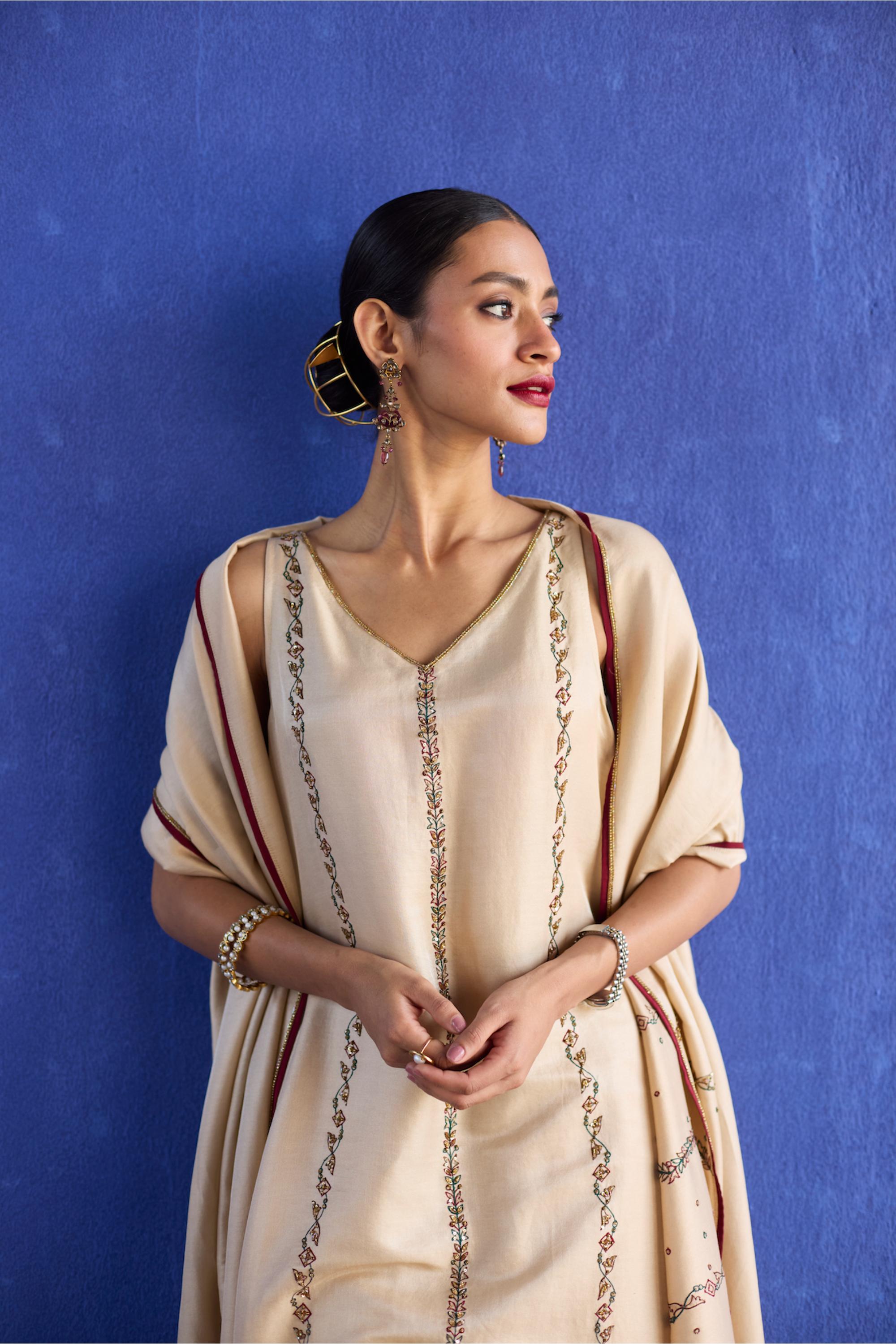 The Beige Nidhi Suit embodies timeless elegance with its refined, neutral tones and exquisite detailing. The soft beige fabric provides a versatile base, while delicate embroidery adds depth and sophistication to the design. Its flattering fit and graceful silhouette make it ideal for both daytime gatherings and evening events. The suit is effortlessly stylish yet understated, allowing you to make a subtle yet memorable statement. Pair with gold or silver accents to complete the look with a polished finish.