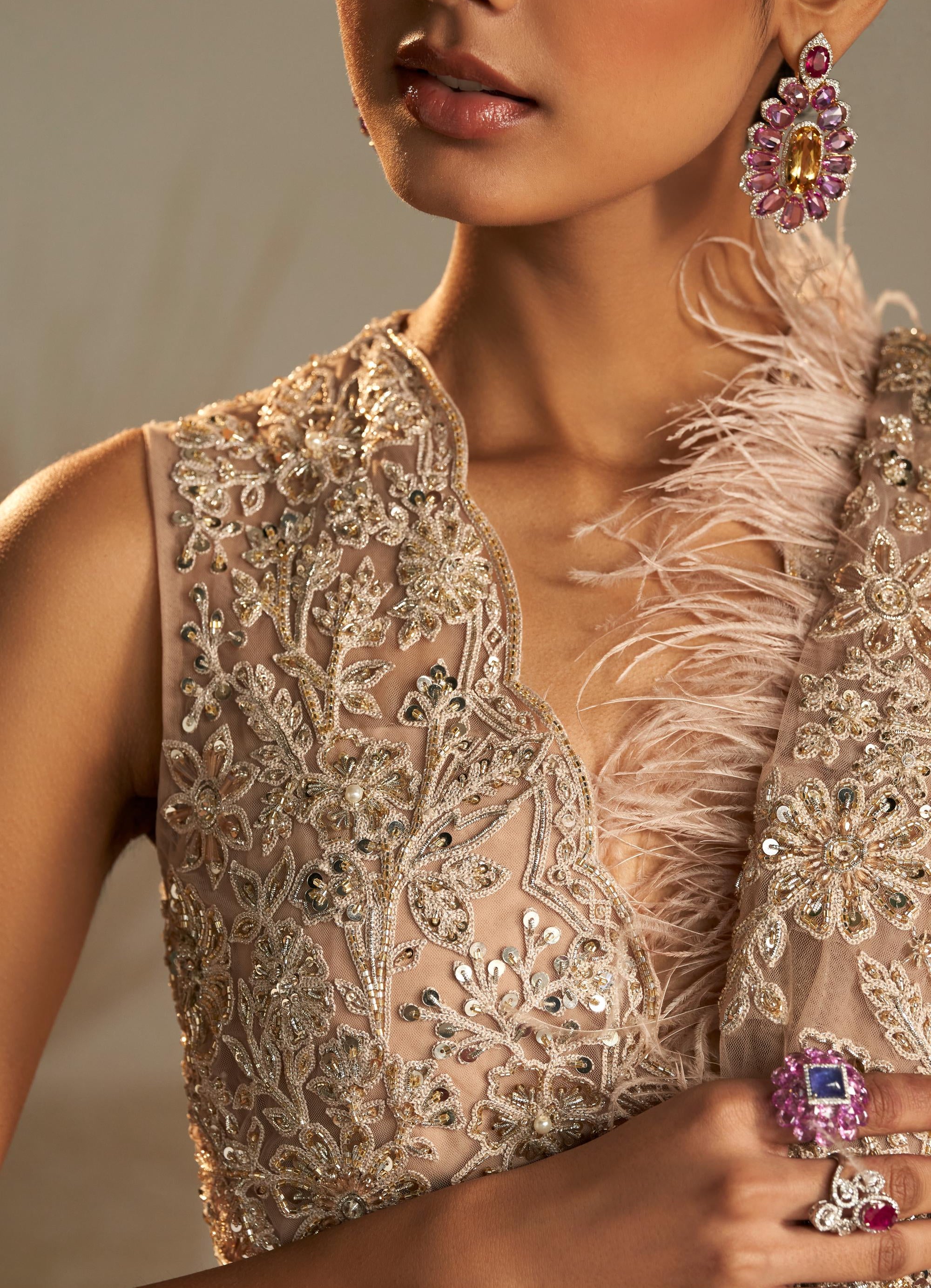 The Beige Pakeeza Safarnama Saree Set is a poetic ode to refined elegance and classic allure. Draped in a soft, soothing beige, this pre-stitched saree features delicate embroidery and graceful detailing that evoke a sense of timeless beauty. Paired with a complementing blouse, the ensemble is ideal for intimate celebrations, formal occasions, or festive evenings. Designed for the woman who carries herself with quiet confidence and a love for all things graceful and pure pakeeza, in every sense.