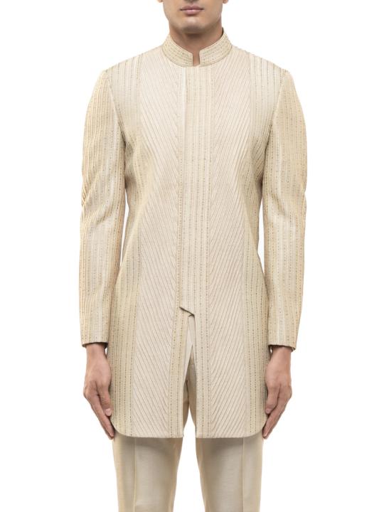 Elegant and graceful, this Champagne Silk Pintuck Embroidered Achkan Set features delicate pintuck embroidery that adds texture and sophistication. Crafted from luxurious silk, it showcases a stand collar, concealed placket, and refined Mother of Pearl buttons. The round hem and regular fit create a polished and comfortable silhouette-ideal for weddings, festive occasions, and formal celebrations.