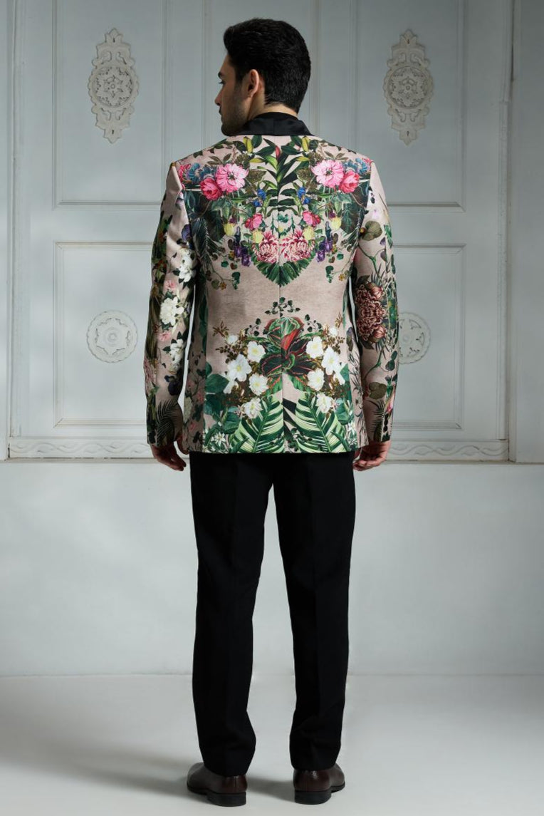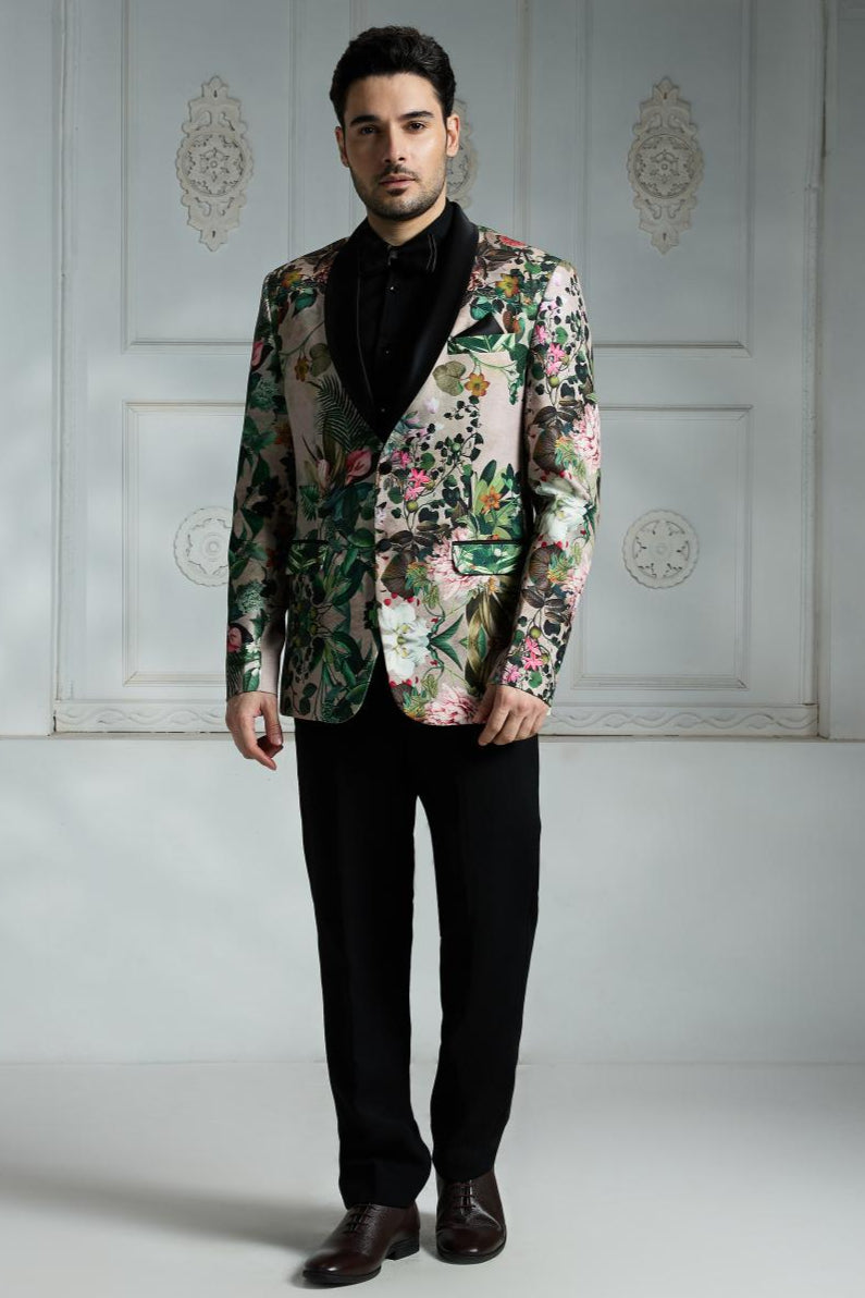 This beige floral-printed blazer is perfect for those who appreciate distinctive style and subtle elegance. The signature print adds a touch of flair, while the sleek black satin lapels create a sharp contrast that elevates the overall design. Fully lined with soft crepe fabric and featuring two interior pockets, it combines comfort with functionality. Personalize the look with a minimalist lapel pin for a modern, refined finish—ideal for events where style and individuality matter.