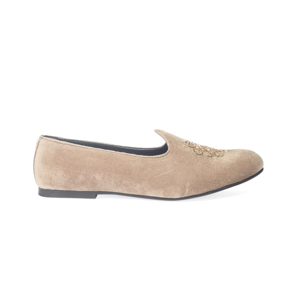 Elevate your royal style with the Beige Royal Crest Velvet Juttis, a perfect blend of heritage craftsmanship and contemporary sophistication. Designed for those who appreciate timeless luxury, these juttis feature an intricately embroidered royal crest motif on plush beige velvet, exuding a regal charm. Ideal for weddings, festive celebrations, and grand occasions, they add a touch of refined elegance to any ensemble.