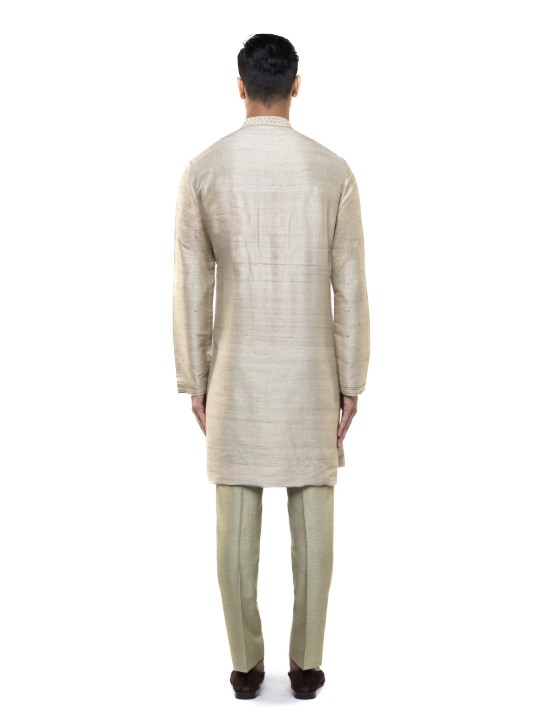 This Beige & Sage Green Linen Asymmetric Kurta Set combines earthy tones with a modern silhouette. Crafted from breathable linen, it features a stand collar, concealed placket, and elegant Mother of Pearl buttons. The asymmetric hem adds a contemporary edge, while the regular fit ensures comfort. Perfect for casual outings, festive occasions, or daytime events, this set blends style and ease effortlessly.