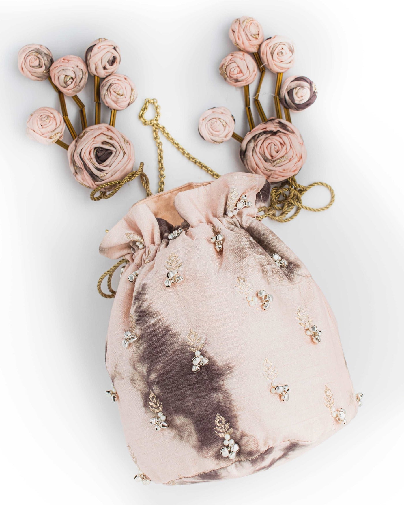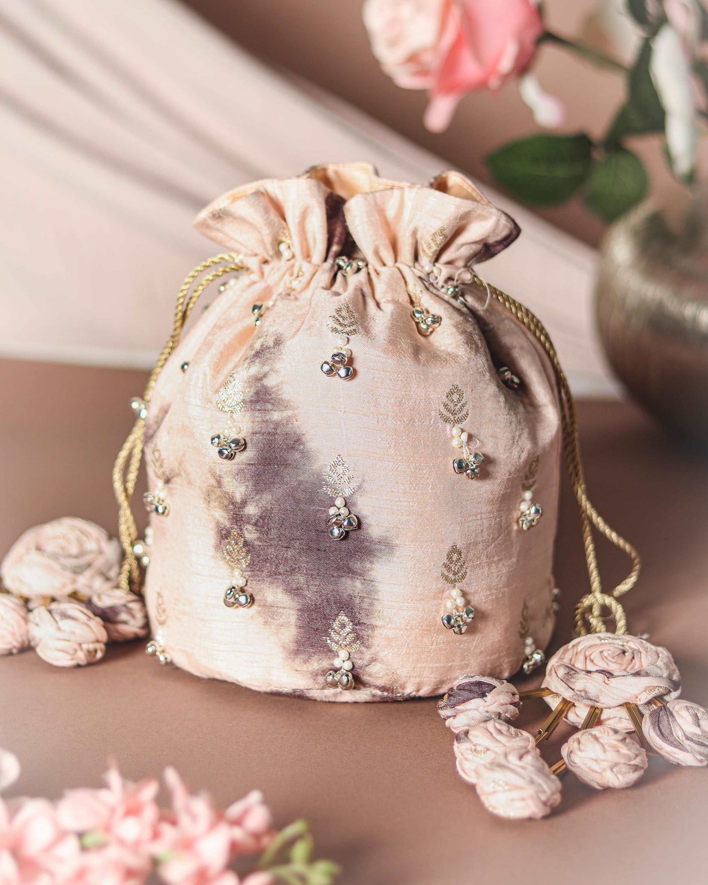 Inspired by the Japanese Shibori tie-dyeing technique, this elegant blush pink potli showcases delicate artistry with a timeless appeal. Self-embossed with intricate zari buta, it is beautifully highlighted with pearls and ghungroos that add a playful shimmer as you walk or dance. Finished with the brandês signature handcrafted flower tassels, this Potli is a must-have for festive celebrations, weddings, and special occasions!