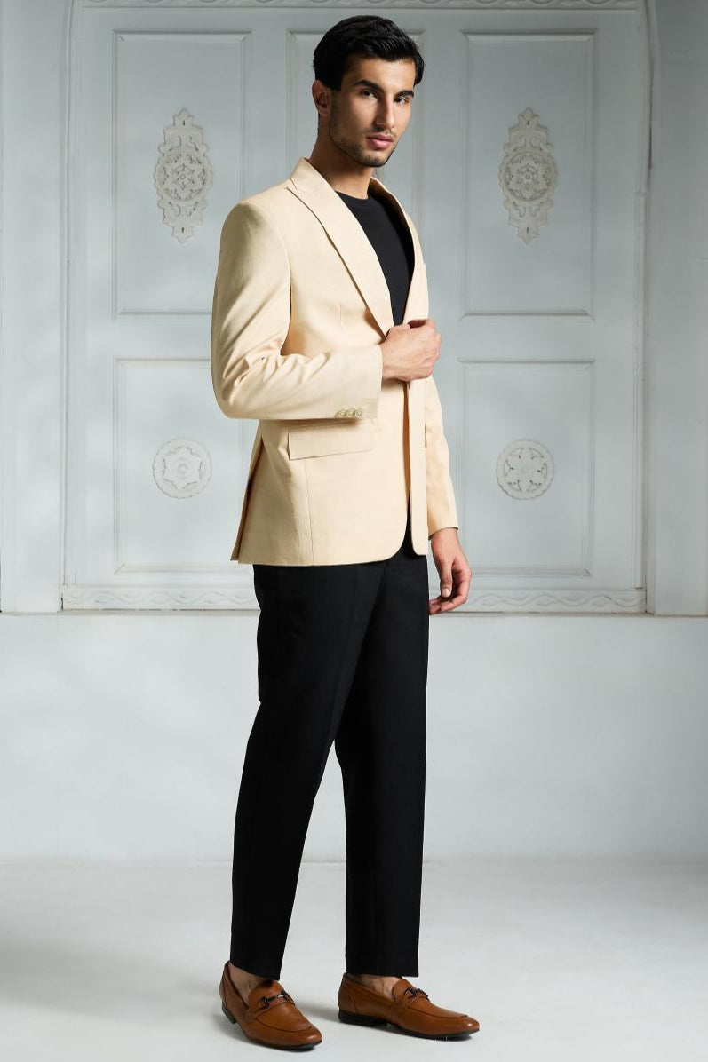 This refined beige solid blazer is a timeless essential, tailored for a sleek, sophisticated look. Designed with a notched lapel, single-button closure, and two front flap pockets, it balances classic structure with contemporary flair. The crepe-lined interior offers a luxurious feel and features two practical inner pockets. Ideal for both formal and semi-formal occasions, this blazer pairs well with tailored trousers. Add a colorful or patterned pocket square to introduce personality and elevate your ensemble with subtle elegance.
