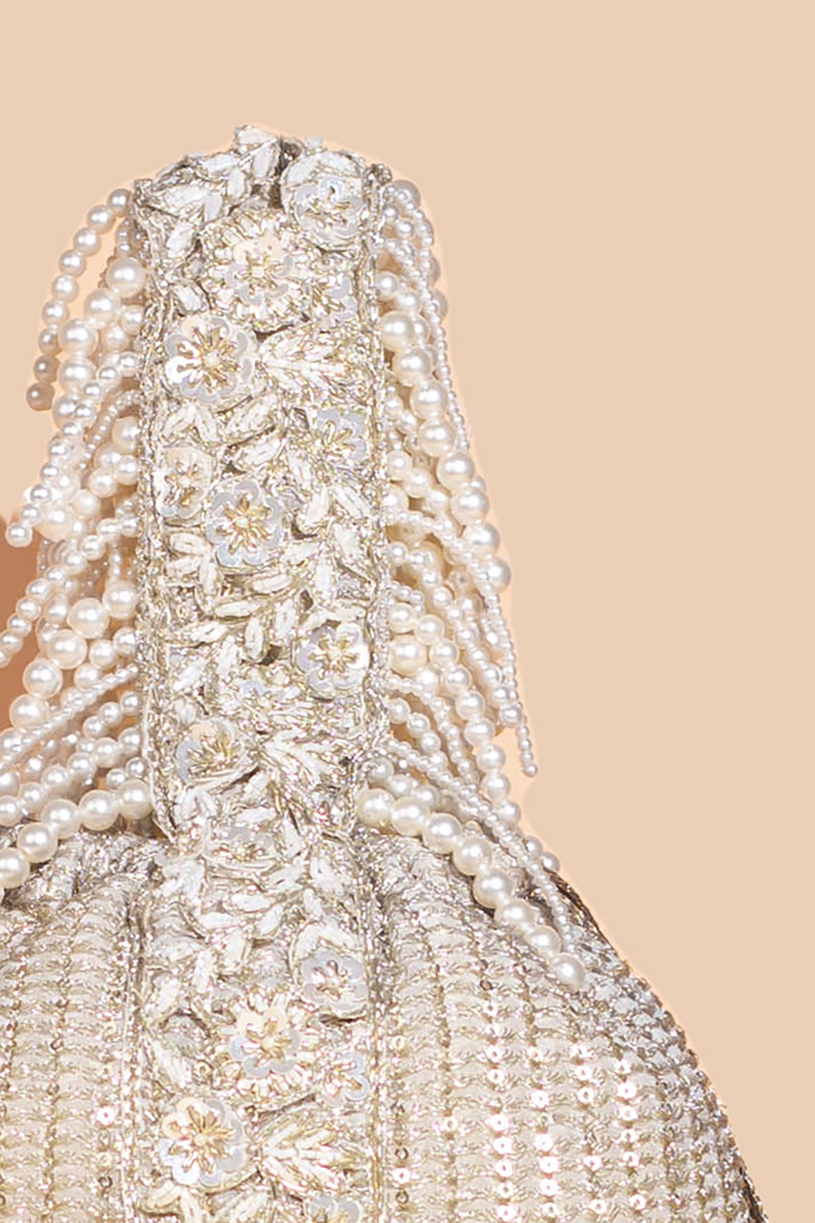 Elevate your festive look with our embroidered potli, crafted from luxurious georgette and poly silk. Featuring intricate net lace, woven gold thread drawstrings, and a hand-embroidered zardosi handle, this piece exudes elegance. Adorned with pearl fringes and tassels, it's the perfect accessory to complement your wedding or celebration ensemble with grace and sophistication.