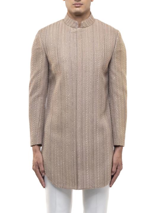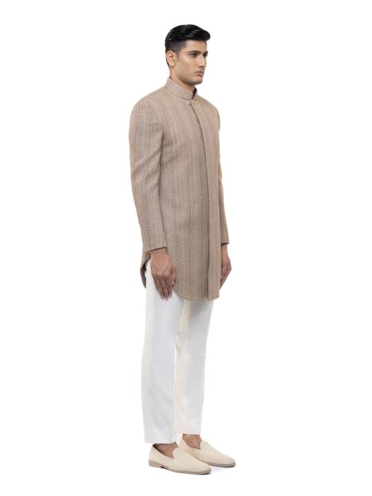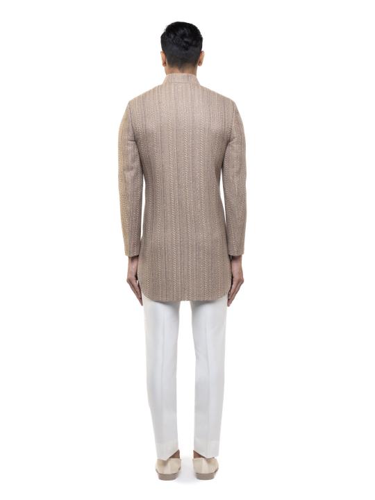 Timeless and breathable, this Beige Cotton Thread Embroidery Sherwani Set combines comfort with classic elegance. Crafted from soft cotton, it features intricate thread embroidery that adds delicate texture and charm. Designed with a stand collar, concealed placket, and Mother of Pearl buttons, the round hem and regular fit ensure a relaxed yet refined silhouette-ideal for daytime weddings and festive celebrations.
