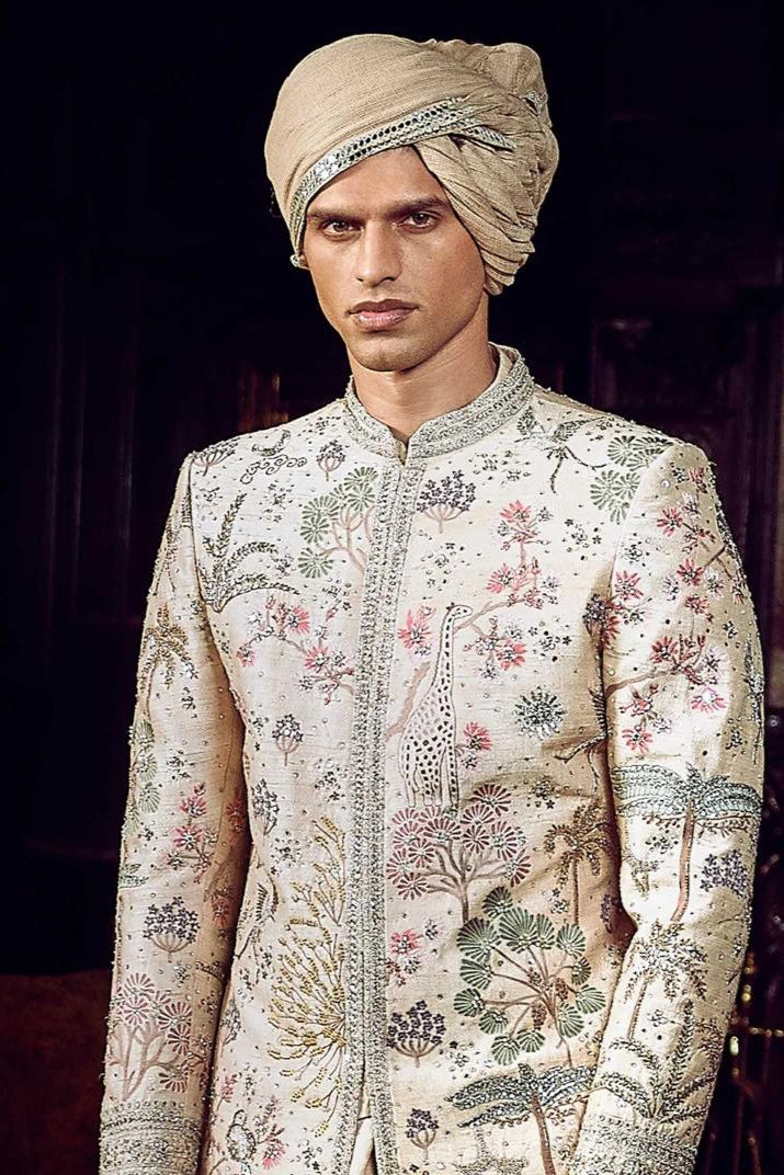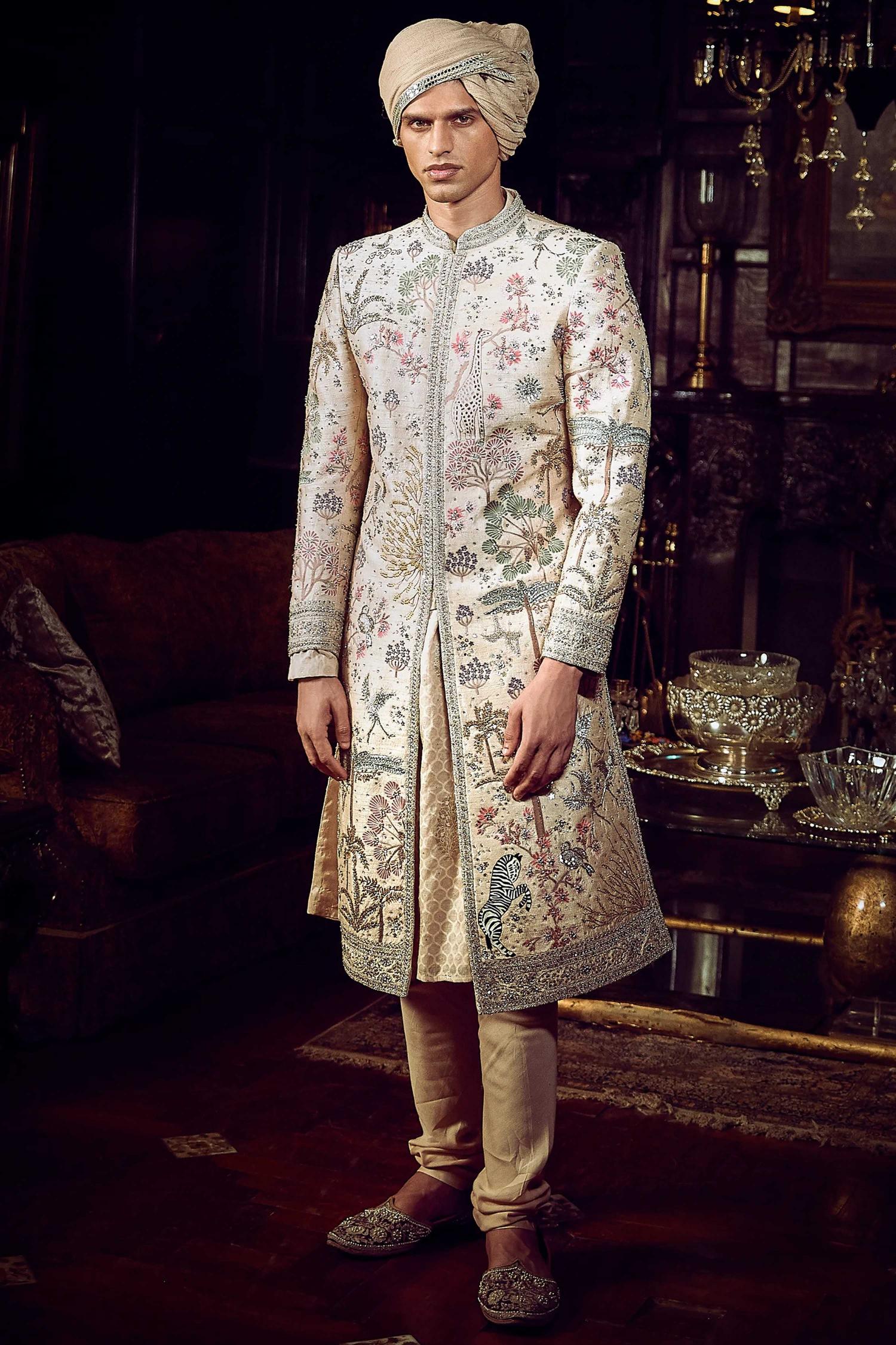 A timeless ode to heritage and refinement, the Beige Vintage Peach Masai Lost in Time Sherwani blends regal tradition with the spirit of adventure. Inspired by the earthy hues of the Masai landscapes and the soft elegance of vintage peach tones, this sherwani is adorned with intricate embroidery and artisanal craftsmanship. The harmonious fusion of muted beige and peach creates a sophisticated yet contemporary aesthetic, perfect for weddings, grand celebrations, and royal soirŽes. Designed for the modern gentleman who cherishes cultural artistry and effortless elegance, this sherwani is a story of legacy, wanderlust, and timeless charm.