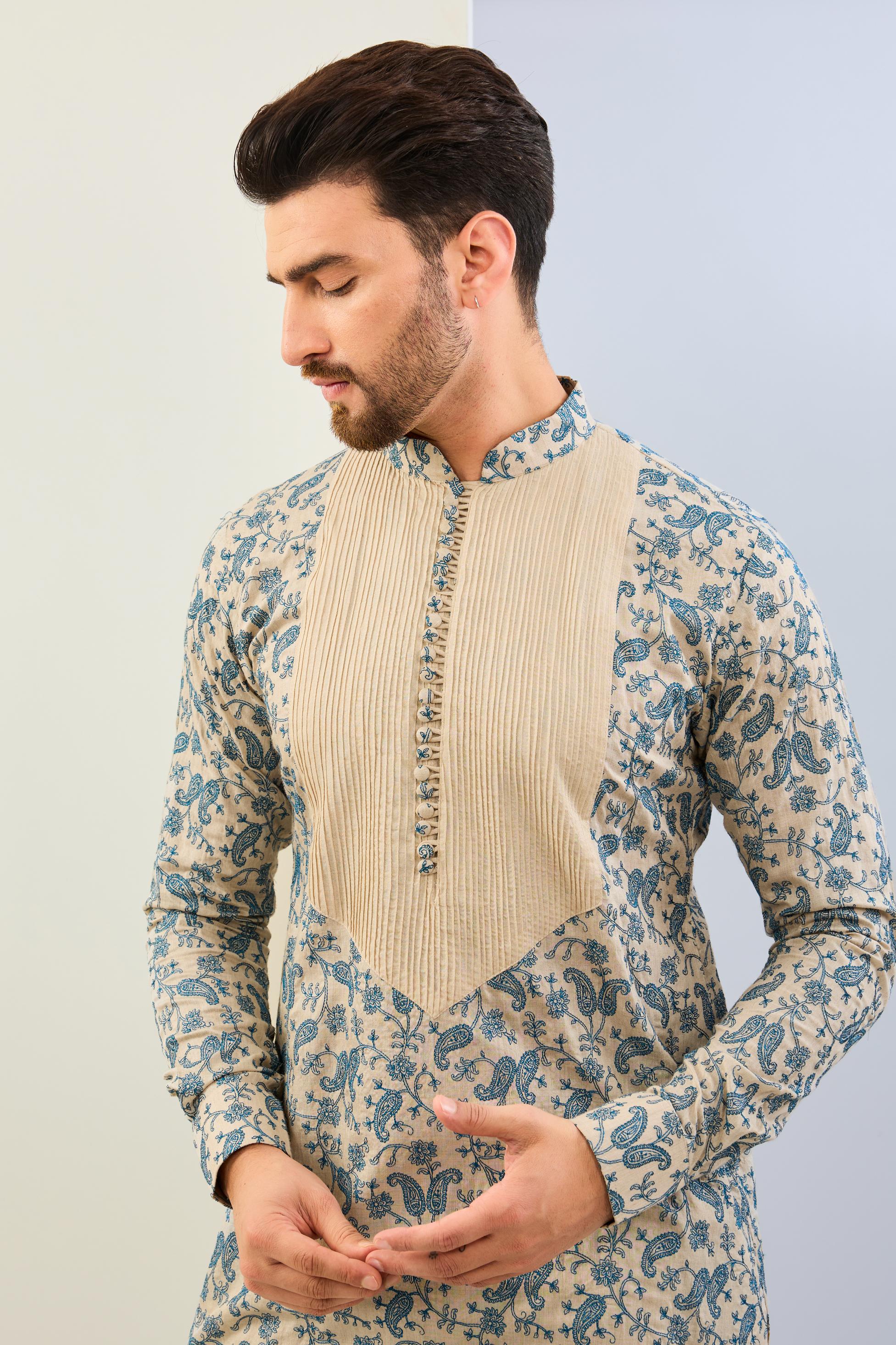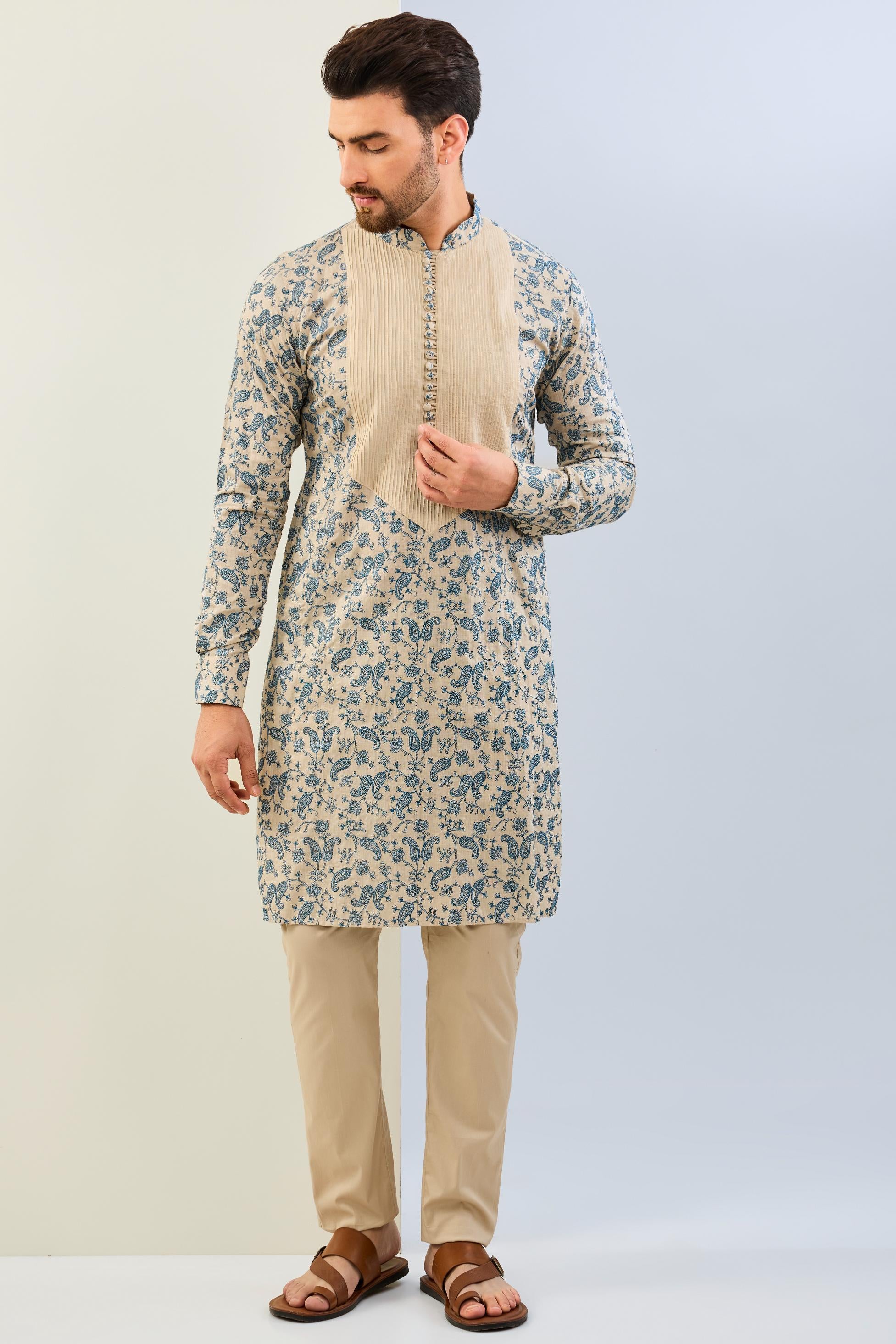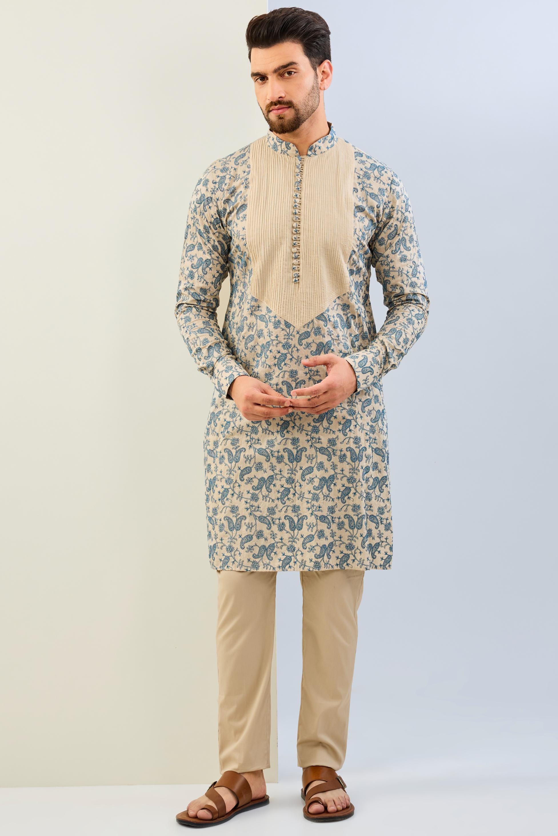 Beige with blue thread embroidered moonga silk kurta with cotton silk pant